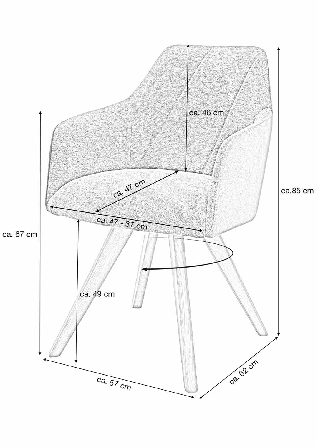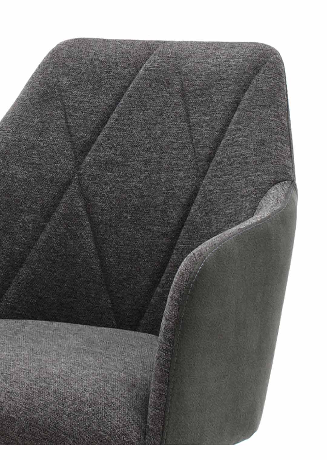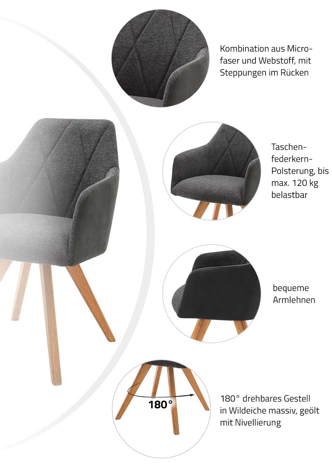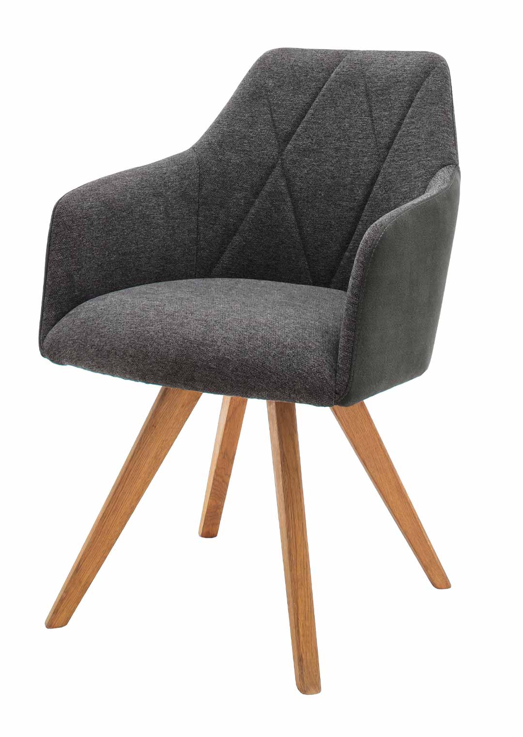 Sitzen Sie bequem beim Speisen mit unserem Modell REDDING!Der Armlehnstuhl REDDING ergänzt Ihren Esszimmertisch in jeder Hinsicht. Das stilvolle Design mit hochwertigem Textil-Bezug in moderner Farbgebung in Anthrazit wird von Rauten-Absteppungen unterstrichen. Während die Sitzflächen mit einem Webstoff bezogen wurden, umüllt ein Microfaserbezug den äußeren Rücken.Einen festen Stand bringen die stabilen Standbeine aus massiver, geölter Wildeiche und runden zudem das elegante Gesamtbild ab. Der Luxus-Komfortsitz mit Taschenfederkern sorgt für einen hohen Sitzkomfort. Die beiden Armlehnen unterstützen Ihre Haltung am Tisch und ermöglichen ein noch angenehmeres Sitzen. Durch die Drehfunktion wird auch das Aufstehen und Hinsetzen erleichtert. Dank der Nivellierung springt der Stuhl nach dem Aufstehen wieder in die Ausgangsposition zurück.Unser Modell REDDING können Sie natürlich nicht nur als Esszimmerstuhl nutzen, als wahrer Allrounder findet er auch in der Lounge Ihres Wohnzimmers oder im Arbeitszimmer einen Platz.Bestellen Sie jetzt bequem von zu Hause aus Ihren neuen Armlehnstuhl oder besuchen Sie uns in einer unserer Filialen. Wir freuen uns auf Sie!Produktdetails: |