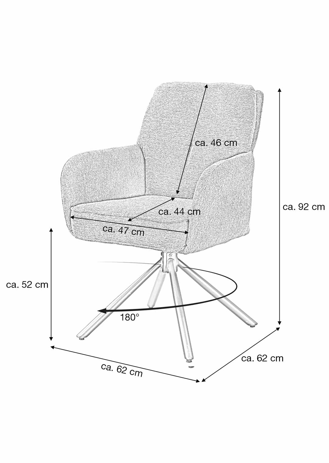Die verbaute Taschenfederkern-Polsterung verwöhnt mit einem luxuriösen Komforterlebnis, ideal bei häufigem Sitzen wie um Ihren Esstisch herum. Die hochwertige Polsterung passt sich dabei perfekt an den Körper an und bietet gleichmäßige Unterstützung für eine optimale Körperhaltung. Der Esszimmerstuhl verfügt über eine praktische 180° Grad Drehfunktion. So können Sie sich Ihren Sitznachbarn zudrehen und dank der Nivellierung springt der Stuhl nach dem Aufstehen wieder in seine Ausgangsposition zurück. Ausdruckstarke Armlehnen fördern eine gelassene Haltung, besonders während längerer Mahlzeiten. Zusätzlich wird mit ihrer passenden Höhe eine Entlastung erzeugt, und der Drehstuhl lässt sich an diesen auch gekonnt greifen, um eine Positionierung um Ihren Tisch zu vereinfachen. Genießen Sie langanhaltenden Komfort und lehnen Sie sich entspannt zurück.