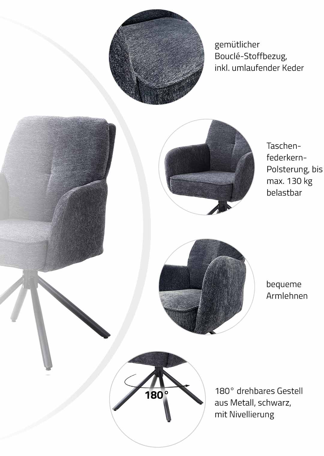 Armlehnstuhl anthrazit Bouclé Drehstuhl Taschenfederkern - JÖRDIS