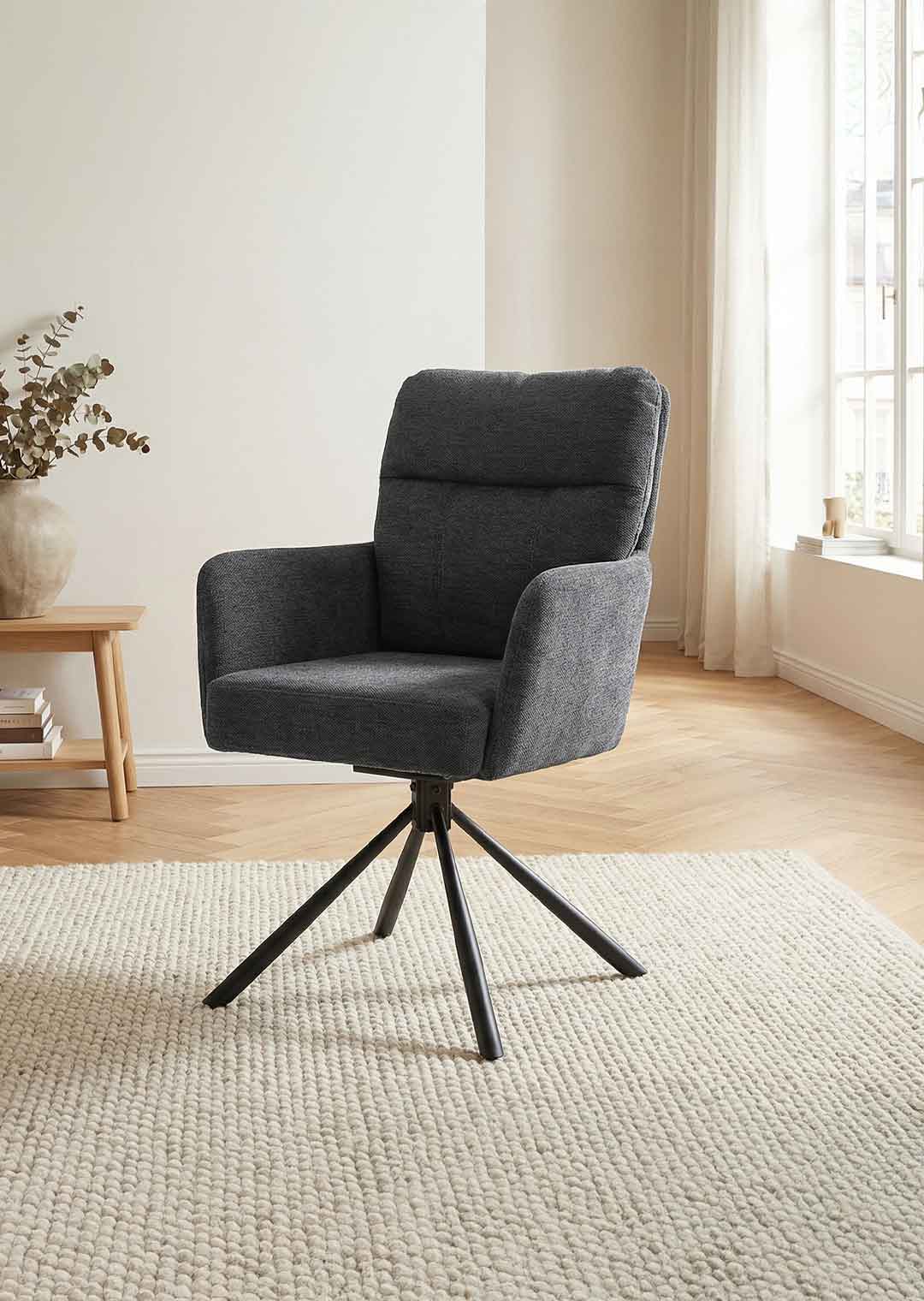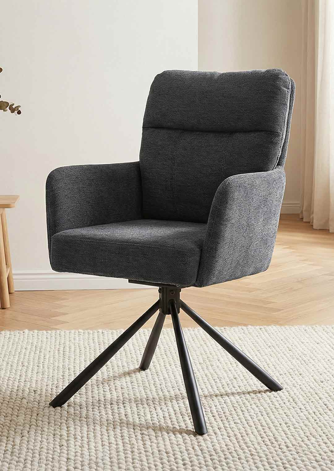 Der Armlehnstuhl UTICA setzt in elegantem Anthrazit Akzente in Ihrem Esszimmer. Der Stoffbezug in Chenille Optik strahlt dabei eine einladende Optik aus, die perfekt zu verschiedenen Einrichtungsstilen passt. Dezente, geradlinige Steppungen im Rücken verleihen dem Stuhl eine interessante Struktur und machen ihn zu einem echten Blickfang. Das runde 4-Fuß-Gestell aus Metall ist in mattem Schwarz lackiert und verläuft konisch, was dem Stuhl gleichzeitig eine filigrane Silhouette und stabilen Halt im Alltag verleiht.
