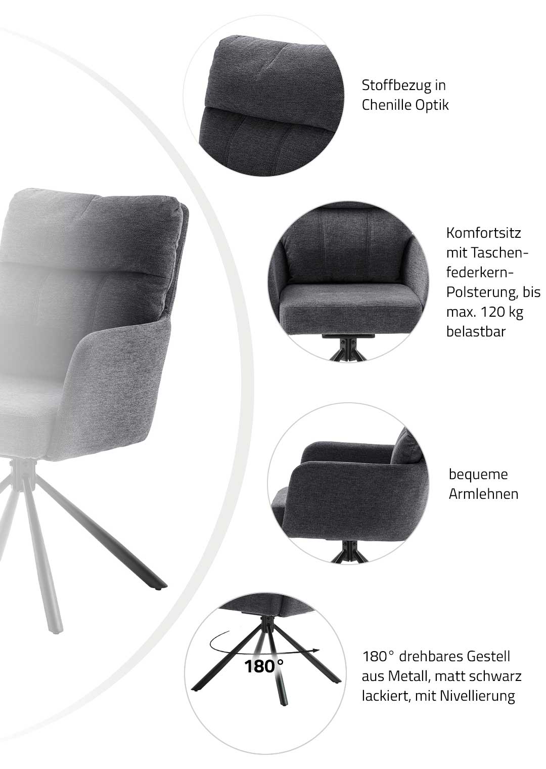 Armlehnstuhl anthrazit Drehstuhl Chenille Optik - UTICA