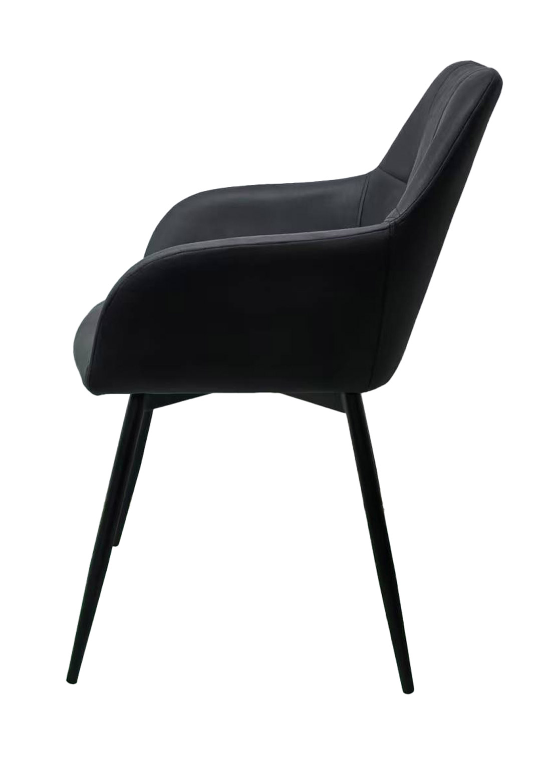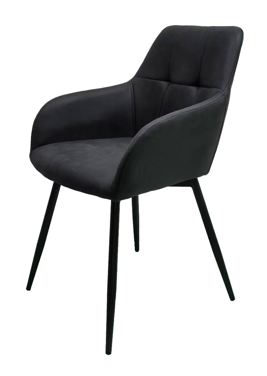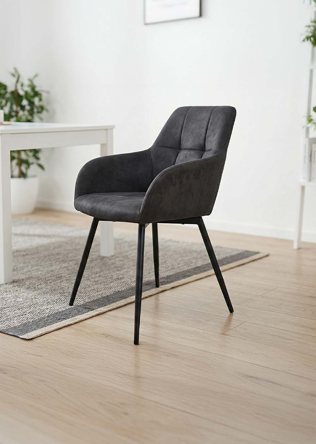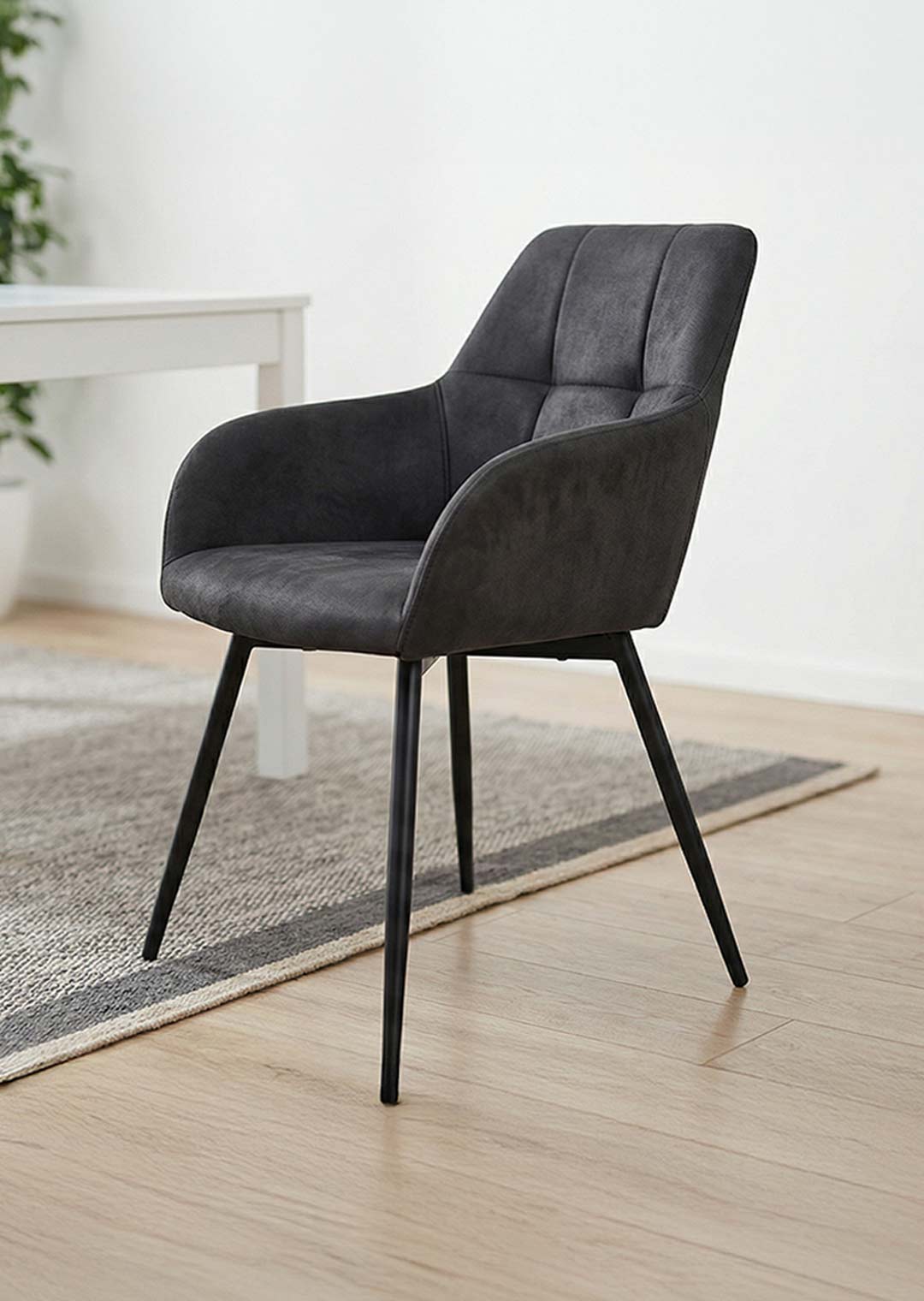 Mit seinem weichen Microfaser-Bezug in tiefem Anthrazit strahlt der Armlehnstuhl AIDEN eine zeitlose Ruhe und moderne Klasse aus. Die markante Steppung im Rückenbereich zieht alle Blicke auf sich und verleiht dem Stuhl eine stilvolle Tiefe. Getragen wird das edle Design von einem schlanken, schwarzen Metallgestell, das für eine moderne Leichtigkeit sorgt. AIDEN vereint auf harmonische Weise elegantes Design mit wohnlicher Gemütlichkeit - perfekt für stilbewusste Essbereiche, die mehr als nur funktional sein wollen.