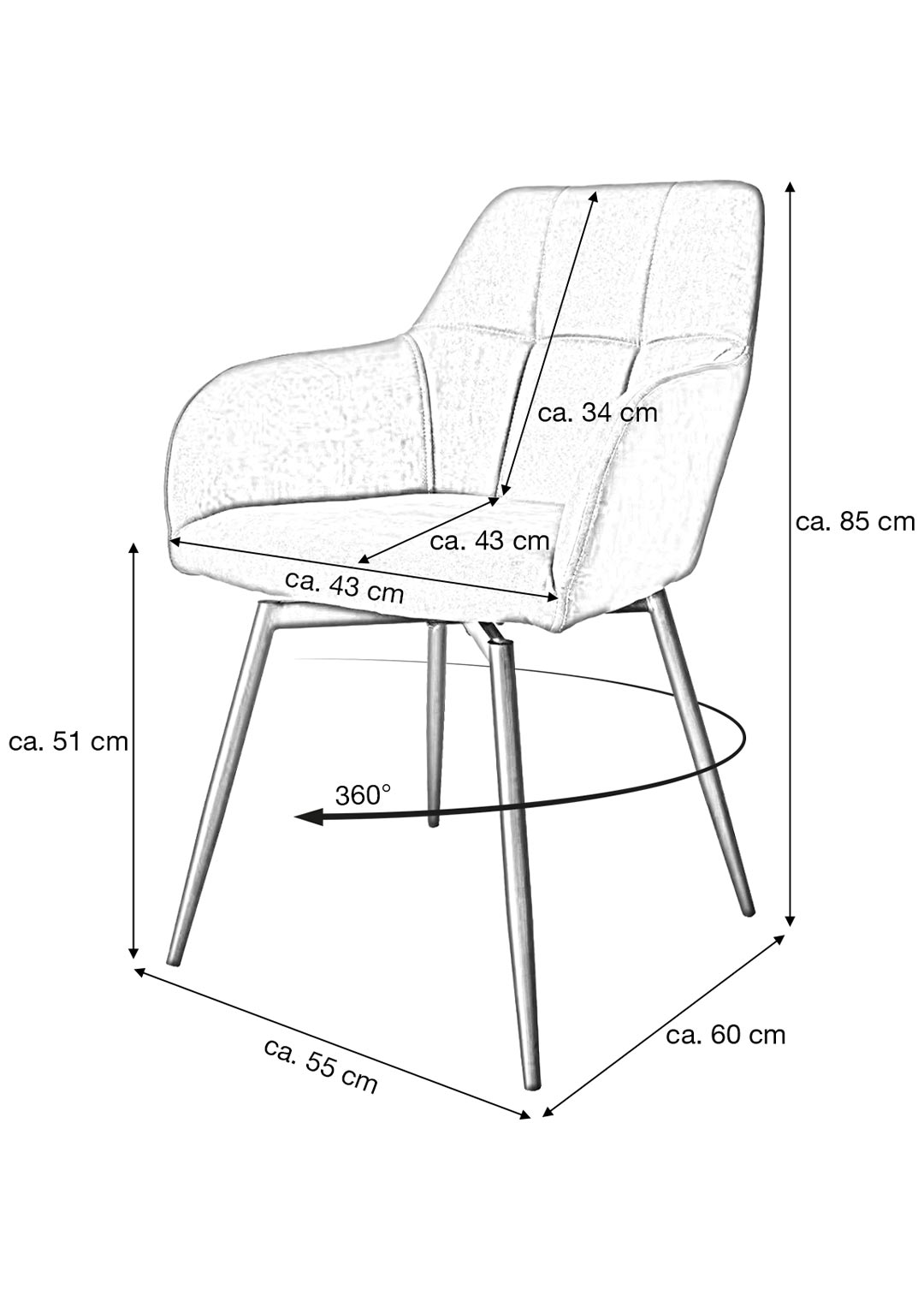 Was das Auge erfreut, wird durch durchdachte Funktionalität vollendet: 2 angenehm geformte Armlehnen bieten optimalen Halt und laden auch zum längeren Verweilen am Esstisch ein. Die weiche Polsterung mit einer Sitzstärke von ca. 70 mm sorgt für spürbaren Komfort - egal ob beim schnellen Mittagessen oder beim langen Dinner. Mit seiner 360° Drehfunktion eröffnet der Drehstuhl AIDEN zudem neue Bewegungsfreiheit und passt sich flexibel jeder Situation an. Dank seiner großzügigen Sitzfläche und einer idealen Sitzhöhe von ca. 51 cm erleben Sie Komfort auf neuem Niveau. AIDEN ist nicht nur ein Stuhl - er ist Ihr neuer Lieblingsplatz im Esszimmer.