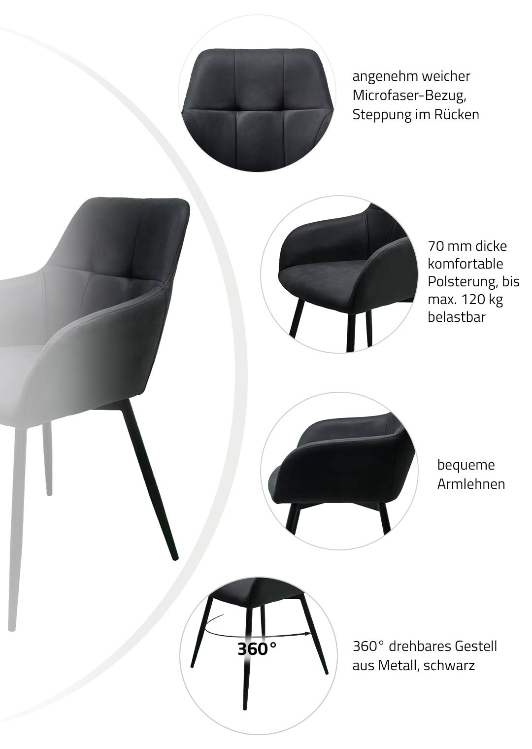 Armlehnstuhl Microfaser anthrazit - 360° Grad drehbar - AIDEN