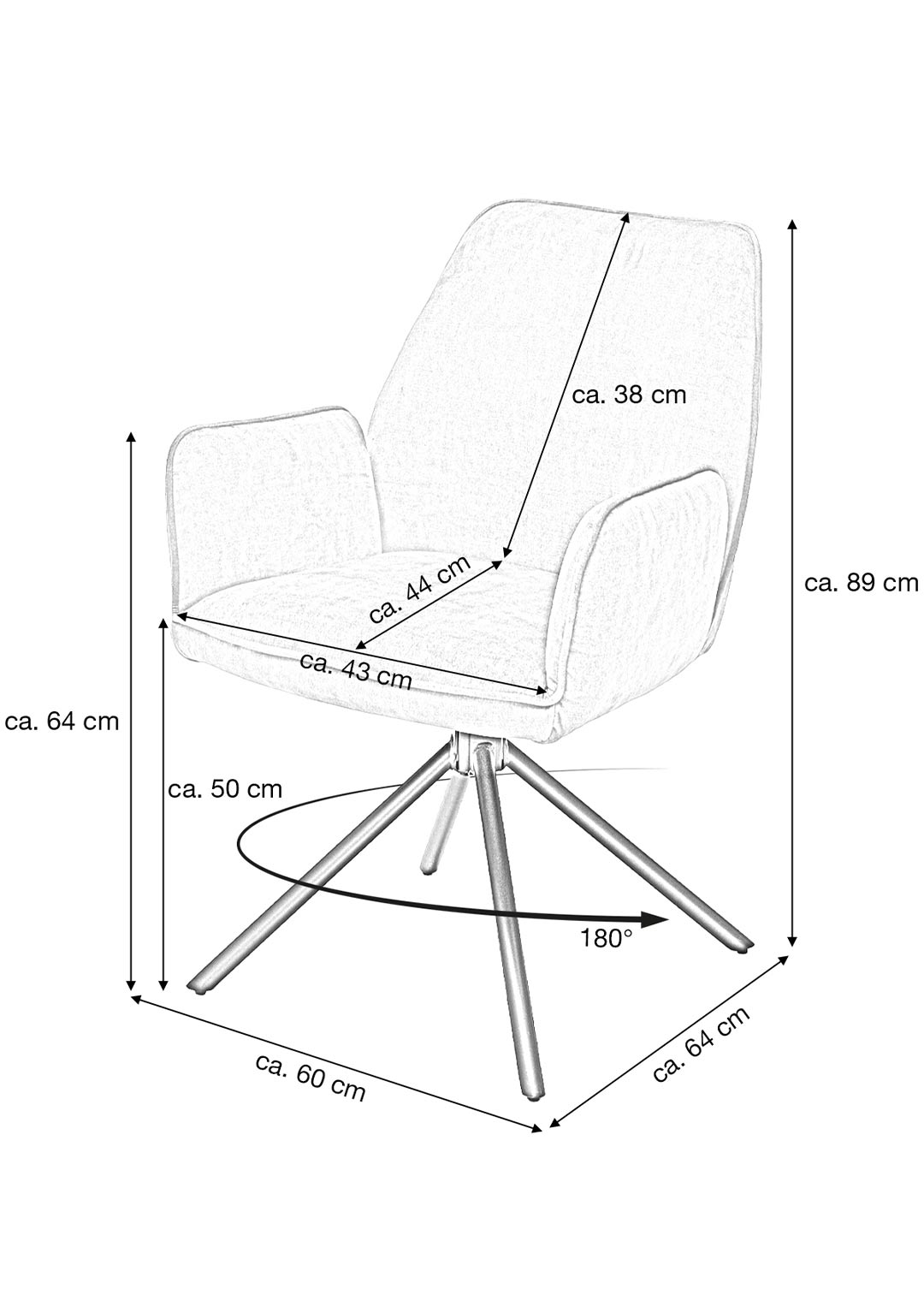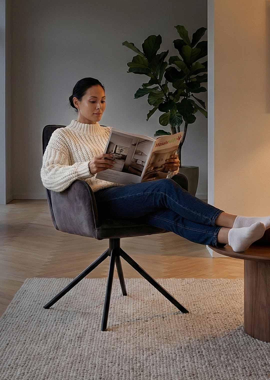Der Armlehnstuhl überzeugt aber nicht nur optisch, sondern auch durch seinen Sitzkomfort. Sitzfläche und Rückenlehne sind mit einer Schaumpolsterung ausgestattet, welche sich angenehm an den Körper anpasst und auch bei längerem Sitzen für Wohlbefinden sorgt. Ergonomisch geformte Armlehnen bieten zusätzlichen Komfort und laden dazu ein, sich entspannt zurückzulehnen. Mit einer Sitzhöhe von etwa ca. 50 cm eignet sich dieser Stuhl ideal für Einsatz am Esstisch oder in der Leseecke. Ein besonderes Highlight ist die 180-Grad-Drehfunktion mit automatischer Nivellierung. Diese Funktion ermöglicht flexibles Bewegen und erlaubt Drehen nach Belieben, ohne an Stabilität einzubüßen. Nach jeder Drehung kehrt Stuhl automatisch in die Ausgangsposition zurück. Dieser Armlehnstuhl vereint Komfort, Stil und Funktionalität in einem Möbelstück.