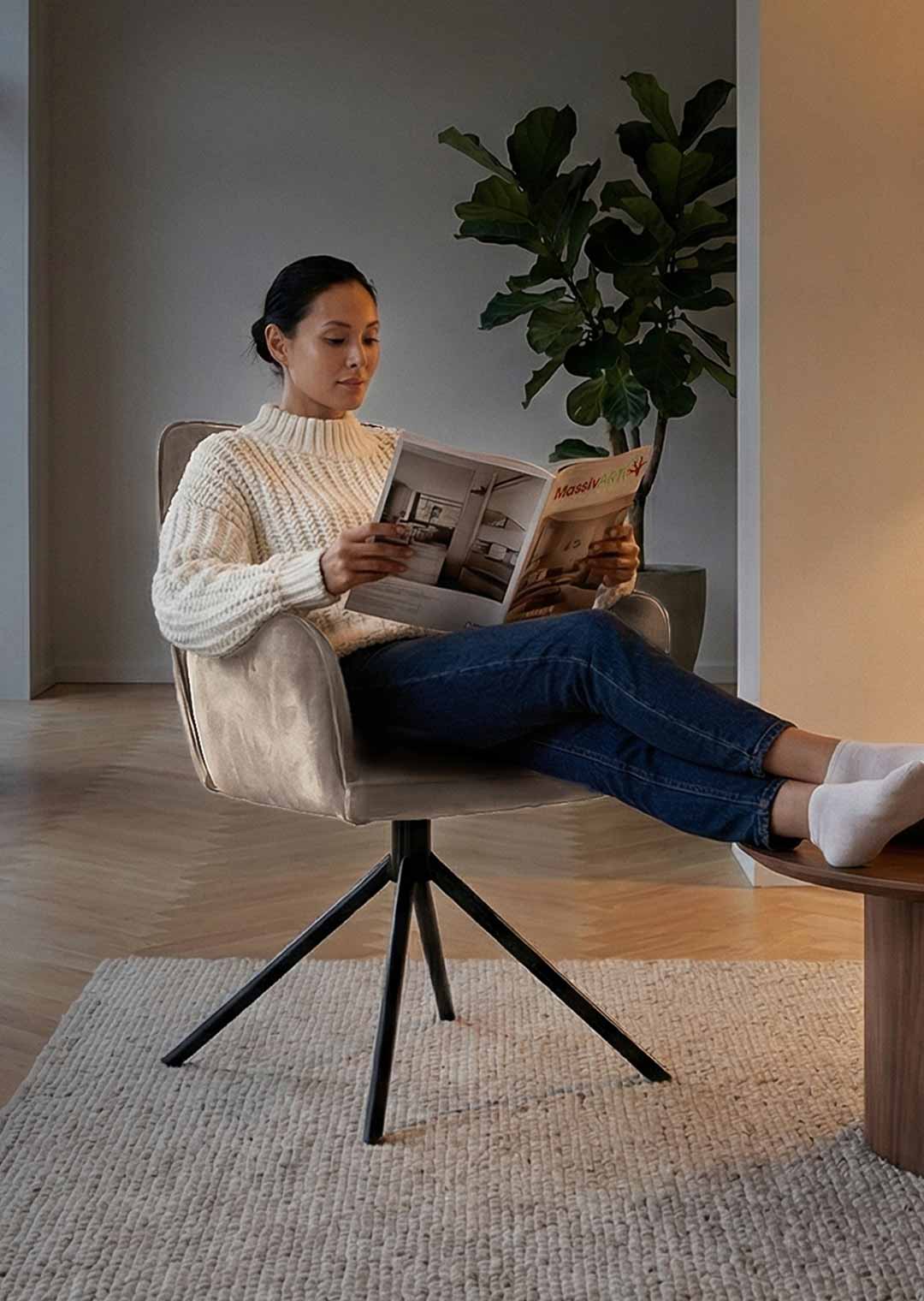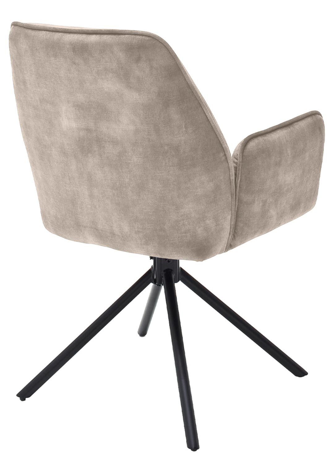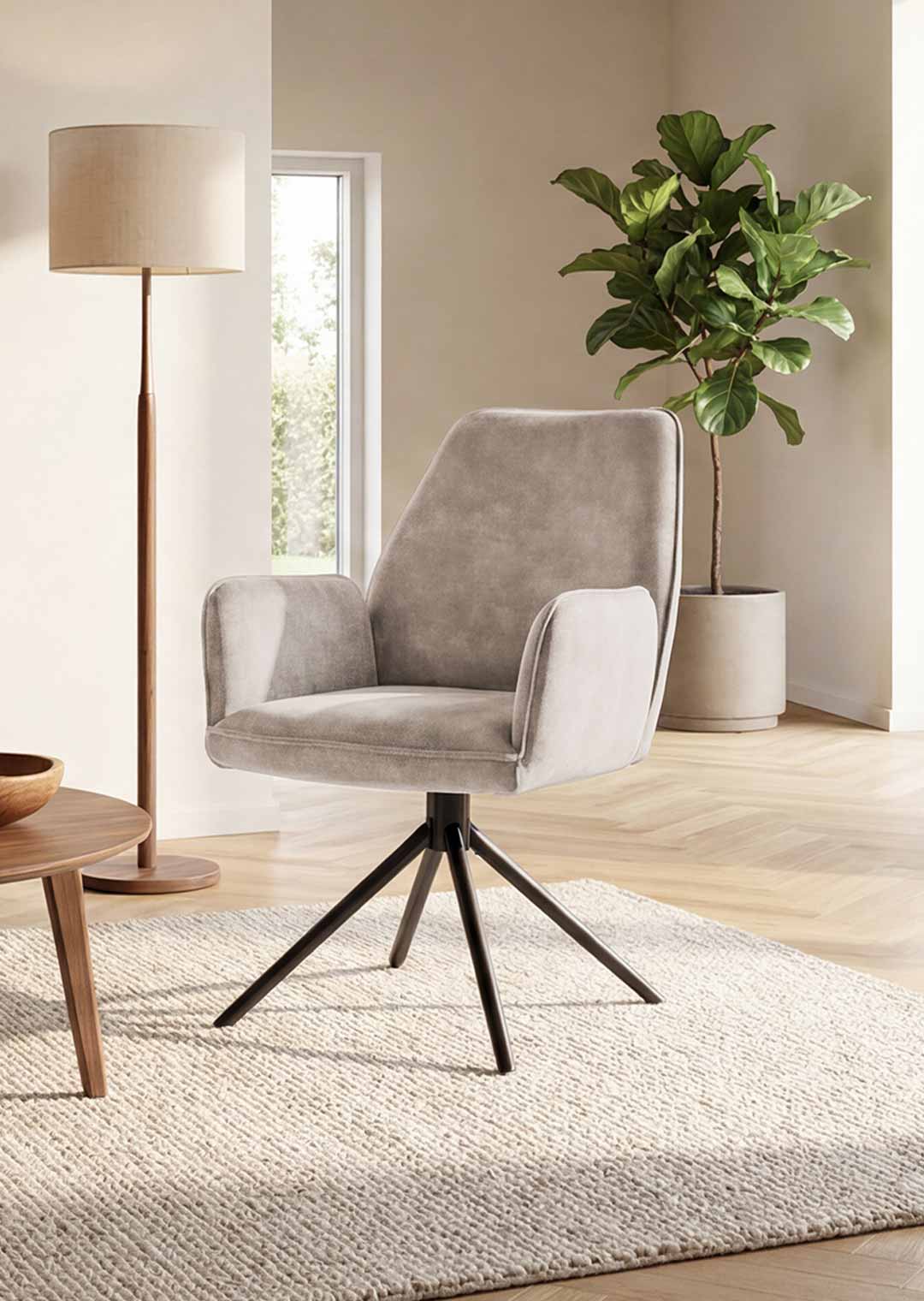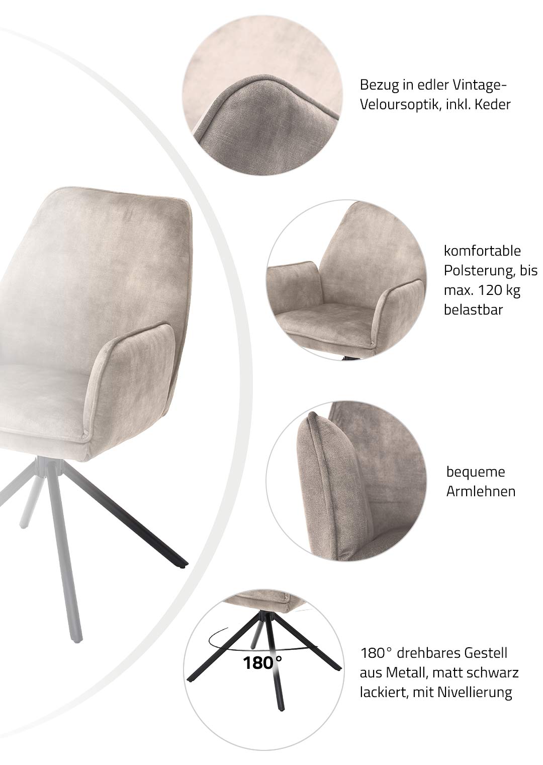 Der Armlehnstuhl überzeugt aber nicht nur optisch, sondern auch durch seinen Sitzkomfort. Sitzfläche und Rückenlehne sind mit einer Schaumpolsterung ausgestattet, welche sich angenehm an den Körper anpasst und auch bei längerem Sitzen für Wohlbefinden sorgt. Ergonomisch geformte Armlehnen bieten zusätzlichen Komfort und laden dazu ein, sich entspannt zurückzulehnen. Mit einer Sitzhöhe von etwa ca. 50 cm eignet sich dieser Stuhl ideal für Einsatz am Esstisch oder in der Leseecke. Ein besonderes Highlight ist die 180-Grad-Drehfunktion mit automatischer Nivellierung. Diese Funktion ermöglicht flexibles Bewegen und erlaubt Drehen nach Belieben, ohne an Stabilität einzubüßen. Nach jeder Drehung kehrt Stuhl automatisch in die Ausgangsposition zurück. Dieser Armlehnstuhl vereint Komfort, Stil und Funktionalität in einem Möbelstück.