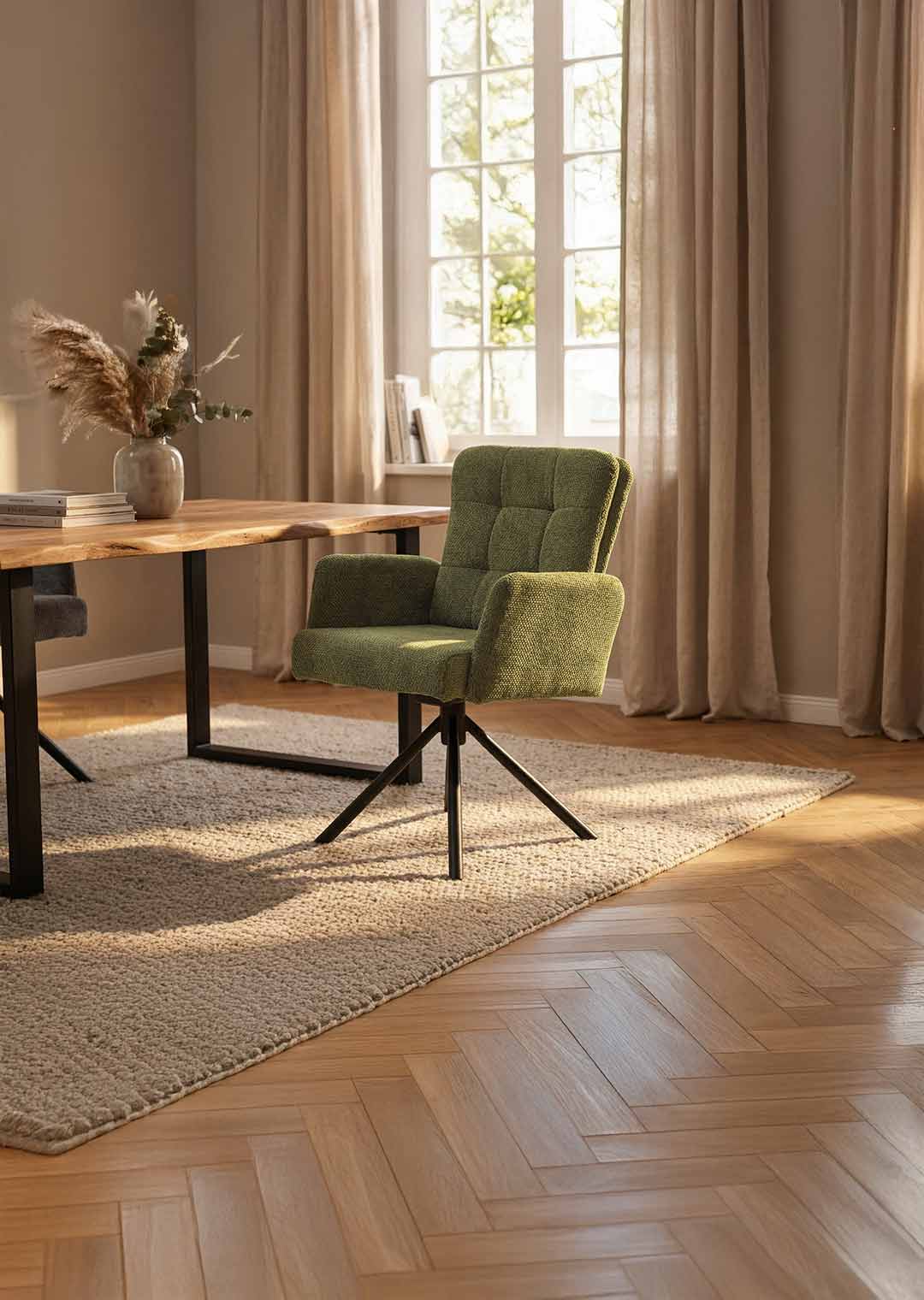 Unser Armlehnstuhl HEDIA erscheint in einem hochwertigen Chenille-Bezug in Grün. Dieser überzeugt durch seine besonders weiche Haptik und lädt zum Verweilen ein. Die Rückenlehne ist mit einem fest vernähten, aufgesetzten Kissen versehen, das dem Stuhl eine besondere Gemütlichkeit verleiht. Die auffällige Steppung im Kissen betont diese Gemütlichkeit noch zusätzlich. Für einen festen Stand im Alltag sorgt das pulverbeschichtete 4-Fuß-Gestell aus Metall in mattem Schwarz. Es verleiht dem Gesamtbild dieses Esszimmerstuhls eine ruhige, moderne Optik, sodass er sich harmonisch in klassische, wie zeitgemäße Einrichtungsstile einfügt.