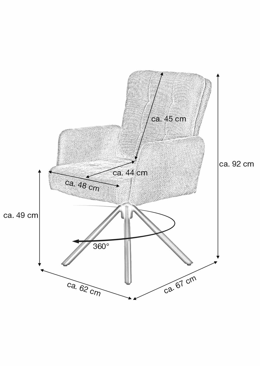 Bei HEDIA trifft stille Eleganz auf fühlbaren Komfort. Der Armlehnstuhl bietet dank Taschenfederkern-Polsterung einen hohen Sitzkomfort im täglichen Gebrauch. Die hohen, ergonomisch gestalteten Armlehnen laden dazu ein, die Arme bequem abzulegen. Ein weiteres Highlight, das dieser Stuhl zu bieten hat, ist die integrierte Wippfunktion. Diese unterstützt eine leichte, natürliche Bewegung beim Sitzen und erhöht die Ergonomie. Der Sitz des Drehstuhls ist um 360 Grad drehbar, was für Bewegungsfreiheit am Esstisch sorgt. Und ausgestattet mit einer Nivellierung kehrt der Stuhl nach dem Aufstehen automatischen und zuverlässig in seine Ausgangsposition zurück. So ist ein ordentliches, aufgeräumtes Gesamtbild im Essbereich stets garantiert.
