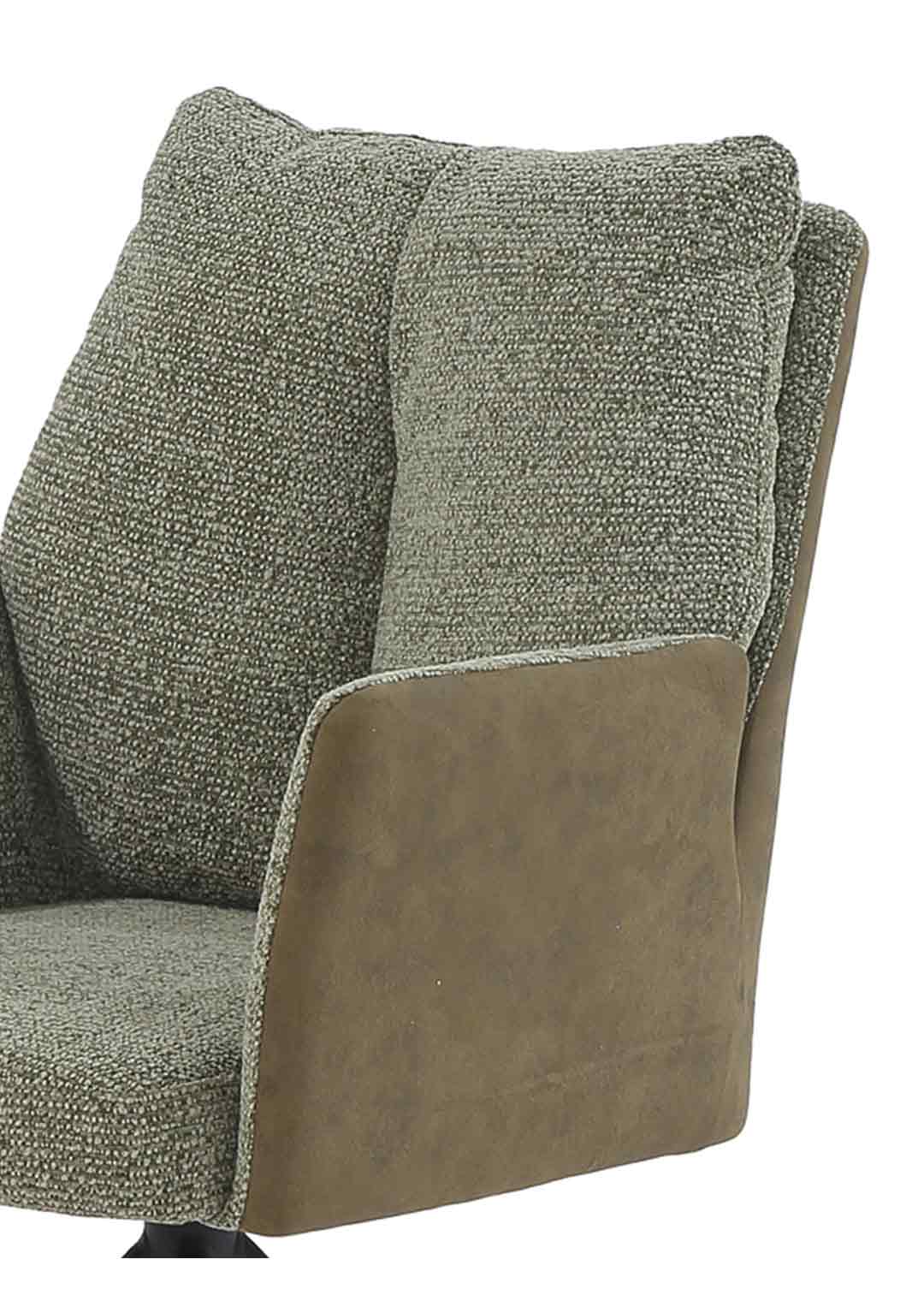 Unser Esszimmerstuhl SHELBY vereint modernes Design und komfortable Funktionalität in einem. Der Webstoff-Bezug in Grün im Inneren des Armlehnstuhls hat eine angenehme Haptik und Oberflächenstruktur, während das Äußere mit einem weichen Microfaser-Bezug in grüner Vintage Optik dem Esszimmerstuhl eine elegante Erscheinung verleiht. Lehnen Sie sich zurück und genießen Sie entspannte Momente am Esstisch. Ein fest vernähtes Kissen im Rücken sorgt für ein besonders bequemes Sitzgefühl. Sicher und zuverlässig getragen wird der Armlehnstuhl SHELBY von einem schwarzen Metallgestell, das ihm gleichzeitig eine moderne Leichtigkeit verleiht.