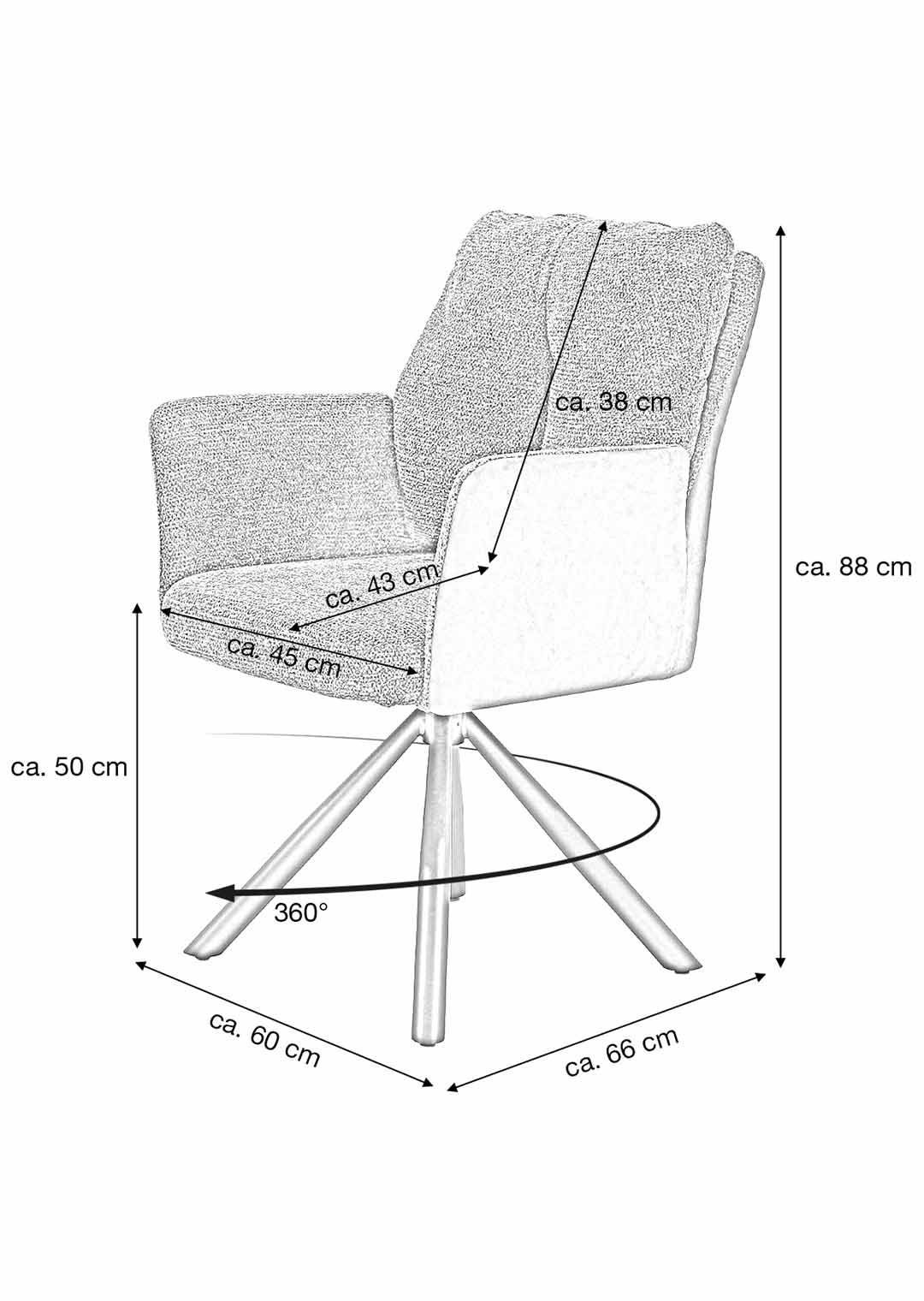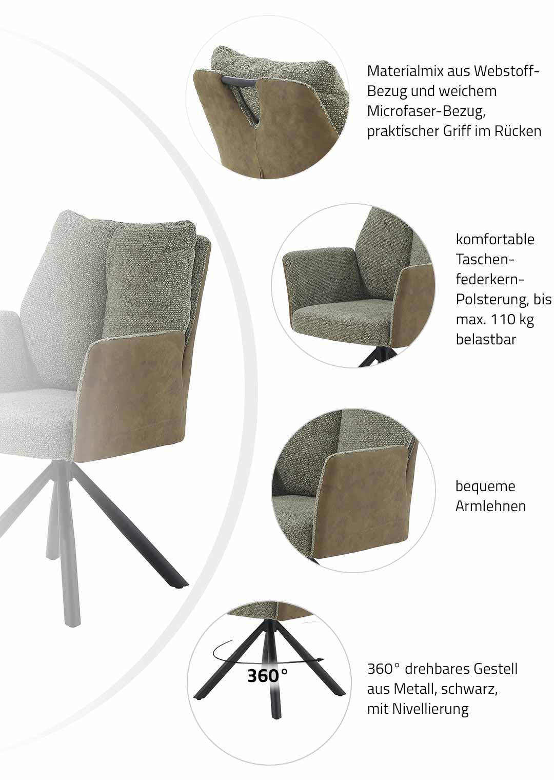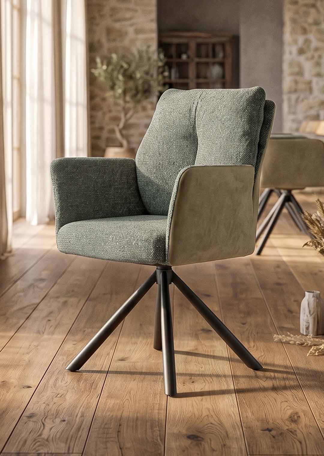 Ausgestattet mit Taschenfederkern-Polsterung sitzen Sie auf dem Esszimmerstuhl komfortabel und bequem - auch bei längeren Abendessen mit Freunden und Familie. Die hochwertige Polsterung passt sich dabei perfekt an den Körper an und bietet gleichmäßige Unterstützung für eine optimale Körperhaltung. Ihre Arme können Sie auf den hohen Armlehnen ablegen und bequem ausruhen. Der Drehstuhl ermöglicht zudem anregende Gespräche mit dem Sitznachbarn, indem er sich problemlos um 360 Grad drehen lässt. Und dank Nivellierung kehrt der Sitz nach dem Aufstehen automatisch wieder in seine Ausgangsposition zurück. So herrscht stets Ordnung am Esstisch. Zu guter Letzt erleichtert ein praktischer Griff im Rücken das Bewegen des Armlehnstuhls am Esstisch, sodass Sie diesen jederzeit mühelos neu platzieren können. SHELBY ist ein Stuhl, der rundum begeistert und Ihr Zuhause ein Stück komfortabler macht.
