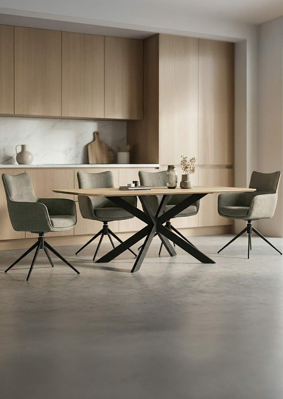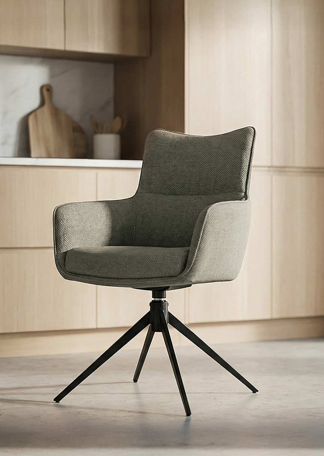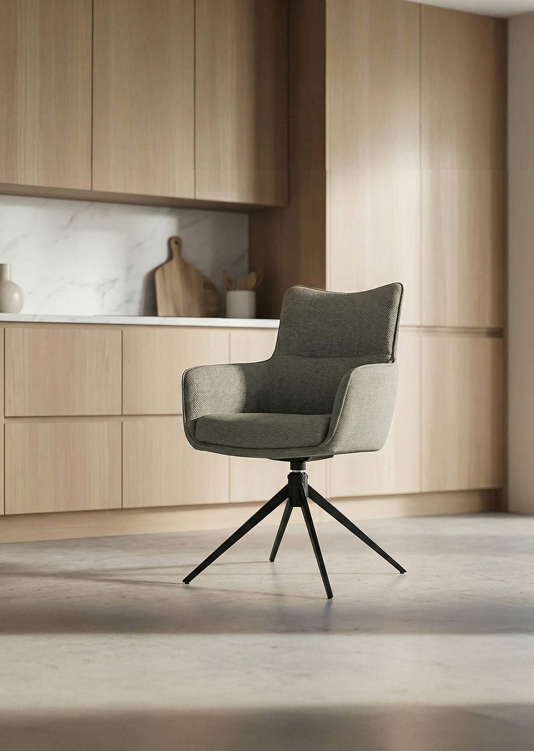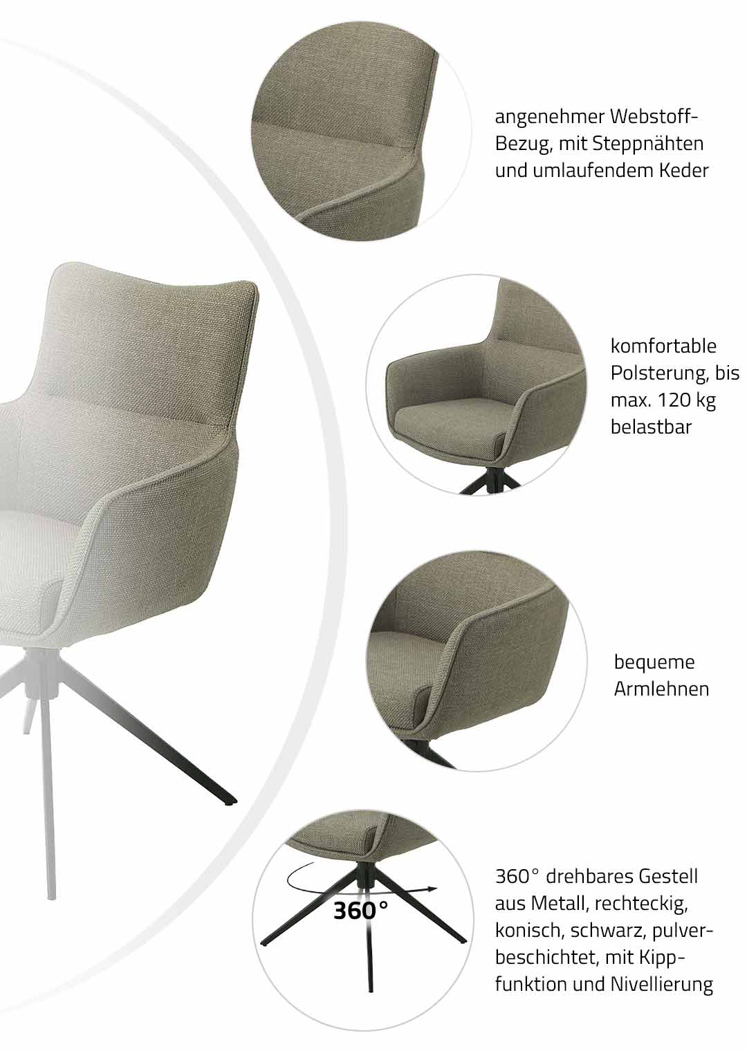 Bequem sitzen war noch nie so elegant wie mit dem Armlehnstuhl LIMA! Der Armlehnstuhl LIMA vereint modernes Design, hohen Sitzkomfort und exzellente Verarbeitung zu einem stilvollen Highlight für Ihr Zuhause. Der hochwertige Webstoff in Schlamm verleiht dem Stuhl eine elegante, zeitlose Optik, die sich harmonisch in verschiedenste Wohnstile einfügt - ob im Esszimmer, Wohnzimmer oder Büro. Das Metallgestell in rechteckig-konischer Form mit schwarzer Pulverbeschichtung sorgt für Stabilität und eine klare, moderne Linienführung. Feine Steppnähte und ein umlaufender Keder unterstreichen die hochwertige Verarbeitung und setzen zugleich dekorative Akzente. Für zusätzlichen Komfort sorgt die integrierte Kippfunktion, die sanfte Bewegungen ermöglicht und ein besonders angenehmes Sitzgefühl schafft - ideal für lange Abende am Esstisch oder entspannte Gespräche mit Familie und Freunden. Ein besonderes Highlight ist die 360-Grad-Drehfunktion. Mit einer Sitzhöhe von ca. 48 cm passt der Armlehnstuhl LIMA perfekt zu gängigen Esstischen und bietet eine bequeme, ergonomische Sitzposition. Der Armlehnstuhl LIMA überzeugt durch sein ausgewogenes Zusammenspiel von Stil, Qualität und Komfort. Ein moderner Stuhl, der nicht nur durch sein Design, sondern auch durch seine Alltagstauglichkeit begeistert - ein echtes Statement für jedes Zuhause.Bestellen Sie bequem online oder lassen Sie sich telefonisch von uns beraten.Ihr neuer Armlehnstuhl wartet auf Sie!Produktdetails: |