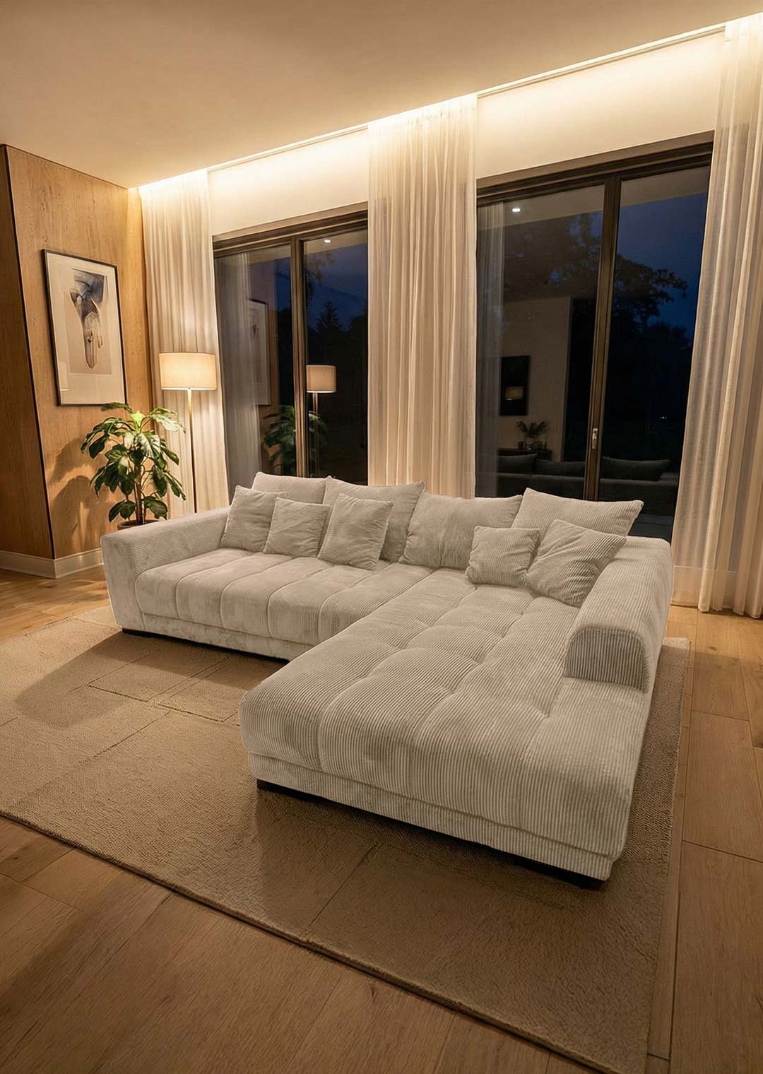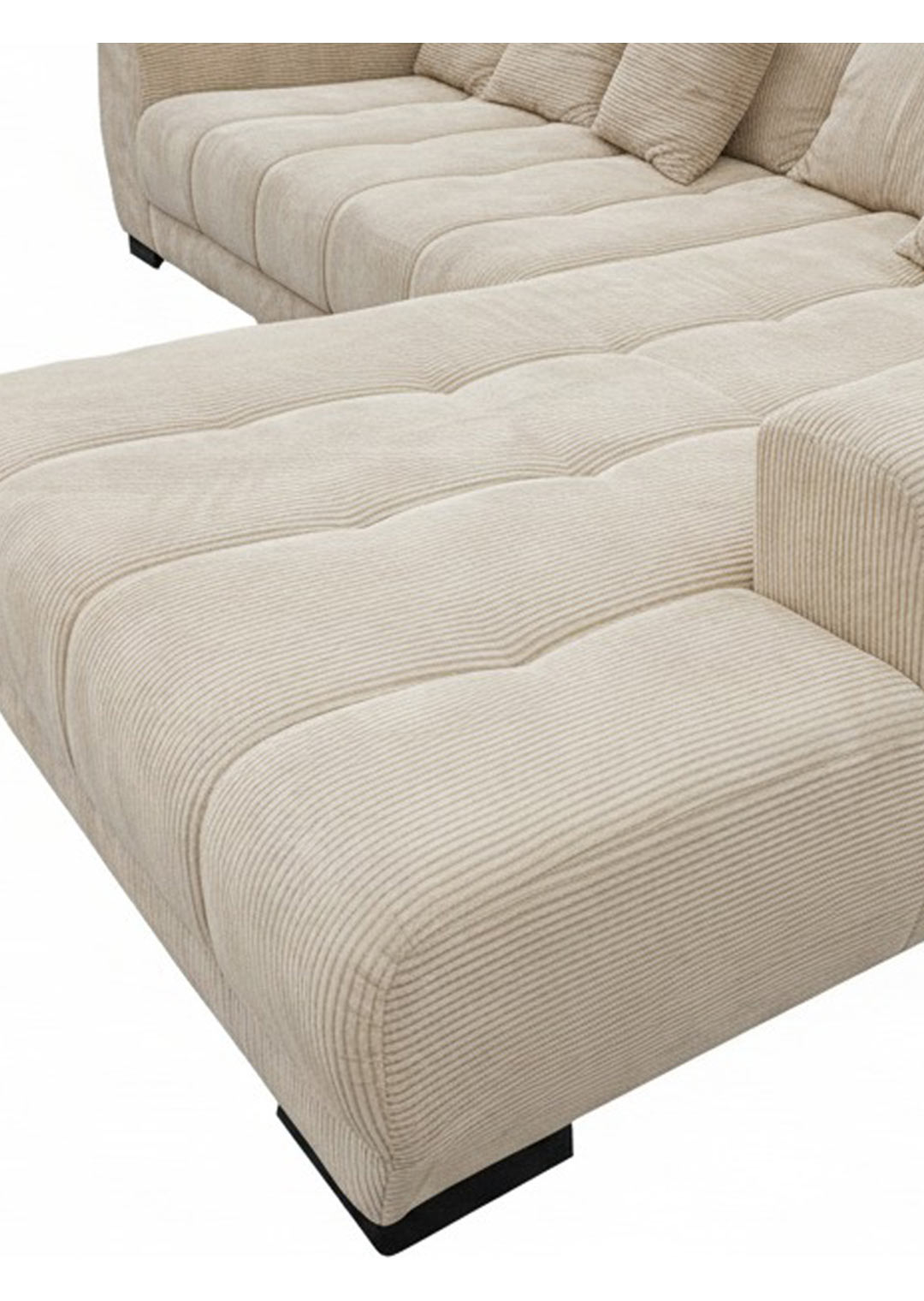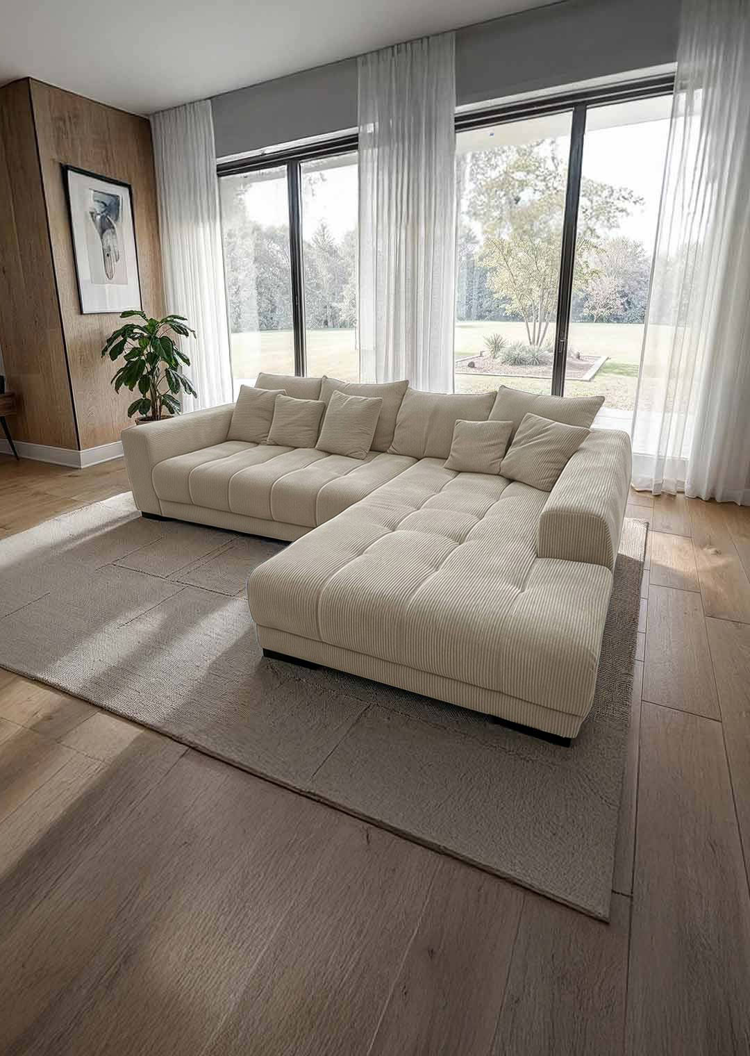 Unsere Ecksofa ARTEMIS in elegantem Cordstoff in Beige ist nicht nur ein Blickfang, sondern auch eine Einladung zum Verweilen und Entspannen. Der Cordstoff verleiht dem Sofa nicht nur eine trendige Note, sondern ist auch herrlich angenehm auf der Haut. Sie möchten Ihr neues Möbel mittig im Raum präsentieren? Kein Problem dank des echt bezogenen Rückens macht unser Ecksofa in jeder Position eine gute Figur. Unterstrichen wird das angesagte Design durch die schwarzen Füße.