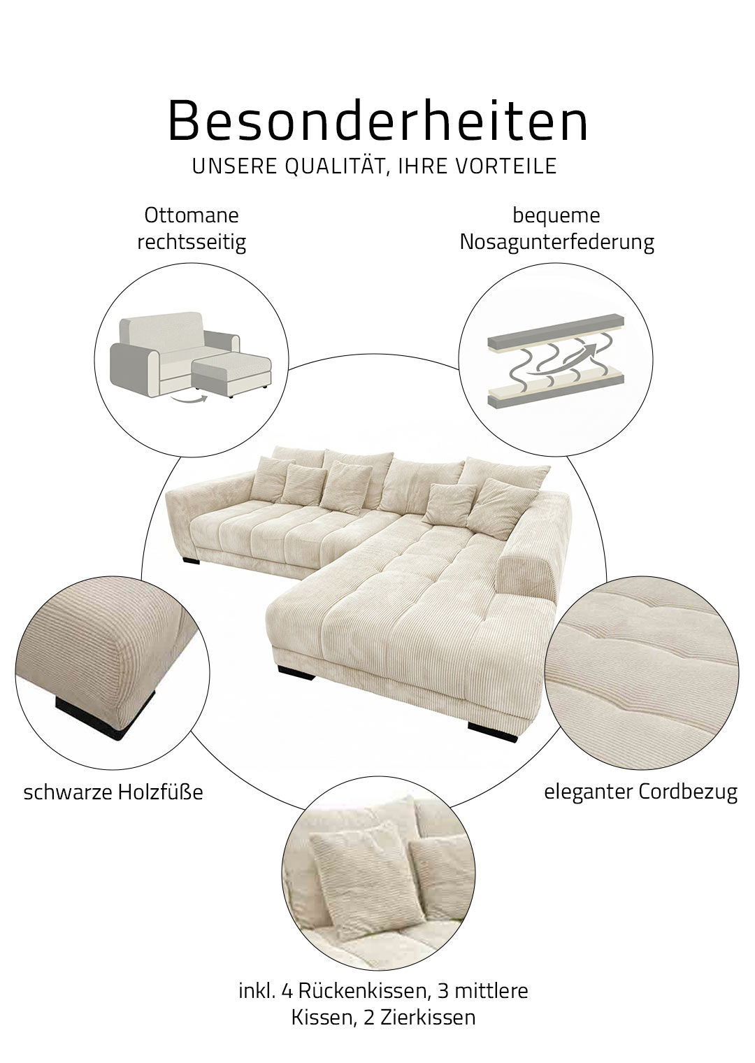 | Bestandteile | 1 x 2-Sitzer mit Armlehne links, 1 x Ottomane mit Armlehne rechts, 4 Rückenkissen, 3 mittlere Kissen, 2 Zierkissen, Holzfüße schwarz lackiert |