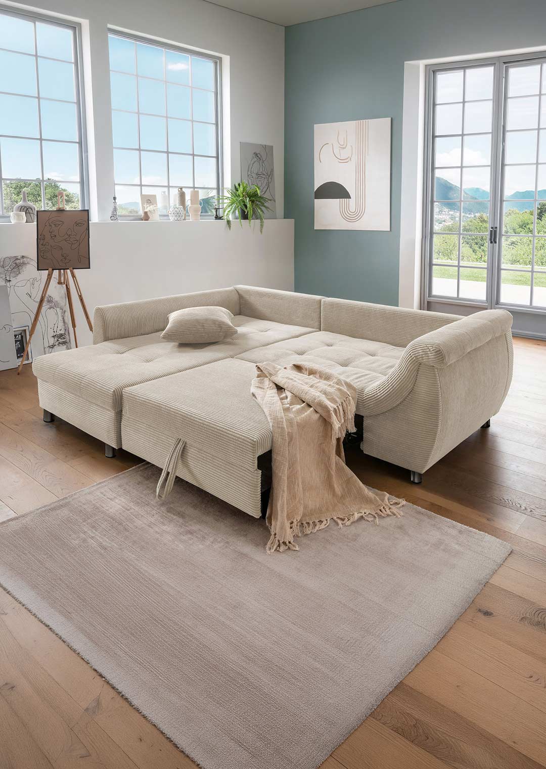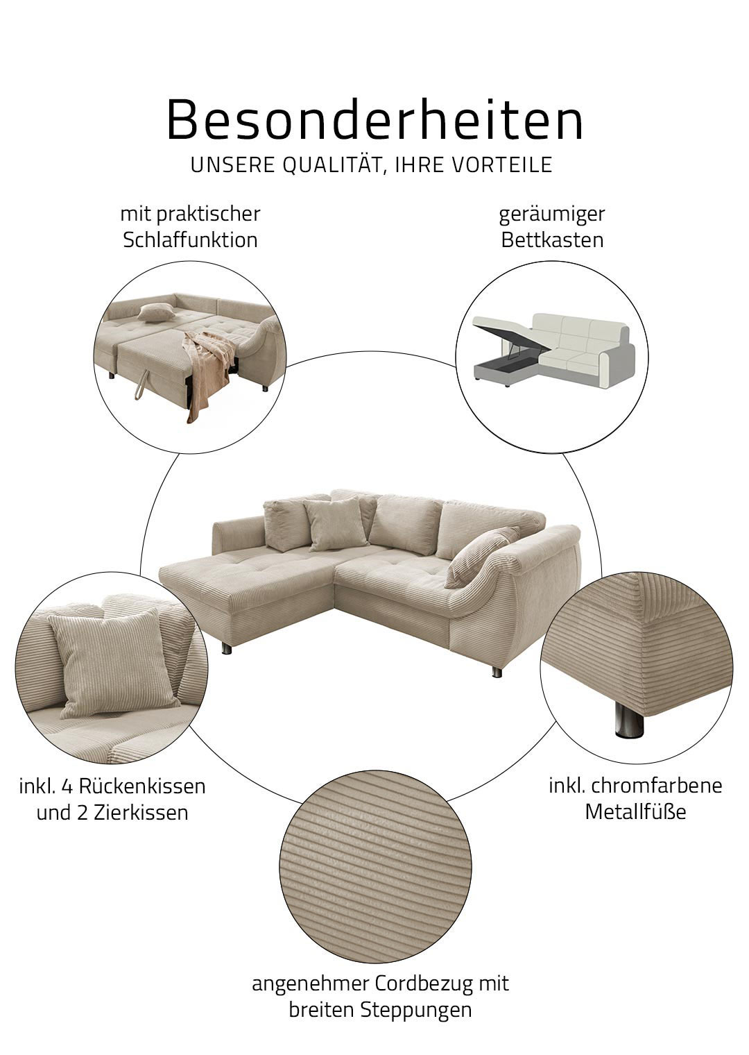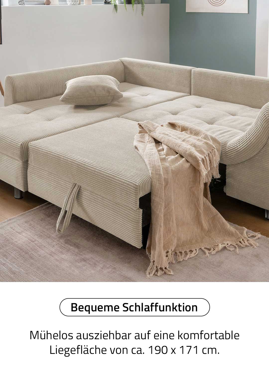 Ecksofa Cord beige Schlaffunktion Bettkasten OT links - LUNARO