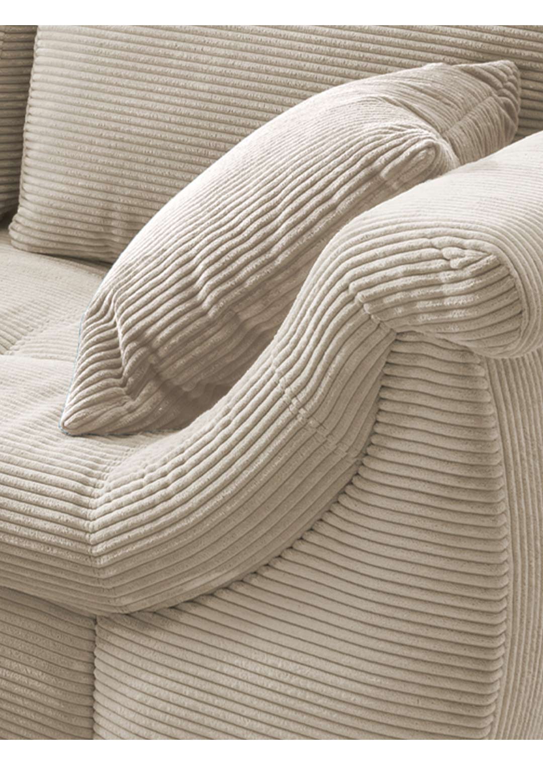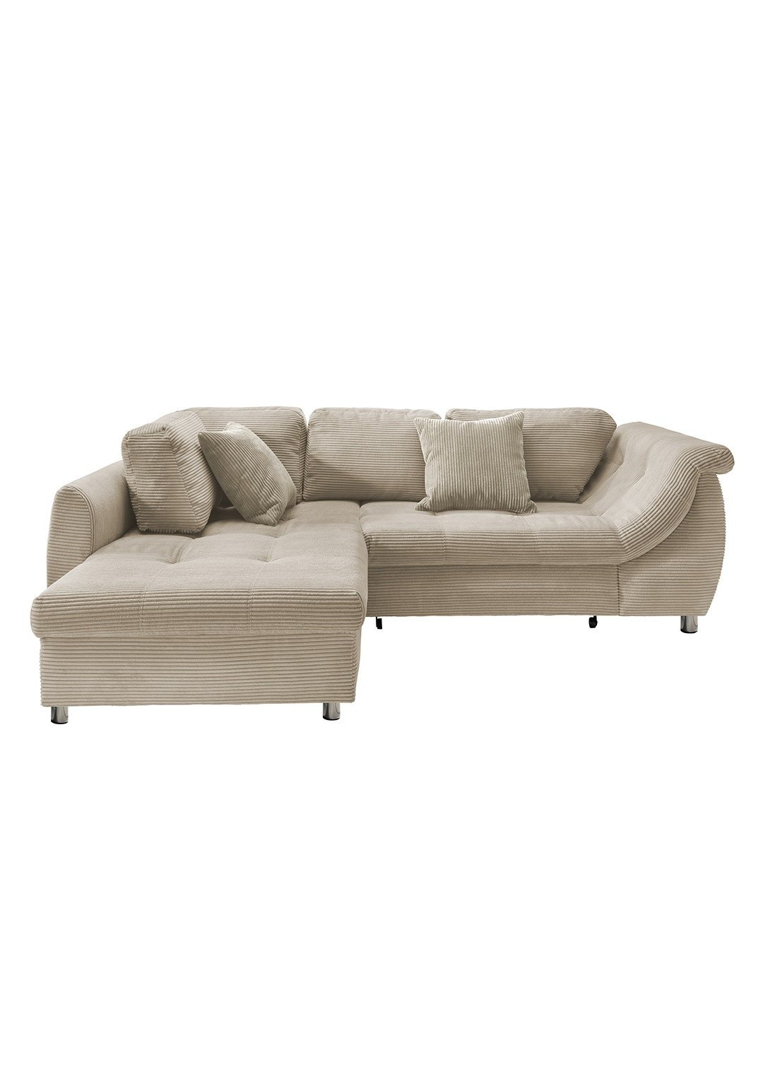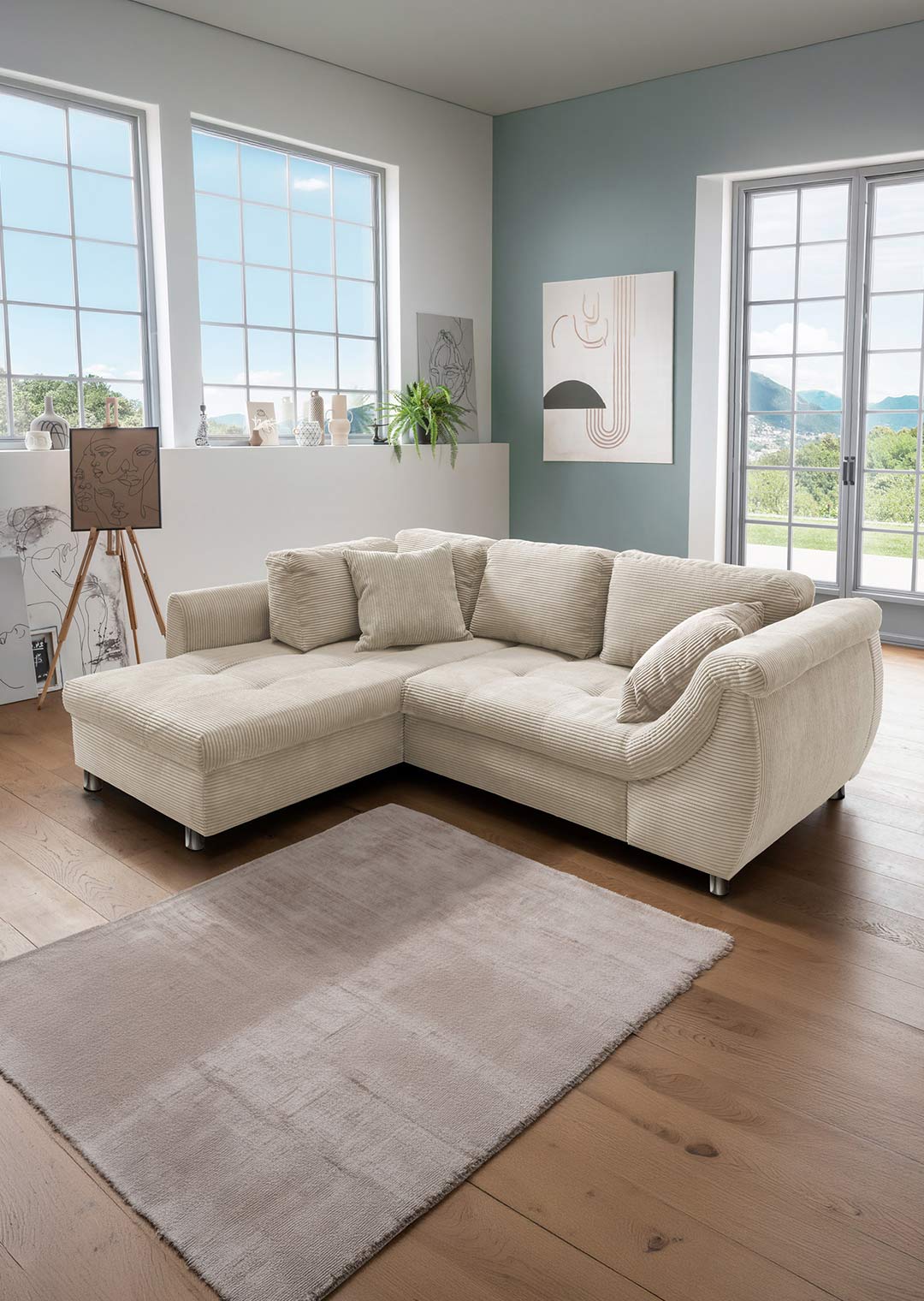 Das Ecksofa LUNARO verbindet modernes Wohnen mit höchstem Komfort und wird schnell zum neuen Mittelpunkt Ihres Wohnzimmers. Der angesagte Cordbezug in elegantem Beige verleiht dem Sofa eine warme, zeitlose Ausstrahlung und liegt voll im aktuellen Einrichtungstrend. Gleichzeitig sorgt die markante Cordstruktur für ein besonders gemütliches Sitzgefühl und einen hochwertigen Look. Die ca. 8 cm hohen Metallfüße in Chromoptik setzen einen modernen Akzent und verleihen dem Design eine leichte, elegante Note.