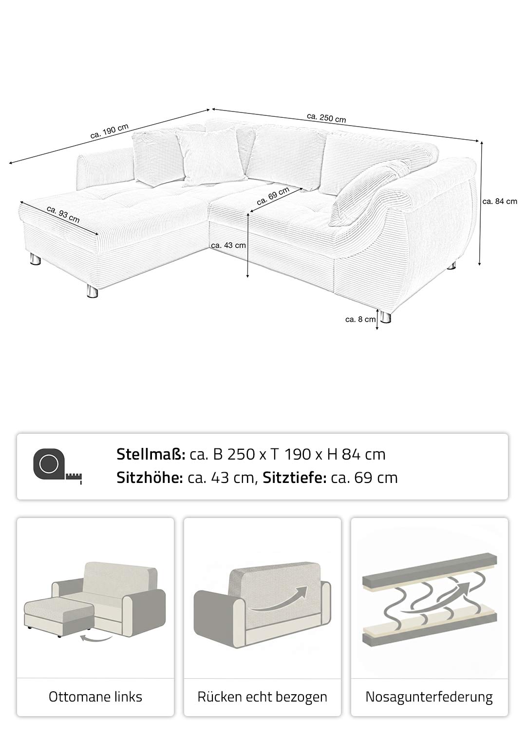 Praktisch zeigt sich das Ecksofa auch im Alltag: Die integrierte Schlaffunktion verwandelt das Sofa im Handumdrehen in eine komfortable Liegefläche von ca. 190 x 171 cm - ideal für Übernachtungsbesuch. Zusätzlichen Stauraum bietet der Bettkasten unter der Ottomane, in dem Decken, Kissen oder Bettwäsche bequem verstaut werden können. Dank der komfortablen Polsterung aus Nosagunterfederung auf Komfortschaum genießen Sie optimalen Sitz- und Liegekomfort - perfekt für entspannte Abende, gesellige Stunden oder ruhige Momente für sich. Den Abschluss bilden 4 große Rückenkissen und 2 Zierkissen und runden das Gesamtbild stilvool ab, unterstreichen aber auch den wohnlichen Charakter. Beachten Sie bitte: Der Ottomane lässt sich nur links montieren, prüfen Sie daher vor der Bestellung ob das passende Platzangebot vorhanden ist. Bestellen Sie noch heute Ihr neues Ecksofa bequem online. Wir freuen uns auf Sie!Produktdetails: |