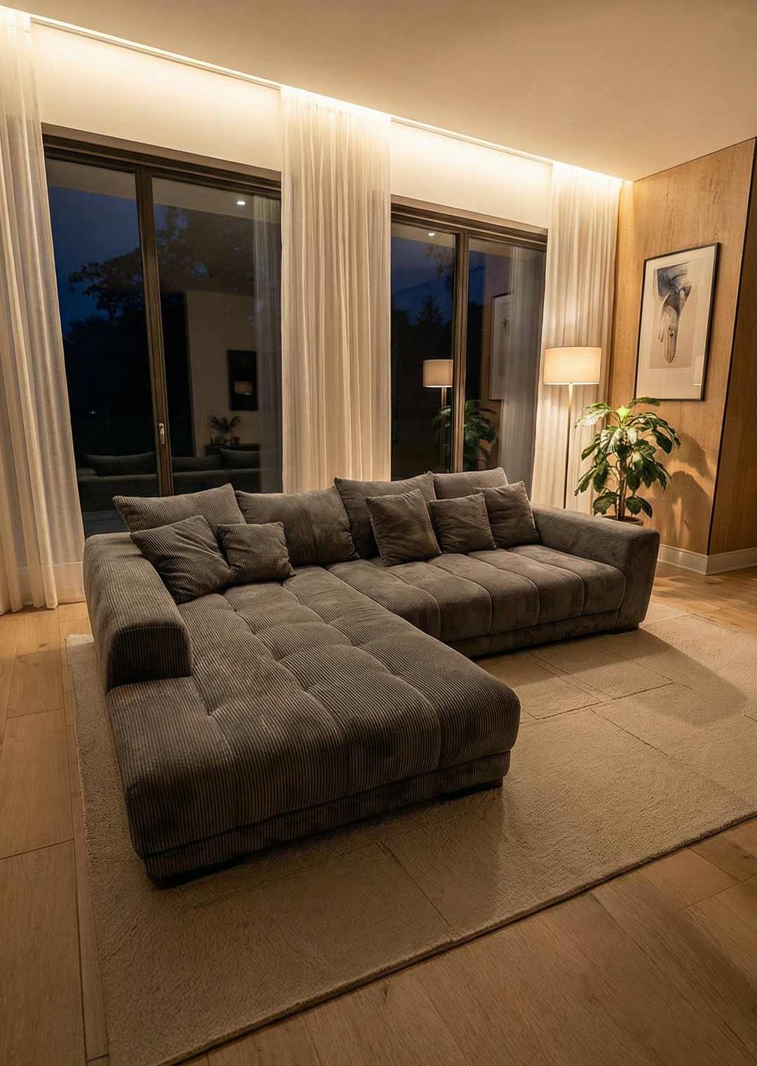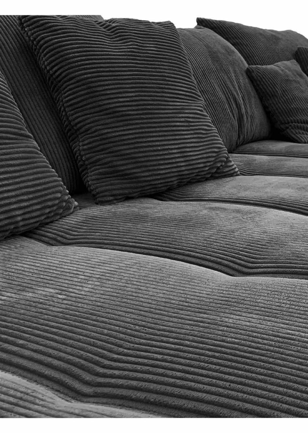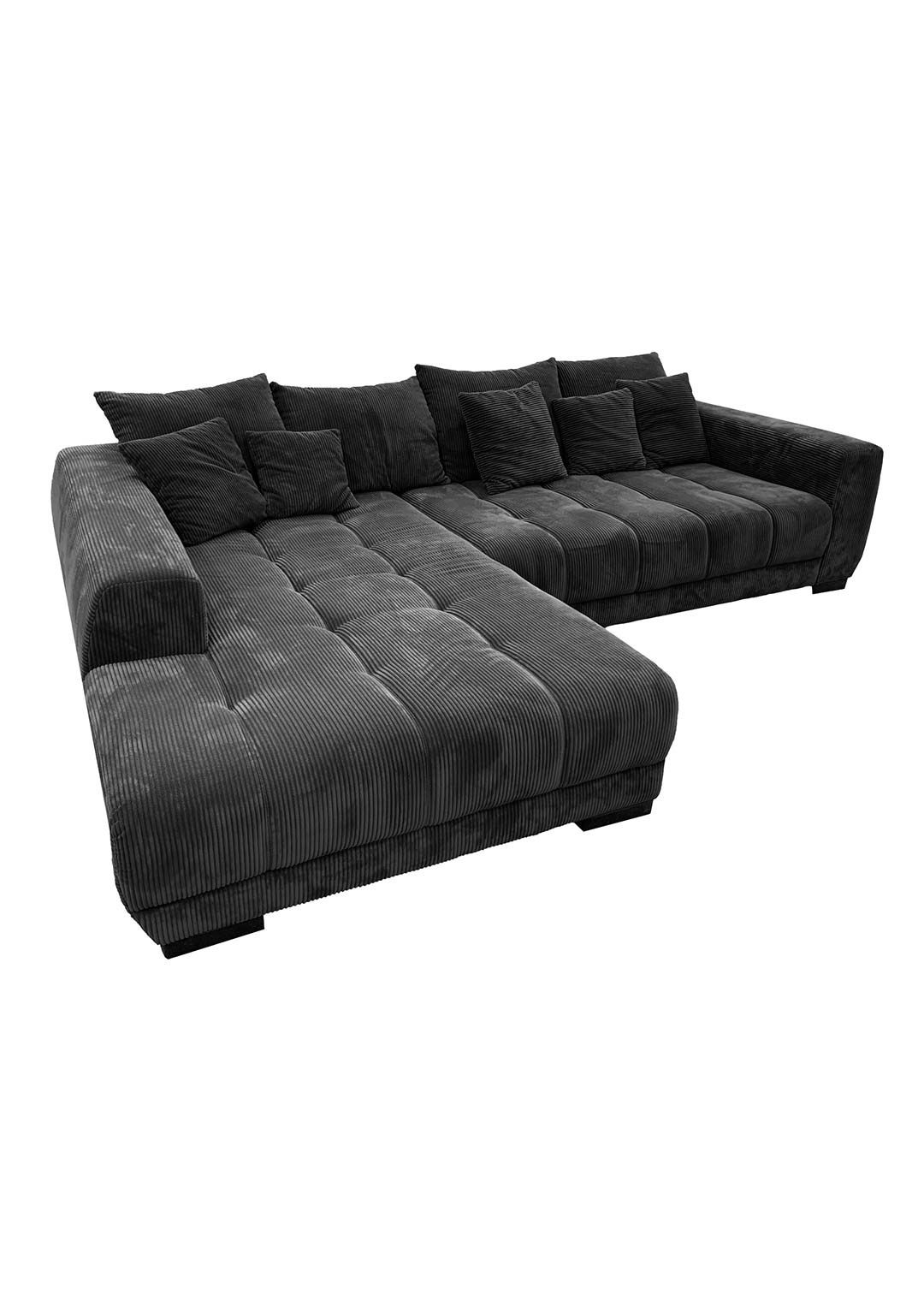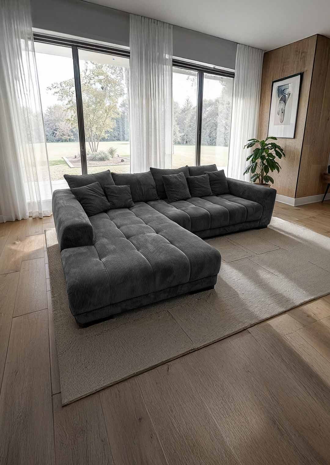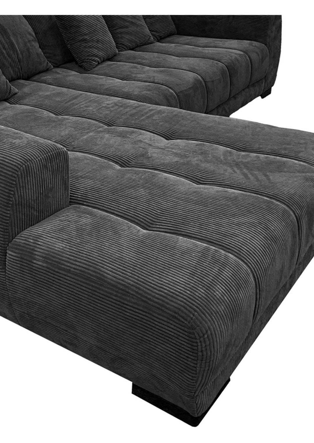 Unsere Ecksofa ARTEMIS in elegantem Cordstoff in Dunkelgrau ist nicht nur ein Blickfang, sondern auch eine Einladung zum Verweilen und Entspannen. Der Cordstoff verleiht dem Sofa nicht nur eine trendige Note, sondern ist auch herrlich angenehm auf der Haut. Sie möchten Ihr neues Möbel mittig im Raum präsentieren? Kein Problem dank des echt bezogenen Rückens macht unser Ecksofa in jeder Position eine gute Figur. Unterstrichen wird das angesagte Design durch die schwarzen Füße.