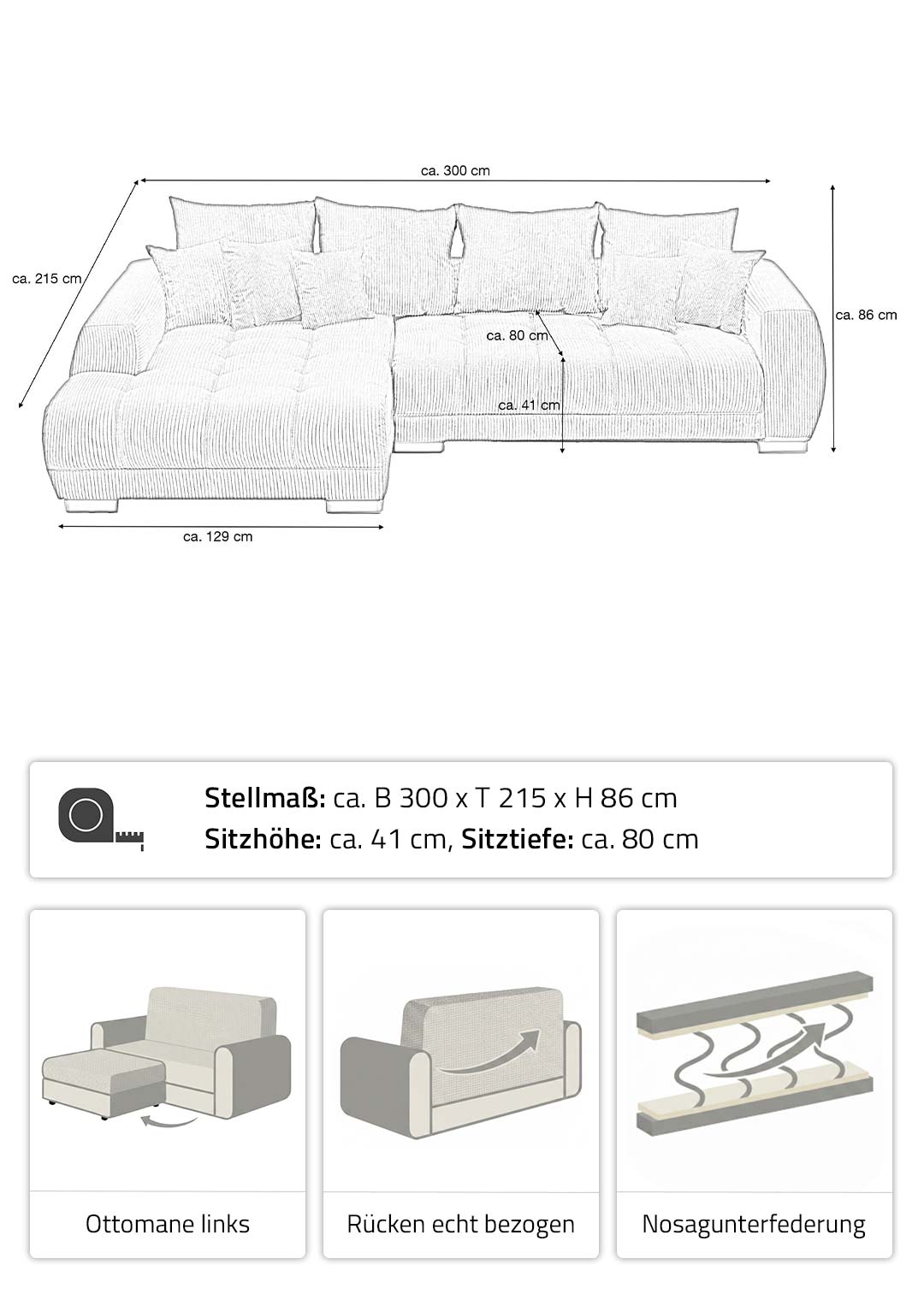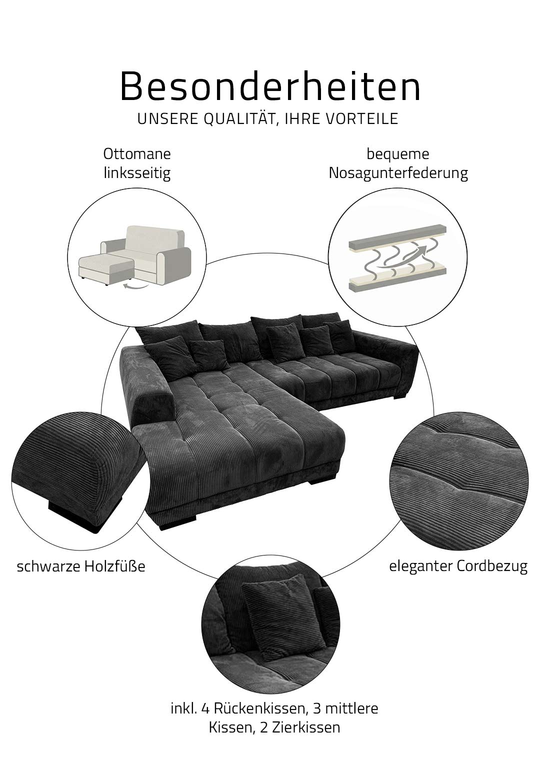 | Bestandteile | 1 x Ottomane mit Armlehne links, 1 x 2-Sitzer mit Armlehne rechts, 4 Rückenkissen, 3 mittlere Kissen, 2 Zierkissen, Holzfüße schwarz lackiert |