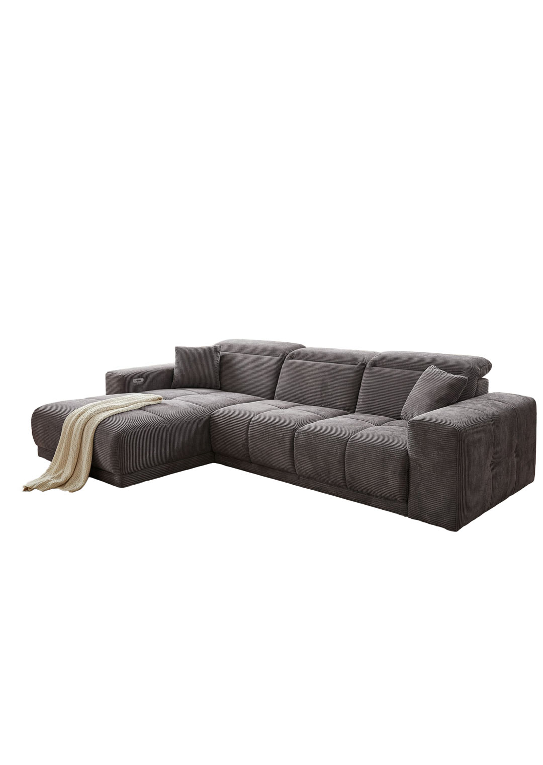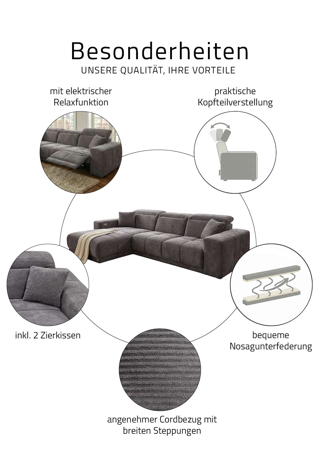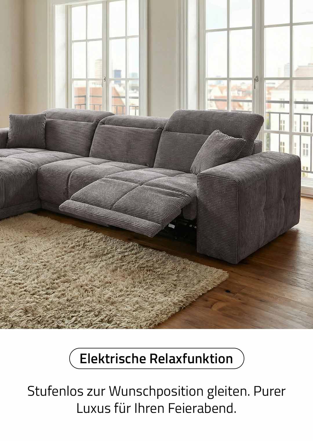 Das Sofa bietet mit einer Breite von ca. 302 cm richtig viel Platz für die ganze Familie, oder einfach zum gemütlichen Ausstrecken. Dabei lädt es nicht nur mit seinen großzügigen Maßen zum Relaxen ein. Ausgestattet mit einer elektrischen Relaxfunktion lässt sich der äußere 1-Sitzer per Knopfdruck in eine entspannende Position bringen. Lehnen Sie sich nach einem langen Tag mit einem guten Buch zurück und lassen Sie den Alltag einfach hinter sich. Die Kopfteile können dank Kopfteilverstellung individuell verstellt werden, sodass Sie immer in der perfekten Position sitzen. Den entsprechenden Sitzkomfort garantiert die Polsterung mit Nosagunterfederung. Bereits im Lieferumfang enthalten sind 2 Zierkissen , ebenfalls im dunkelgrauen Cordbezug, für noch mehr Gemütlichkeit.