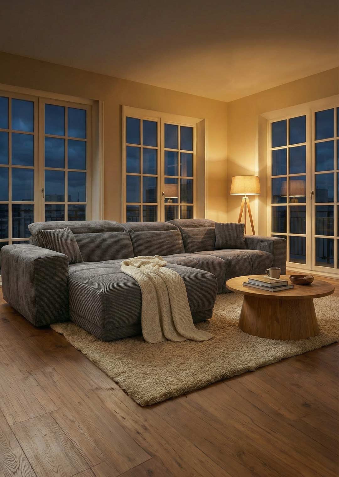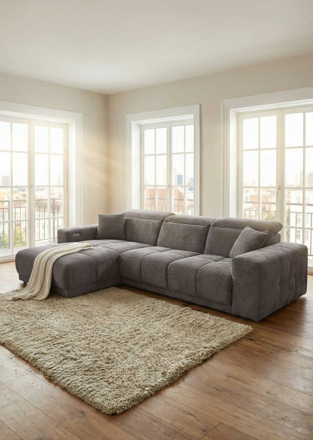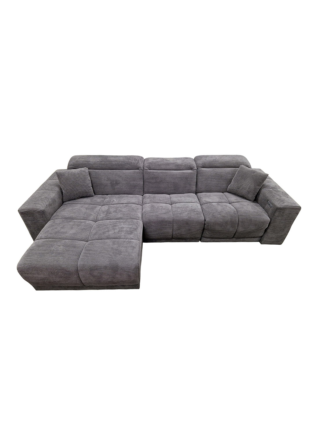 Das Sofa bietet mit einer Breite von ca. 302 cm richtig viel Platz für die ganze Familie, oder einfach zum gemütlichen Ausstrecken. Dabei lädt es nicht nur mit seinen großzügigen Maßen zum Relaxen ein. Ausgestattet mit einer elektrischen Relaxfunktion lässt sich der äußere 1-Sitzer per Knopfdruck in eine entspannende Position bringen. Lehnen Sie sich nach einem langen Tag mit einem guten Buch zurück und lassen Sie den Alltag einfach hinter sich. Die Kopfteile können dank Kopfteilverstellung individuell verstellt werden, sodass Sie immer in der perfekten Position sitzen. Den entsprechenden Sitzkomfort garantiert die Polsterung mit Nosagunterfederung. Bereits im Lieferumfang enthalten sind 2 Zierkissen , ebenfalls im dunkelgrauen Cordbezug, für noch mehr Gemütlichkeit.