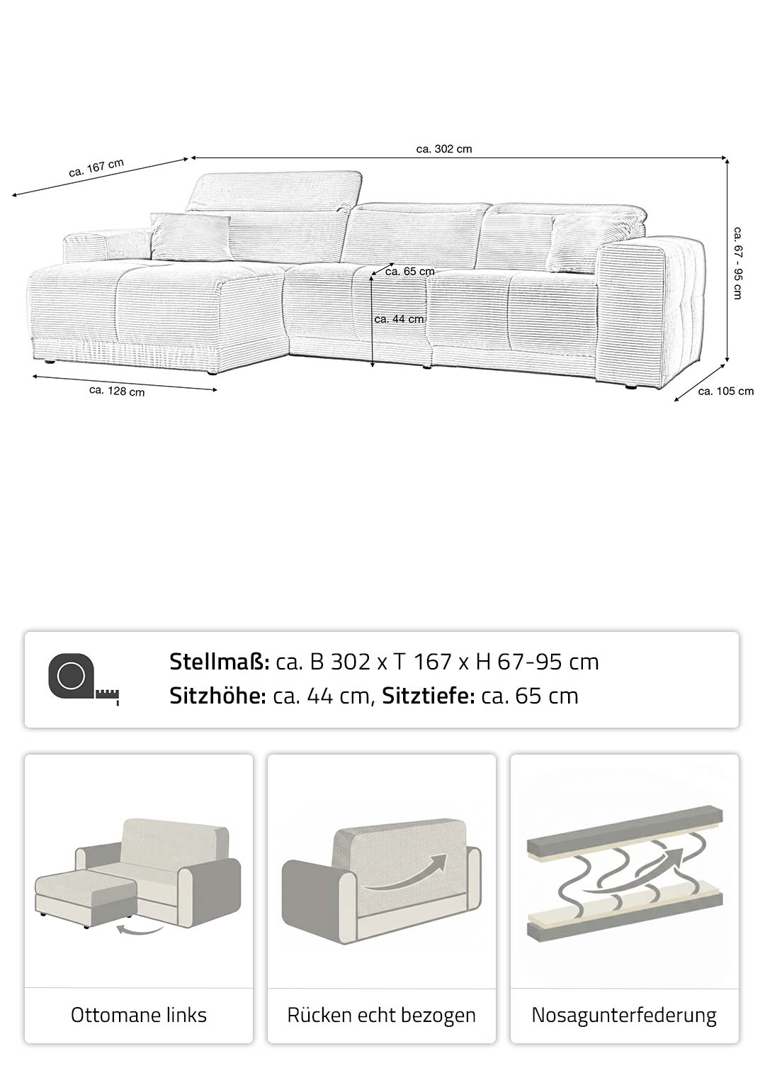 Ecksofa Cord grau 302 x 167 cm mit Relaxfunktion - OT links - TONI