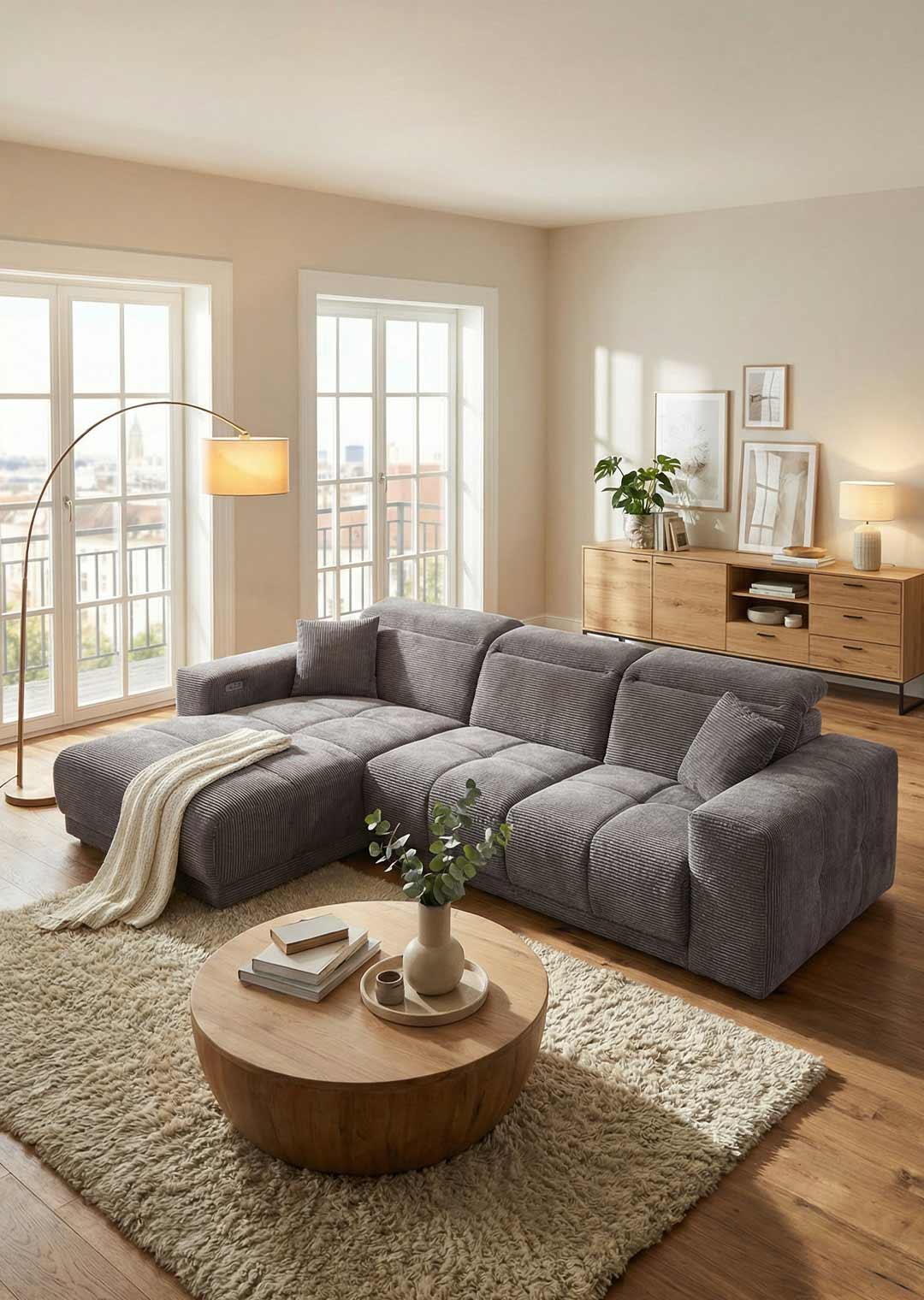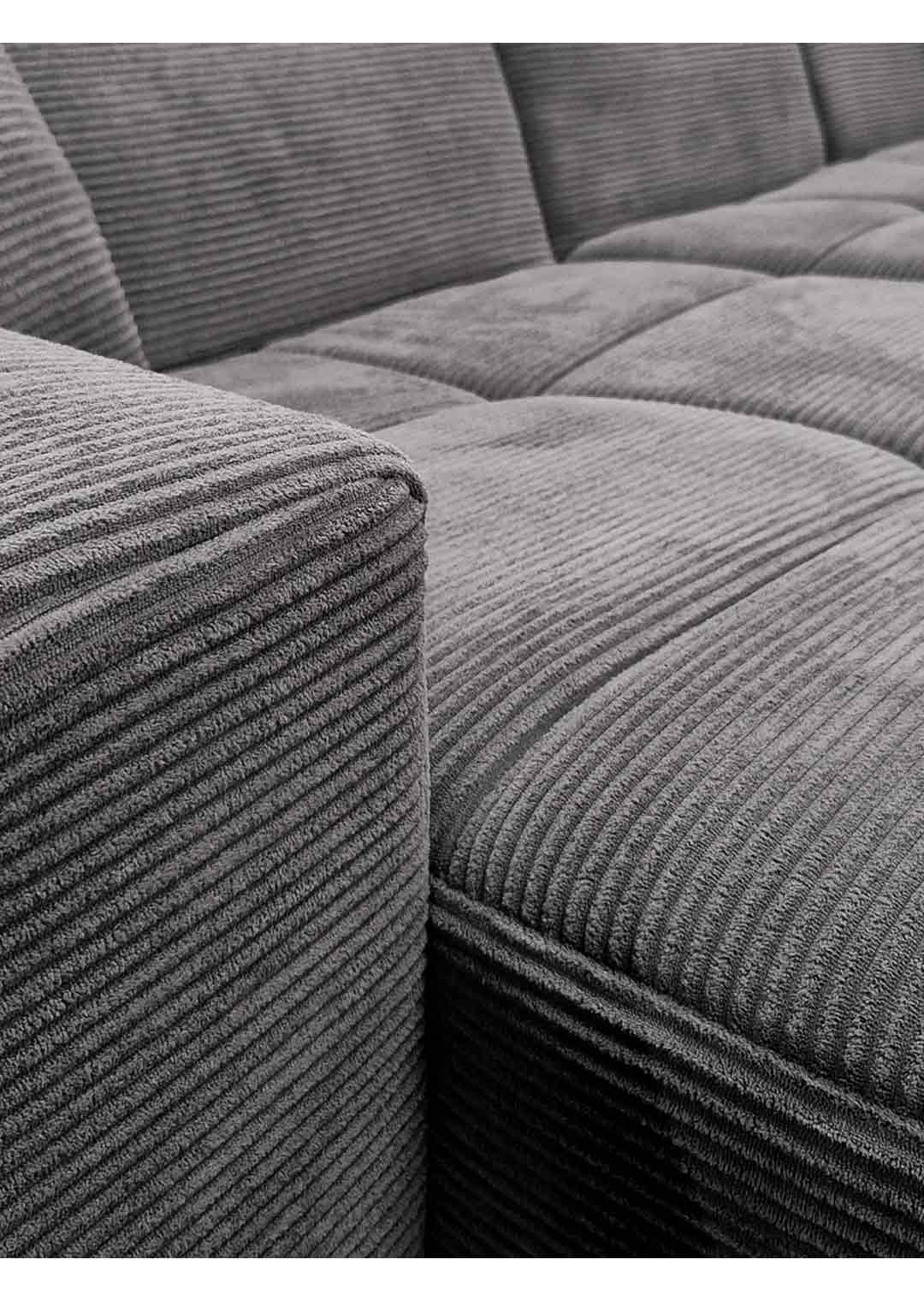 Das Ecksofa TONI wird dank seiner Funktionalitäten und seiner ansprechenden Optik im Handumdrehen zu Ihrem neuen Lieblingsplatz. Der trendige, feingerippte Cordbezug hat eine besonders weiche Haptik und strahlt eine einladende Gemütlichkeit aus. In einem dunklen Grau hat das Sofa dabei eine ganz besondere Präsenz im Raum, ohne jedoch aufdringlich zu sein. Die moderne Optik wird durch die großen Steppungen unterstrichen. Perfekt abgerundet wird das Design dieses Ecksofas durch die schwarzen Füße, die sich harmonisch in das Gesamtbild einfügen. Das Ecksofa TONI zieht garantiert alle Blicke auf sich. Der Rücken ist echt bezogen und ermöglicht es Ihnen, das Sofa auch frei im Raum zu platzieren - ideal für eine offene, individuelle Raumgestaltung.