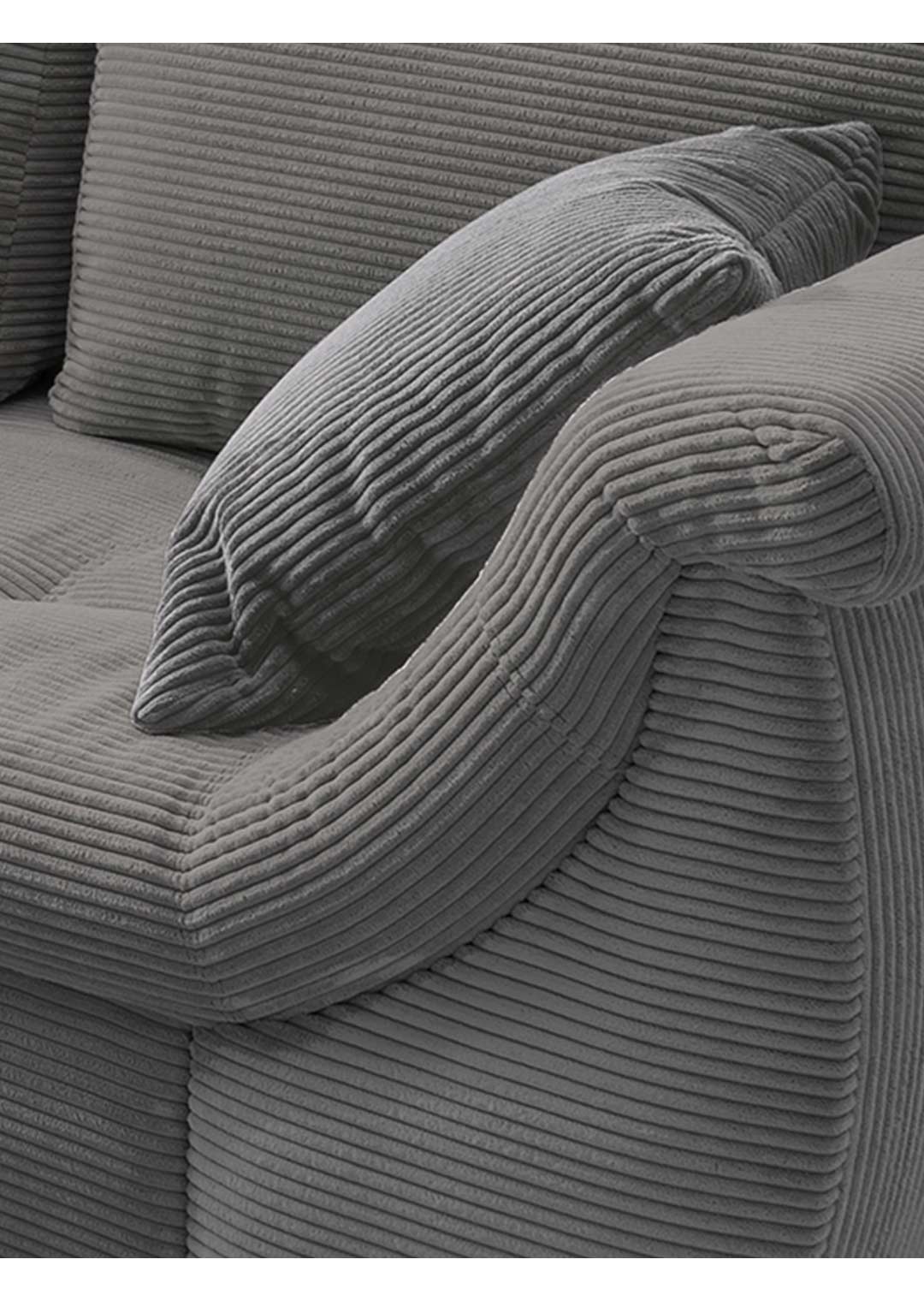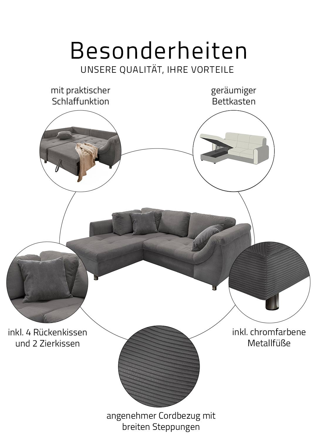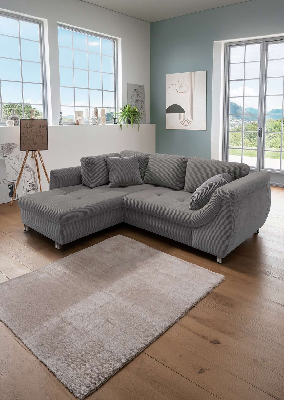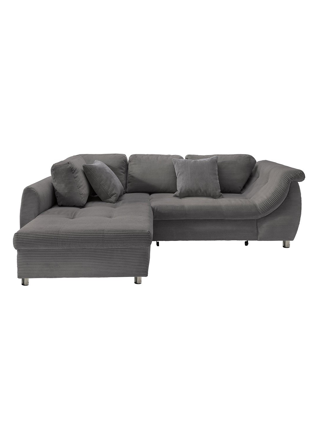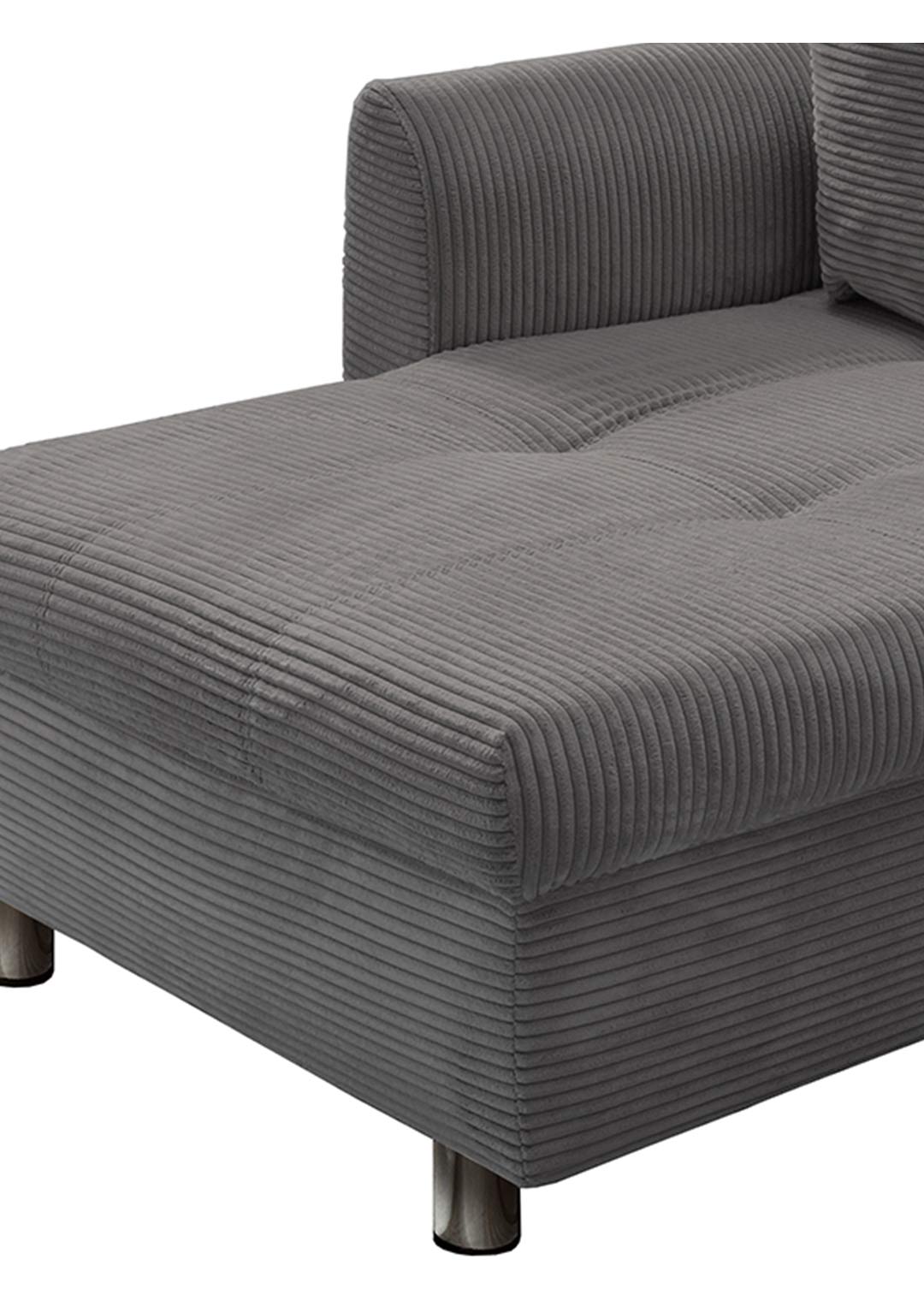 Das Ecksofa LUNARO verbindet modernes Wohnen mit höchstem Komfort und wird schnell zum neuen Mittelpunkt Ihres Wohnzimmers. Der angesagte Cordbezug in trendigem Grau verleiht dem Sofa eine moderne, zeitlose Ausstrahlung und liegt voll im aktuellen Einrichtungstrend. Gleichzeitig sorgt die markante Cordstruktur für ein besonders gemütliches Sitzgefühl und einen hochwertigen Look. Die ca. 8 cm hohen Metallfüße in Chromoptik setzen einen modernen Akzent und verleihen dem Design eine leichte, elegante Note.