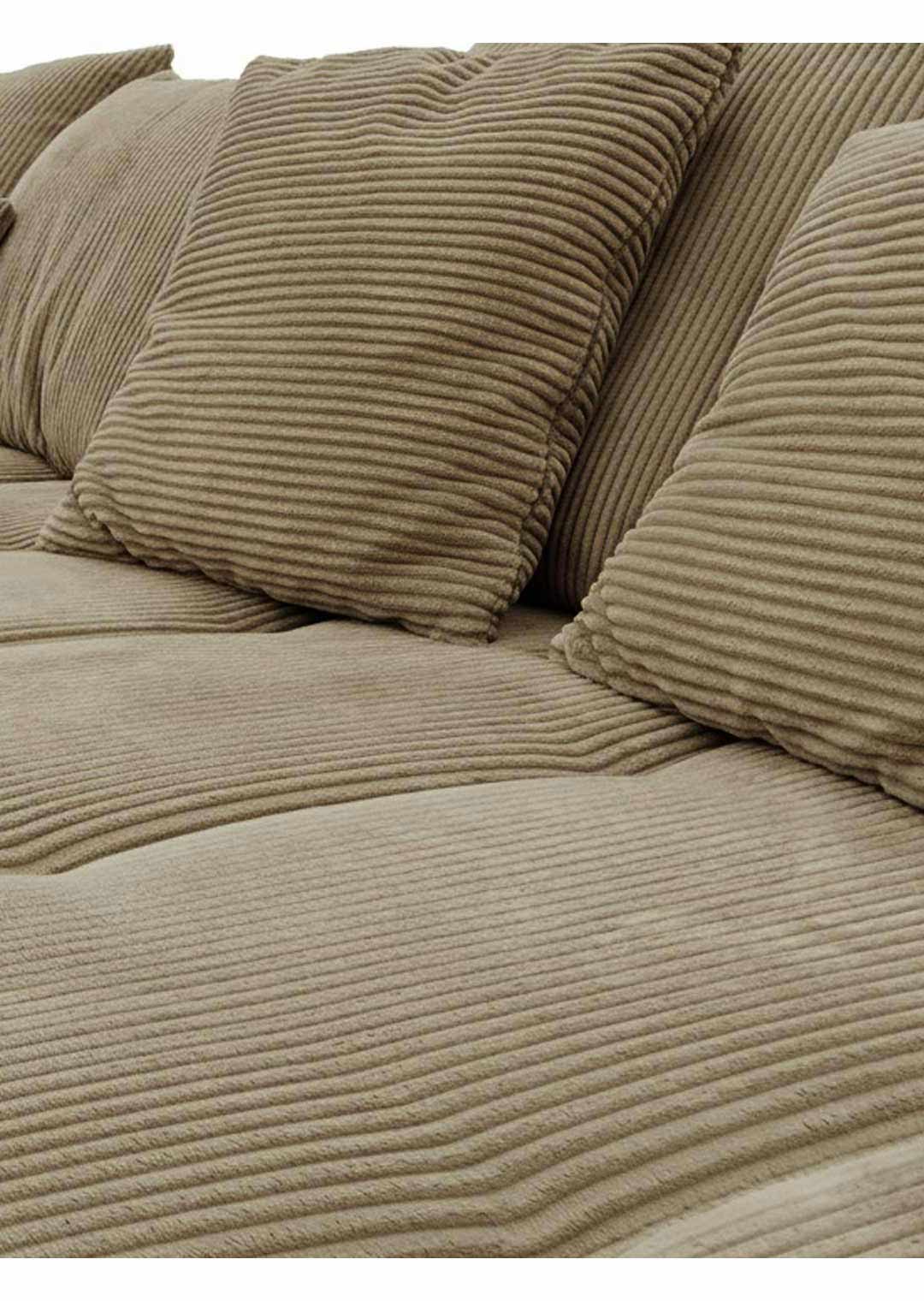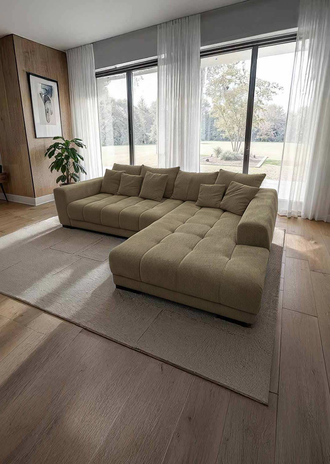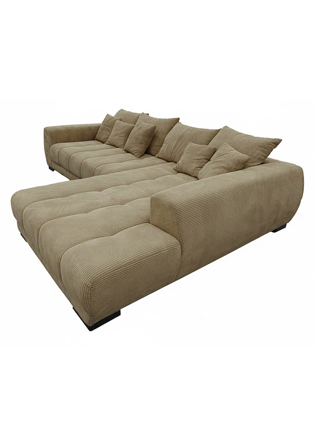 Die großzügigen Proportionen von ca. 300 x 215 cm bieten reichlich Platz, um sich auszubreiten und die Lieblingsposition zu finden - sei es beim Lesen eines Buches, beim Entspannen vor dem Fernseher oder beim Nickerchen am Nachmittag. Dabei unterstützt die Polsterung aus Nosagunterfederung auf Polyätherschaum Ihren Körper beim Sitzen oder Liegen optimal. Die insgesamt 9 Kissen, die im Angebot bereits enthalten sind, verstärken den kuschligen Look noch zusätzlich. Egal, ob alleine oder in Gesellschaft - das Ecksofa ARTEMIS ist der perfekte Ort, um sich zu entspannen, den Alltag hinter sich zu lassen und sich rundum wohl zu fühlen.