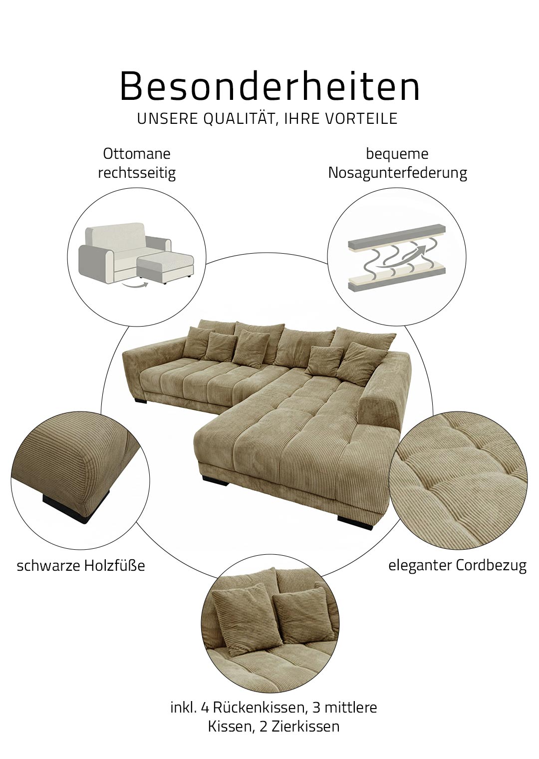 | Bestandteile | 1 x 2-Sitzer mit Armlehne links, 1 x Ottomane mit Armlehne rechts, 4 Rückenkissen, 3 mittlere Kissen, 2 Zierkissen, Holzfüße schwarz lackiert |