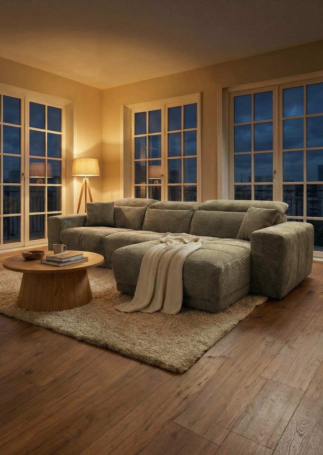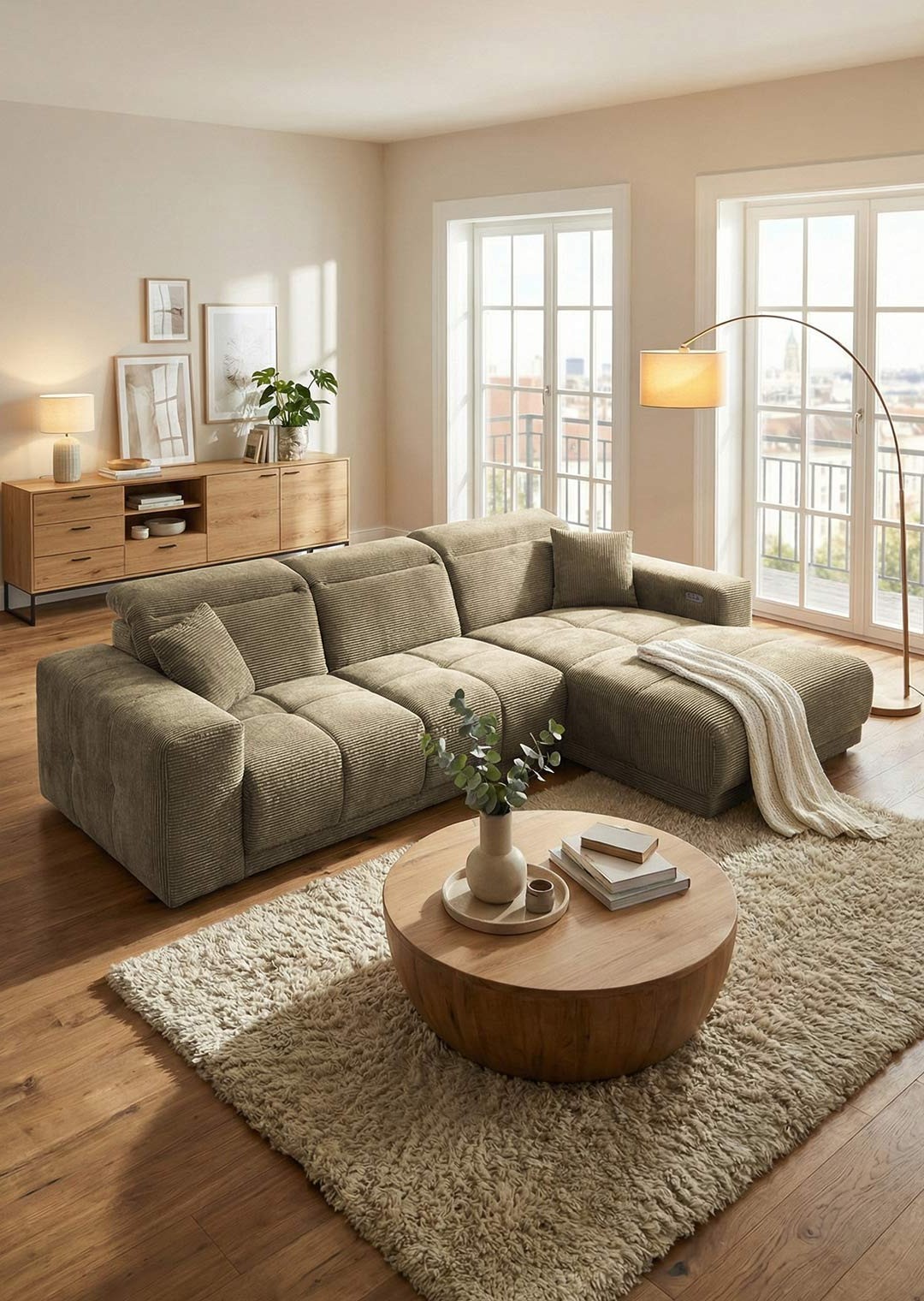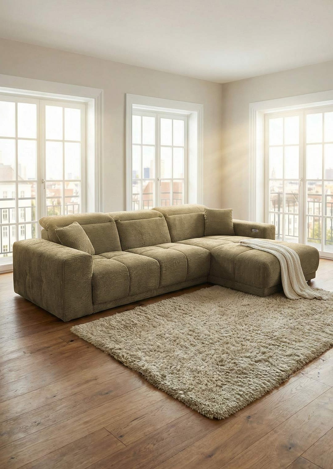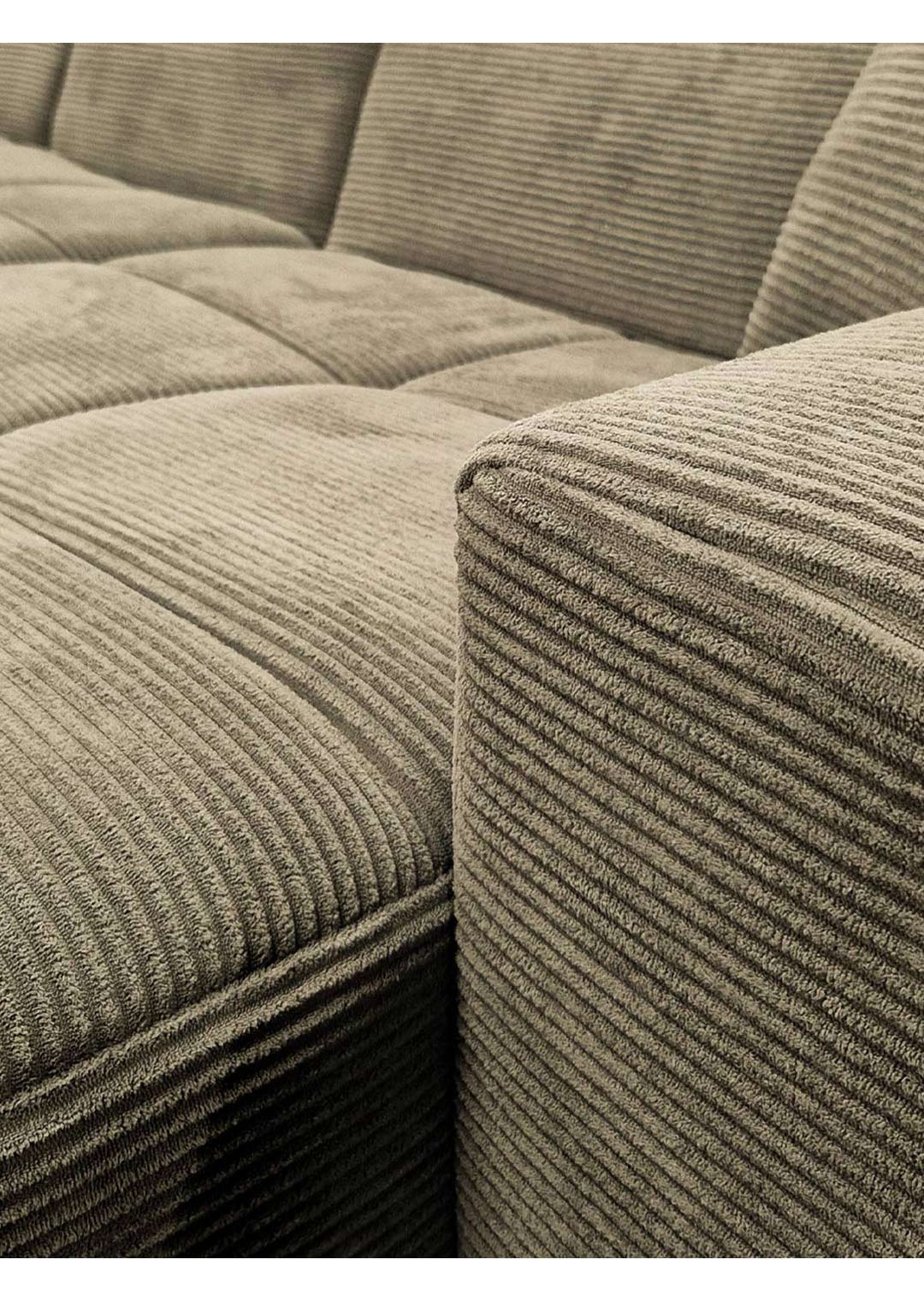 Das Ecksofa TONI wird dank seiner Funktionalitäten und seiner ansprechenden Optik im Handumdrehen zu Ihrem neuen Lieblingsplatz. Der trendige, feingerippte Cordbezug hat eine besonders weiche Haptik und strahlt eine einladende Gemütlichkeit aus. In einem natürlichen Grün hat das Sofa dabei eine ganz besondere Präsenz im Raum, ohne jedoch aufdringlich zu sein. Die moderne Optik wird durch die großen Steppungen unterstrichen. Perfekt abgerundet wird das Design dieses Ecksofas durch die schwarzen Füße, die sich harmonisch in das Gesamtbild einfügen. Das Ecksofa TONI zieht garantiert alle Blicke auf sich. Der Rücken ist echt bezogen und ermöglicht es Ihnen, das Sofa auch frei im Raum zu platzieren - ideal für eine offene, individuelle Raumgestaltung.