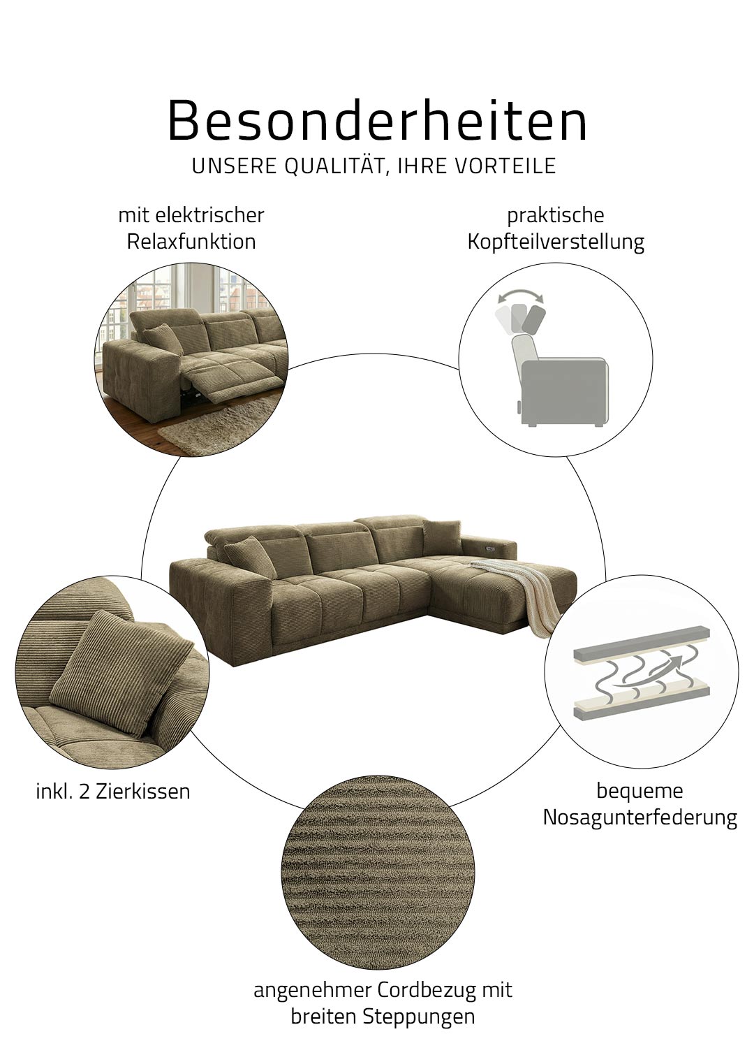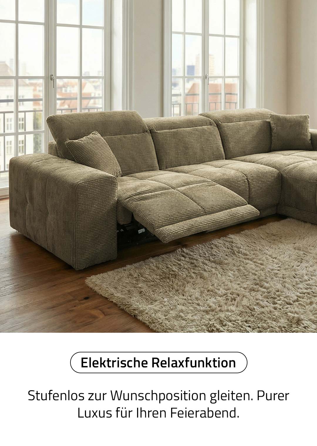 Das Sofa bietet mit einer Breite von ca. 302 cm richtig viel Platz für die ganze Familie, oder einfach zum gemütlichen Ausstrecken. Dabei lädt es nicht nur mit seinen großzügigen Maßen zum Relaxen ein. Ausgestattet mit einer elektrischen Relaxfunktion lässt sich der äußere 1-Sitzer per Knopfdruck in eine entspannende Position bringen. Lehnen Sie sich nach einem langen Tag mit einem guten Buch zurück und lassen Sie den Alltag einfach hinter sich. Die Kopfteile können dank Kopfteilverstellung individuell verstellt werden, sodass Sie immer in der perfekten Position sitzen. Den entsprechenden Sitzkomfort garantiert die Polsterung mit Nosagunterfederung. Bereits im Lieferumfang enthalten sind 2 Zierkissen , ebenfalls im dunkelgrauen Cordbezug, für noch mehr Gemütlichkeit.