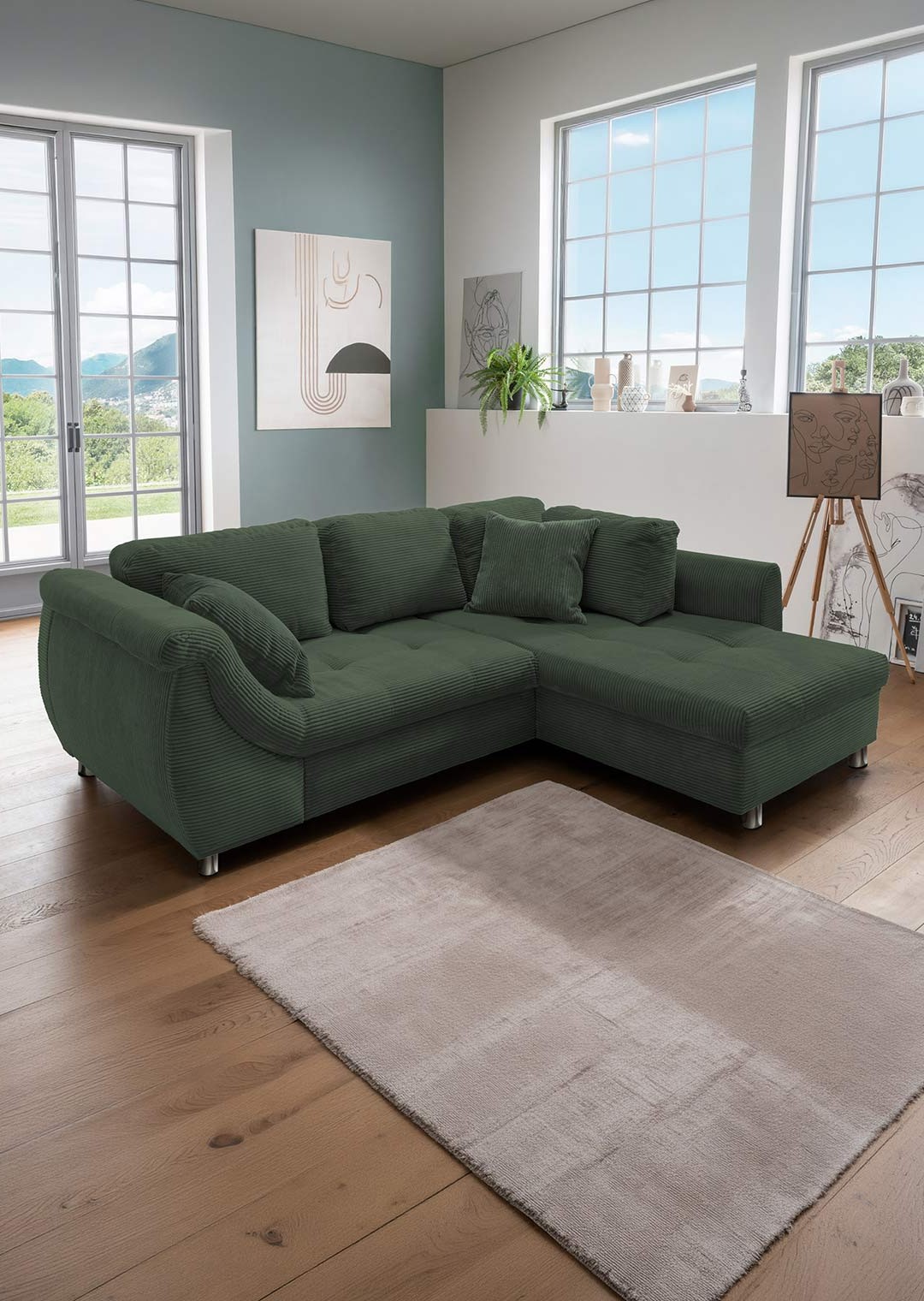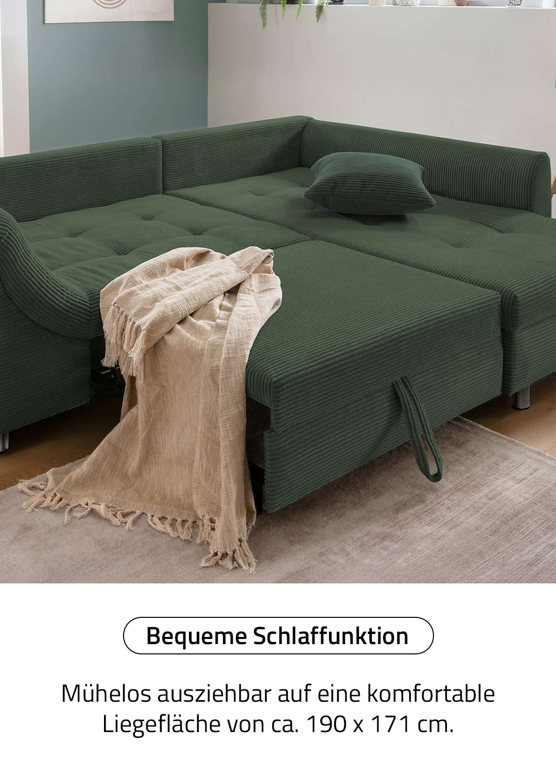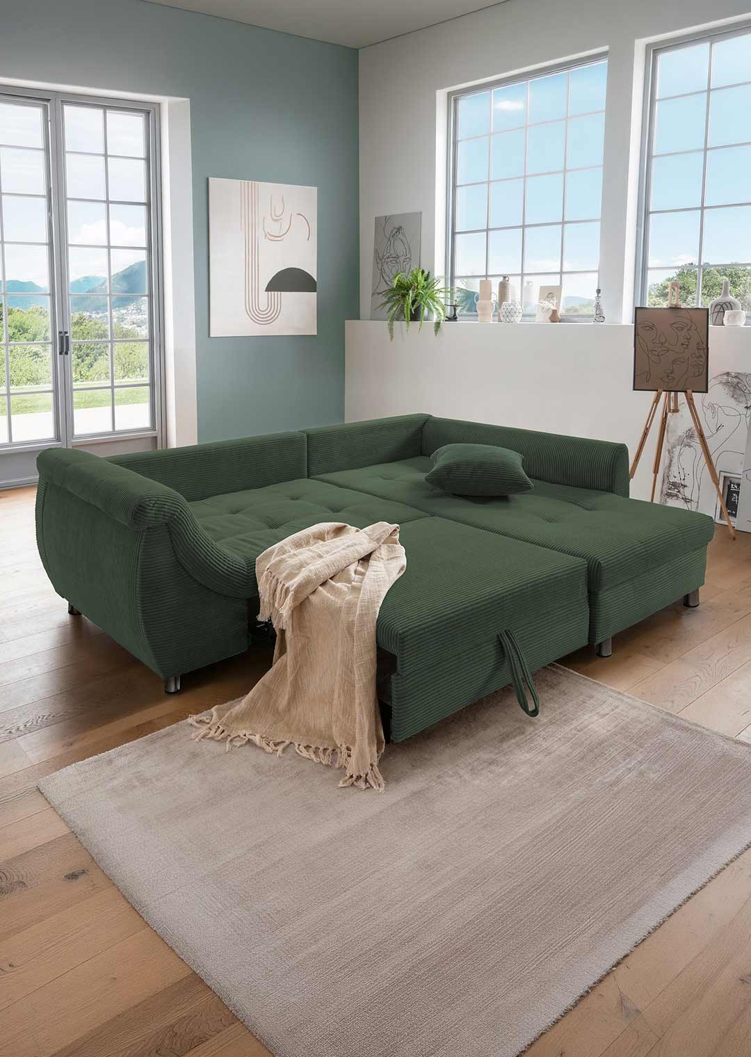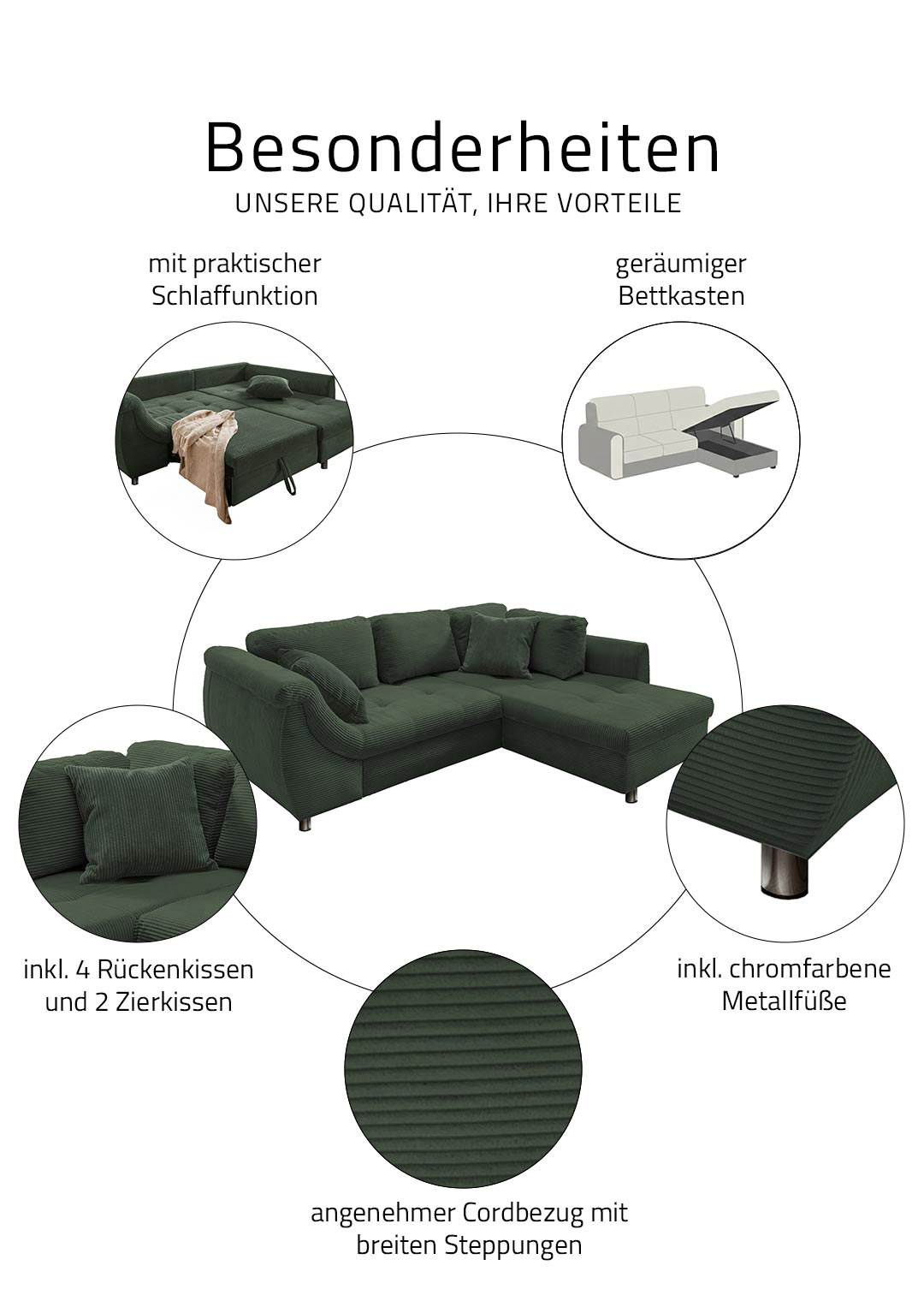 Ecksofa Cord grün Schlaffunktion Bettkasten OT rechts - LUNARO