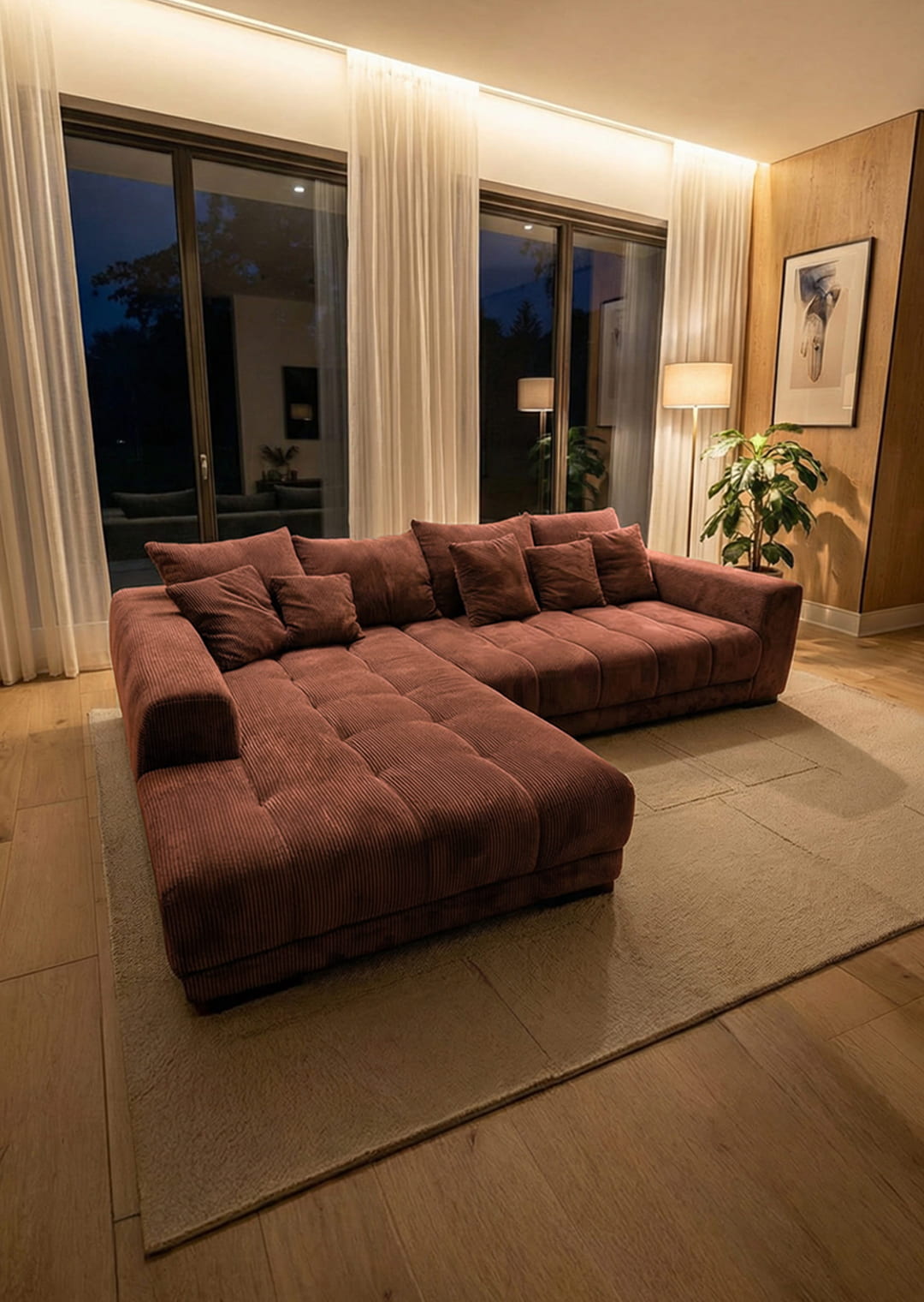 Ich habe lange auf mein Ecksofa gewartet, aber es hat sich absolut gelohnt. Der Cordstoff fühlt sich mega angenehm an und die Polsterung ist sehr bequem. Besonders die vielen Kissen machen das Sofa richtig gemütlich. Ein echter Blickfang !!