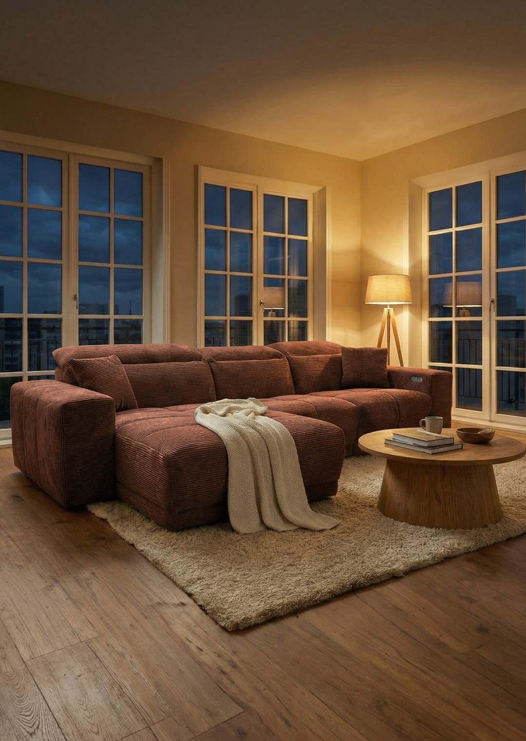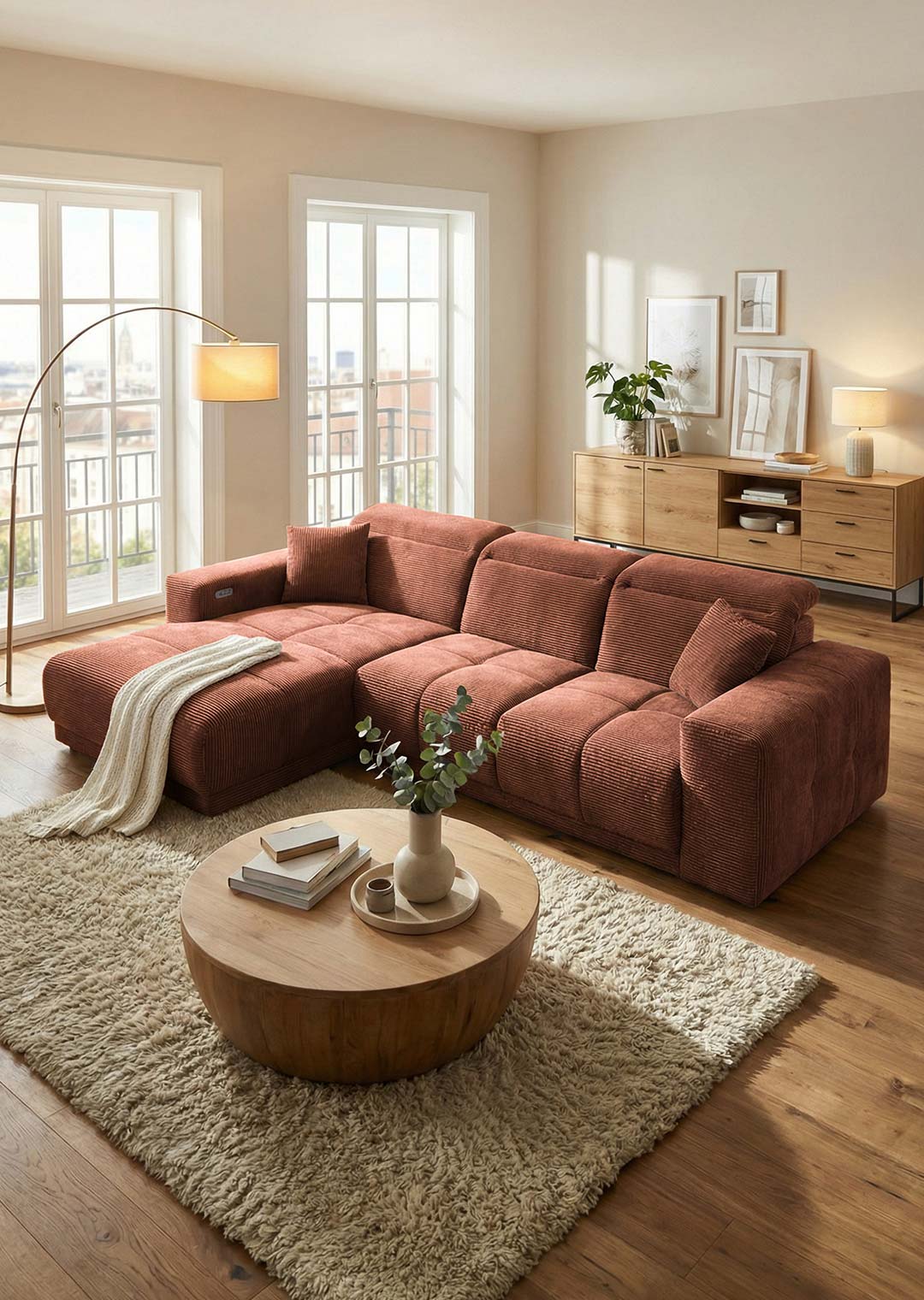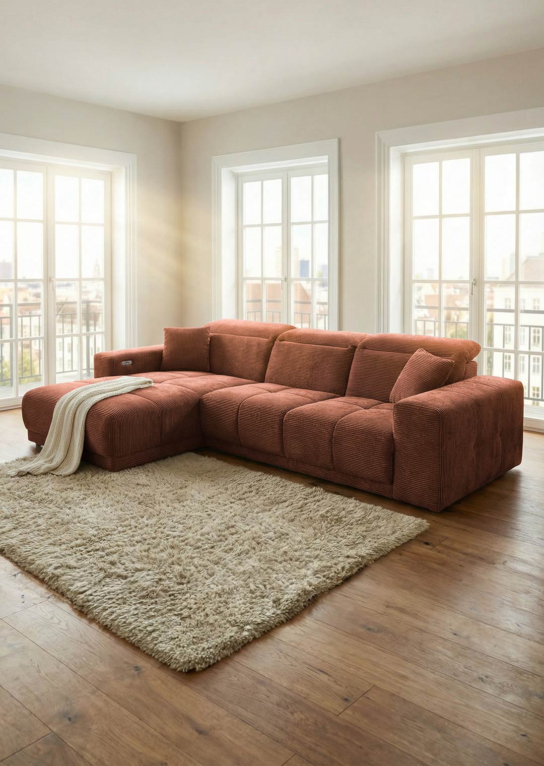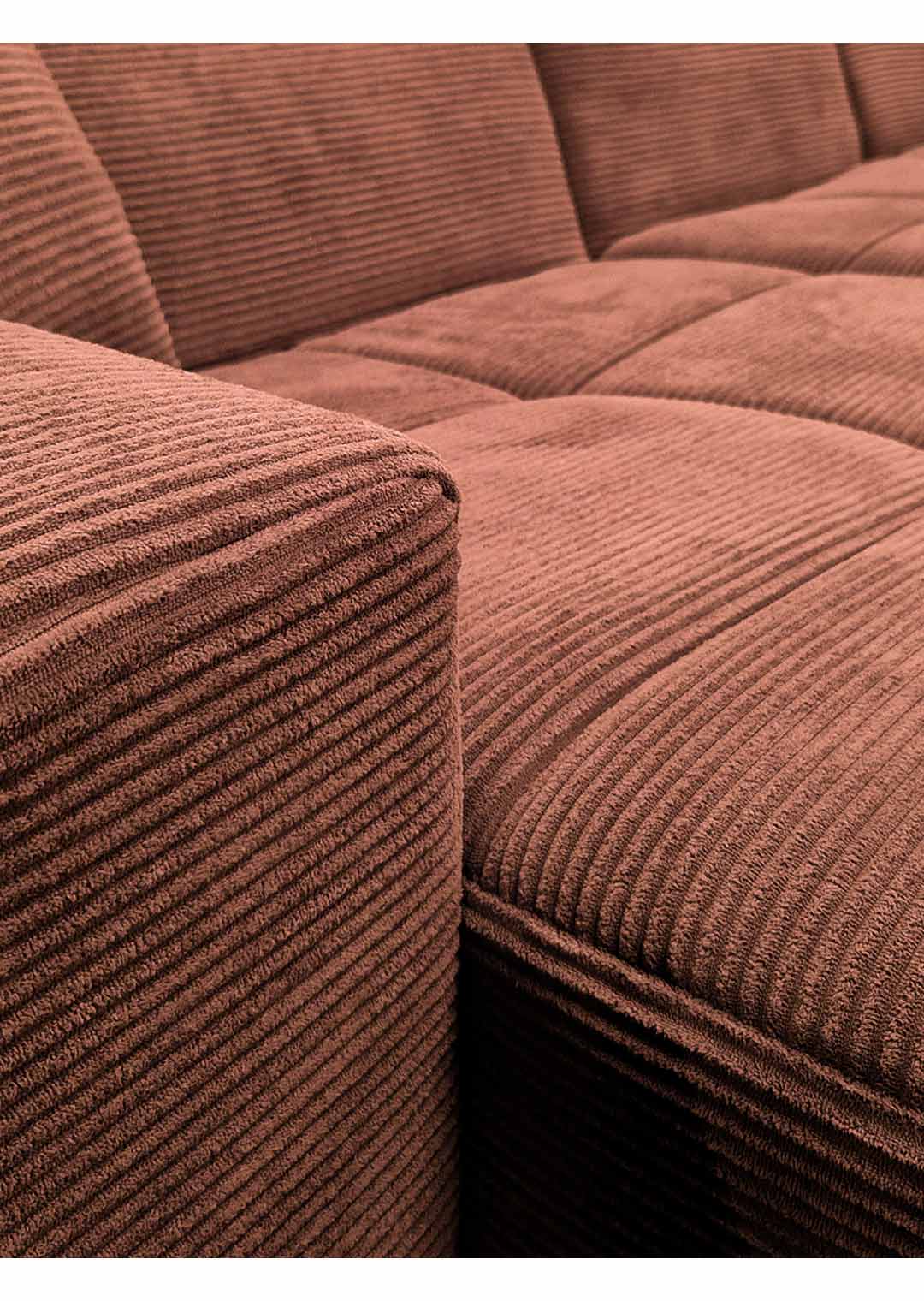 Das Ecksofa TONI wird dank seiner Funktionalitäten und seiner ansprechenden Optik im Handumdrehen zu Ihrem neuen Lieblingsplatz. Der trendige, feingerippte Cordbezug hat eine besonders weiche Haptik und strahlt eine einladende Gemütlichkeit aus. In einem imposanten Rost hat das Sofa dabei eine ganz besondere Präsenz im Raum, ohne jedoch aufdringlich zu sein. Die moderne Optik wird durch die großen Steppungen unterstrichen. Perfekt abgerundet wird das Design dieses Ecksofas durch die schwarzen Füße, die sich harmonisch in das Gesamtbild einfügen. Das Ecksofa TONI zieht garantiert alle Blicke auf sich. Der Rücken ist echt bezogen und ermöglicht es Ihnen, das Sofa auch frei im Raum zu platzieren - ideal für eine offene, individuelle Raumgestaltung.