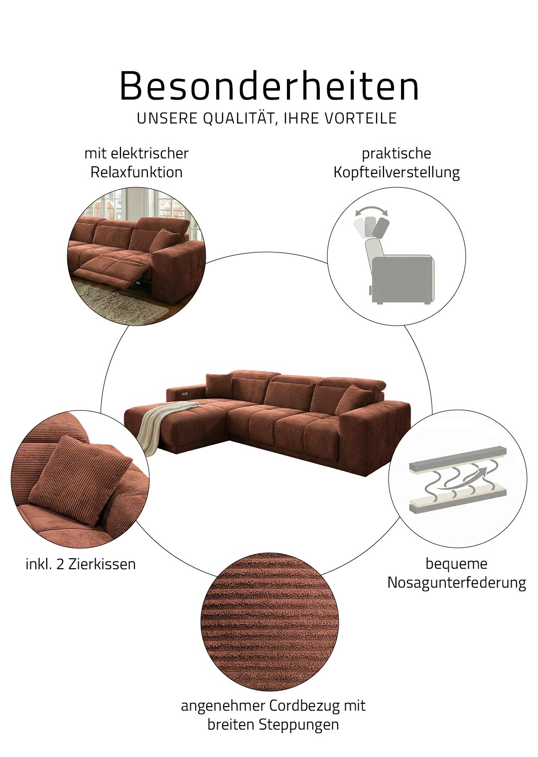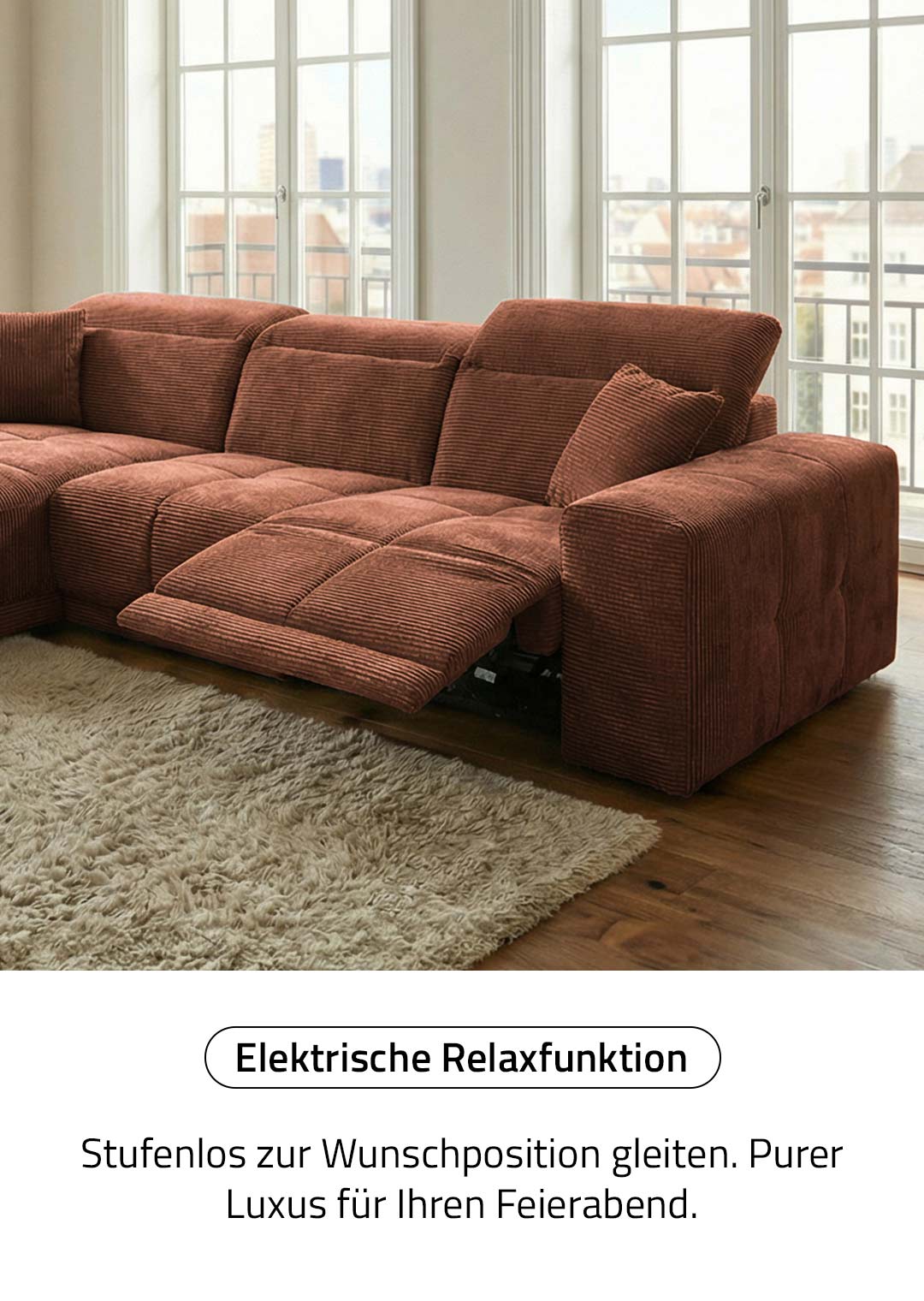 Das Sofa bietet mit einer Breite von ca. 302 cm richtig viel Platz für die ganze Familie, oder einfach zum gemütlichen Ausstrecken. Dabei lädt es nicht nur mit seinen großzügigen Maßen zum Relaxen ein. Ausgestattet mit einer elektrischen Relaxfunktion lässt sich der äußere 1-Sitzer per Knopfdruck in eine entspannende Position bringen. Lehnen Sie sich nach einem langen Tag mit einem guten Buch zurück und lassen Sie den Alltag einfach hinter sich. Die Kopfteile können dank Kopfteilverstellung individuell verstellt werden, sodass Sie immer in der perfekten Position sitzen. Den entsprechenden Sitzkomfort garantiert die Polsterung mit Nosagunterfederung. Bereits im Lieferumfang enthalten sind 2 Zierkissen , ebenfalls im dunkelgrauen Cordbezug, für noch mehr Gemütlichkeit.