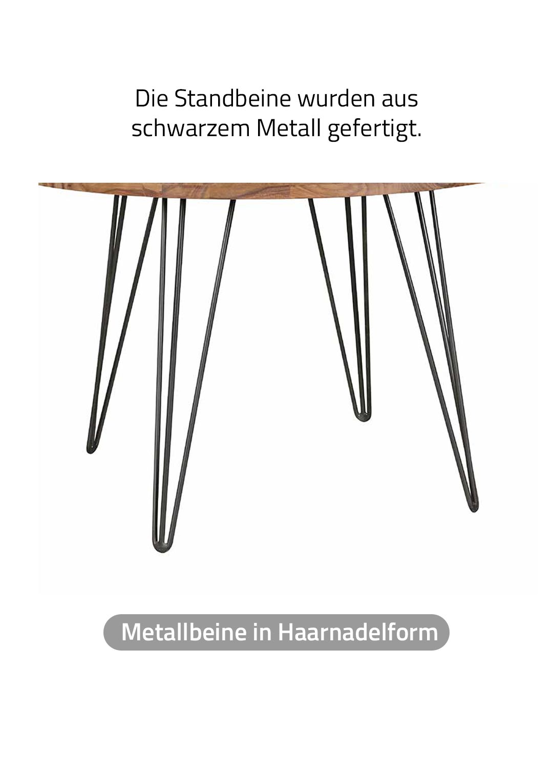 | Bestandteile | 1 x ca. 50 mm starke Tischplatte aus Sheesham Massivholz gebeizt, 4 x schwarze Metallbeine in Haarnadelform |