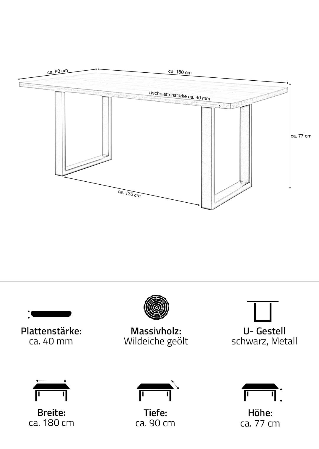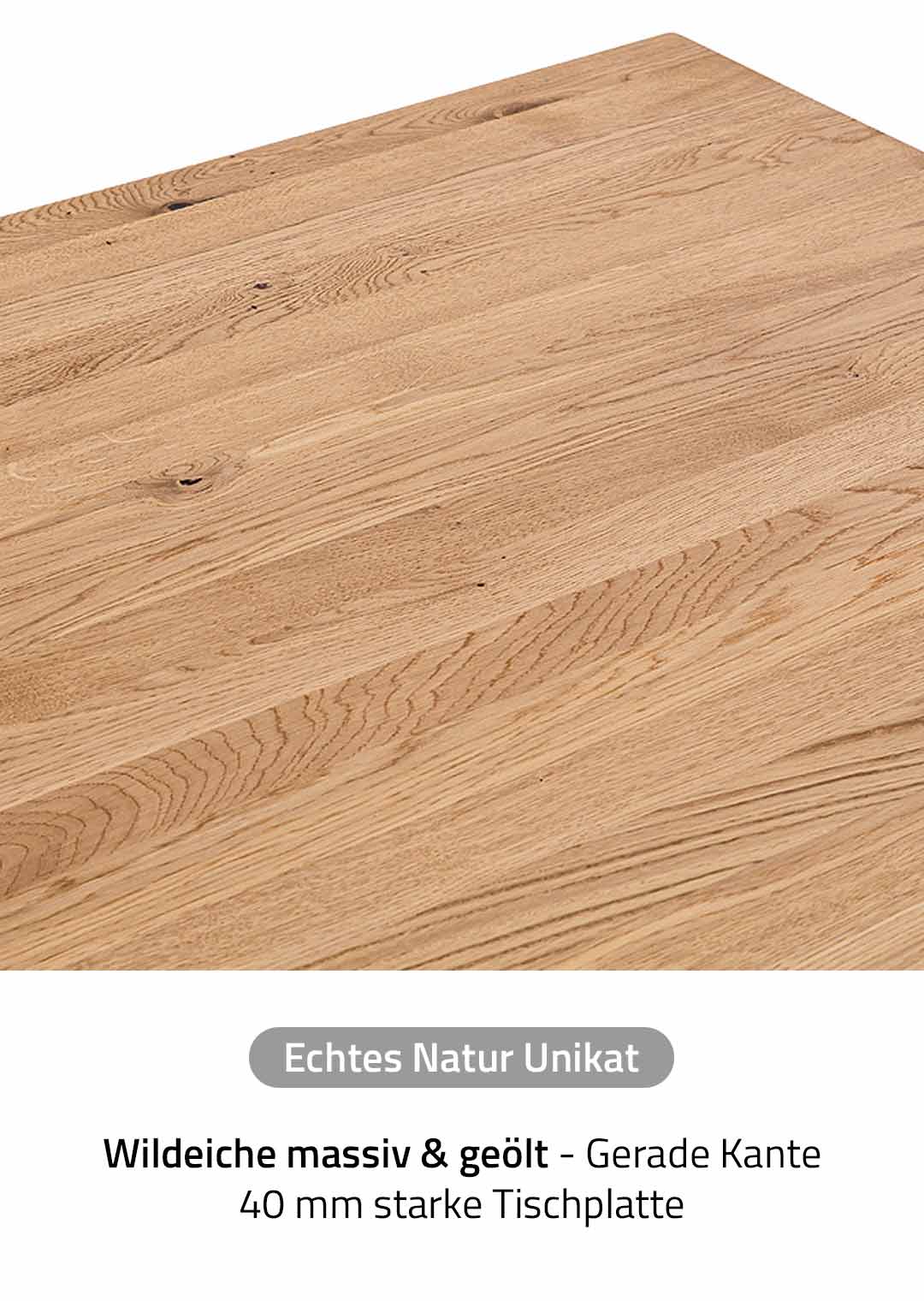 | Bestandteile | 1 Tischplatte Wildeiche Massivholz ca. 40 mm Stärke, 1 U-Gestell in Metall schwarz |