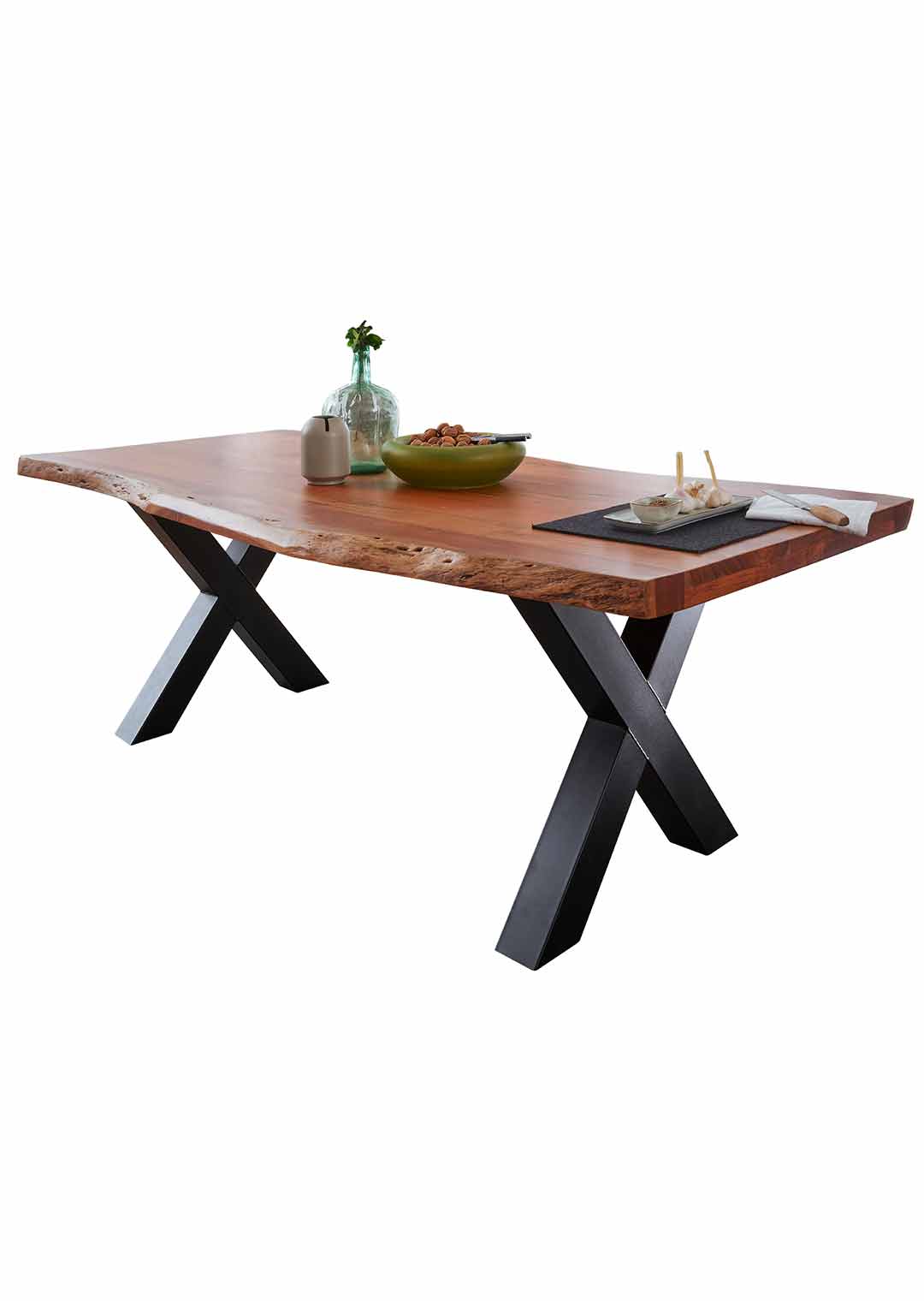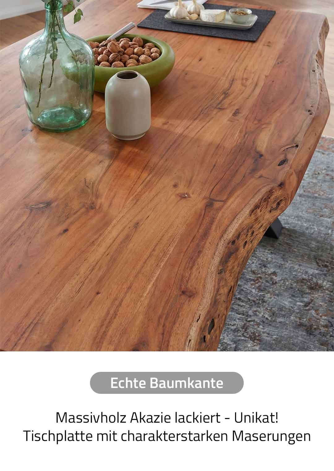 Unser stilvoller Baumkantentisch aus massivem Akazienholz überzeugt durch eine perfekte Kombination aus Natürlichkeit und modernen Akzenten. Besonders hervorzuheben sind die Tischkanten unseres Baumkantentischs TOMASO, die der natürlichen Form des Baumes entsprechen und direkt aus dem Baumstamm geschnitten wurden. Das schwarz X-förmige Gestell aus Metall sorgt für einen stabilen Stand und verleiht dem Tisch eine moderne Komponente. Unsere Baumkantentische sind dank Ihrer Individualität immer einzigartig in Farbe und Form. Jeder Tisch ist vom natürlichen Wuchs und der Maserung des verwendeten Holzes geprägt und Sie erhalten beim Kauf ein unverwechselbares Unikat mit echter Baumkante. Da es sich hier um ein Naturprodukt handelt, können Astlöcher, kleine Unebenheiten sowie kleine Risse, Fugen, kleine Löcher oder eine unterschiedliche Farbgebung auftreten; welche jedoch keine Fehler darstellen sondern vielmehr den individuellen Charakter des Echtholzes unterstreichen. Die genannten Maßangaben können aufgrund der asymmetrischen Formgebung etwas variieren. Akazien Holz lackiert: Akazienholz überzeugt mit einer breiten Palette von Farbtönen. Die Farbgebung kann von einem warmen Goldton bis zu einem dunklen Braun reichen. Eine markante Maserung verleiht jedem Möbelstück eine charaktervolle Ausstrahlung mit natürlichen Mustern. Auch mit Festigkeit und Härte punktet das Akazienholz in jeder Hinsicht - so lässt es sich wunderbar zu einzigartigen Möbeln verarbeiten. Sichern Sie sich noch heute Ihren neuen Esszimmertisch und bestellen Sie bequem in unserem Online Shop oder besuchen Sie uns vor Ort in einer unserer Filialen. Wir freuen uns auf Ihren Besuch!