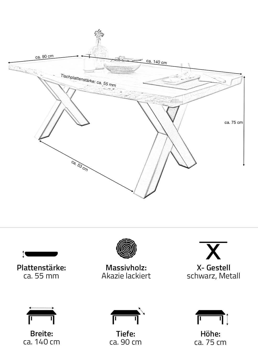 | Eigenschaften | Tischbeine X-Form, echte Baumkante, Naturprodukt mit natürlichen Farbabweichungen und Unebenheiten |