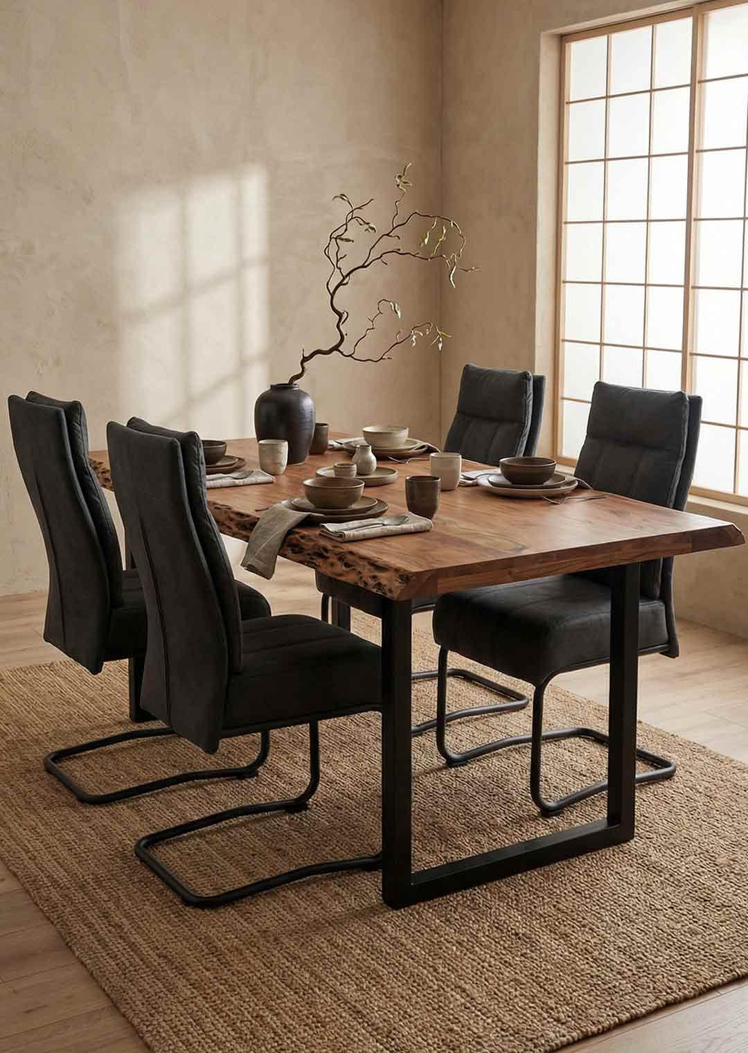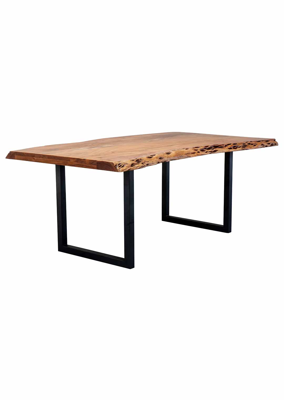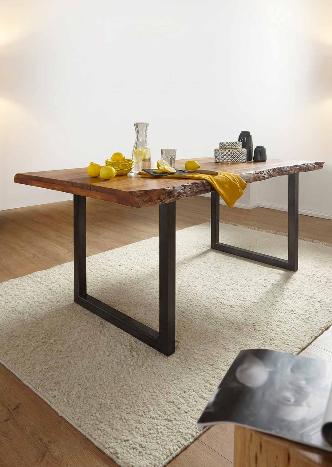 Unser stylischer Baumkantentisch aus massivem Akazienholz überzeugt durch eine perfekte Kombination aus wärme bringendem Naturholz und kühlendem, schwarzem Metall. Besonders hervorzuheben sind die Tischkanten unserer Baumkantentischs TICO, die der natürlichen Form des Baumes entsprechen und direkt aus dem Baumstamm geschnitten wurden. Das U-förmige schwarz lackierte Gestell sorgt für einen stabilen Stand und verleiht dem Tisch eine moderne Komponente.