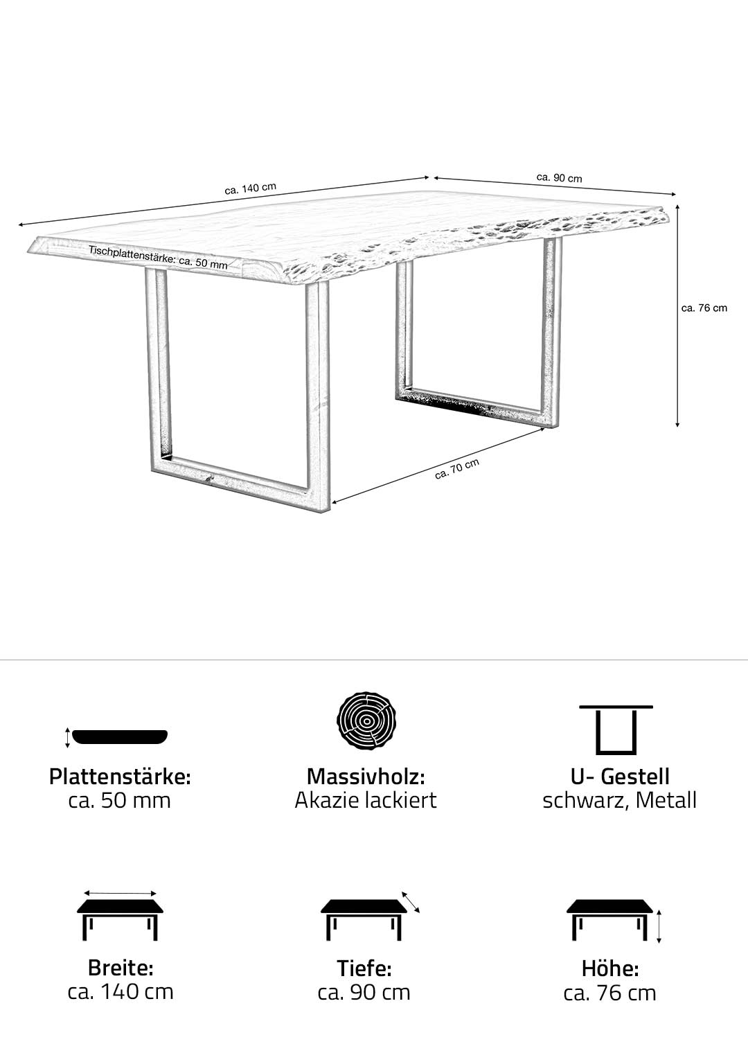 | Eigenschaften | Tischbeine U-Form, echte Baumkante, Naturprodukt mit natürlichen Farbabweichungen und Unebenheiten |