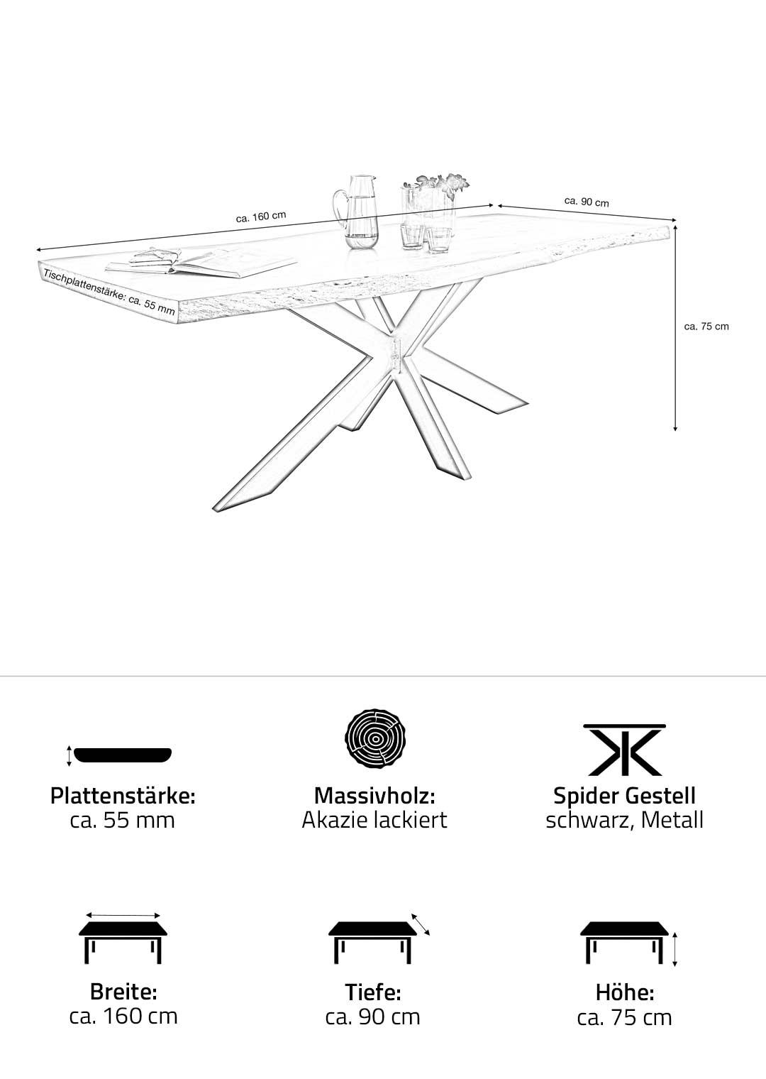 | Bestandteile | 1 Tischplatte Akazie lackiert Massivholz ca. 55 mm Stärke, 1 Spider-Gestell in Metall schwarz |