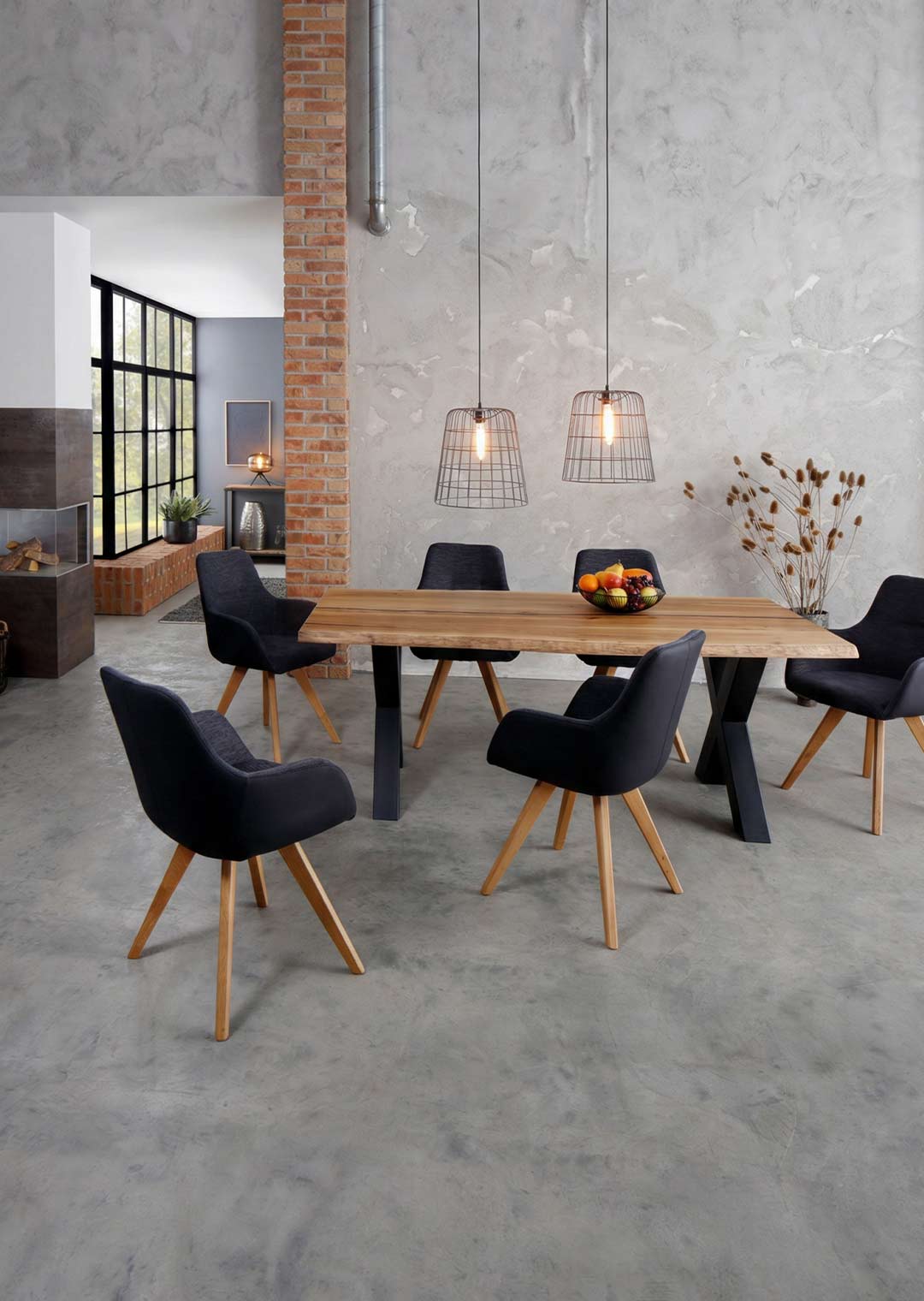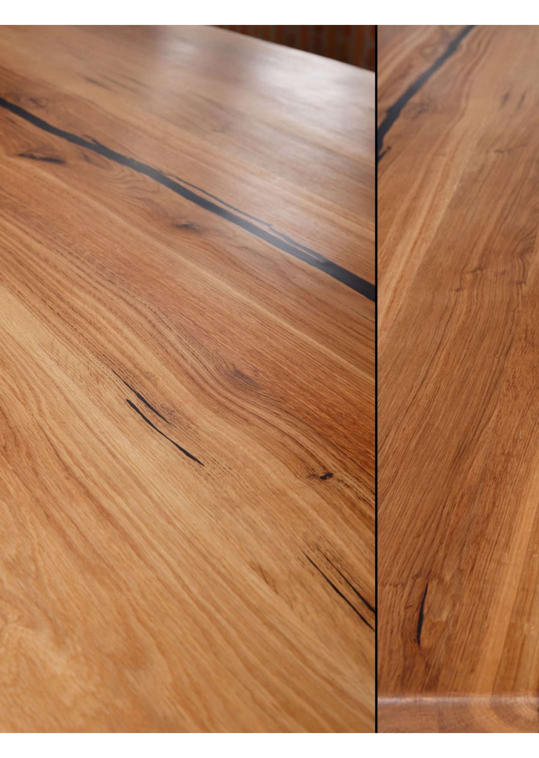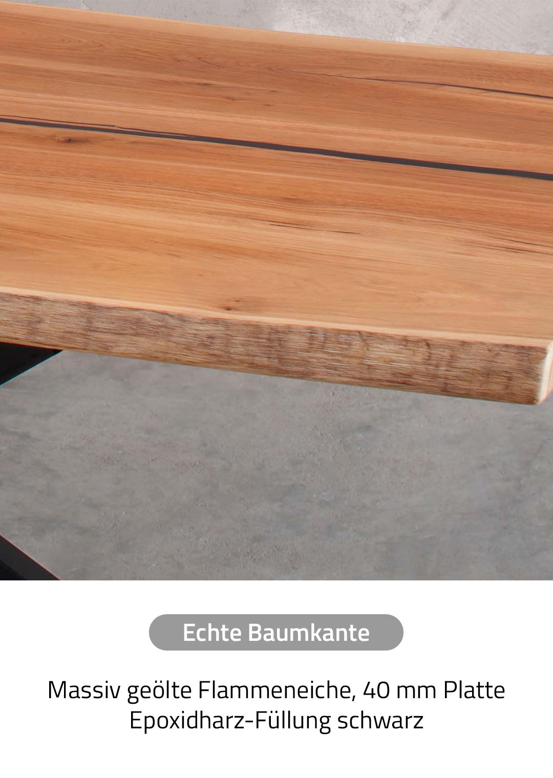 Naturverbunden, modern und einzigartig - Baumkantentisch MALIN!Die perfekte Verschmelzung von zeitloser, natürlicher Schönheit und trendigen Details. Unser Baumkantentisch aus massiver geölter Flammeneiche besticht mit innovativem Stil. Insbesondere die Füllungen aus schwarzem Epoxidharz sind das Augenmerk dieses Tisches und heben die faszinierende Struktur hervor. Die Tischkanten entsprechen der natürlichen Form des Baumes, da diese direkt aus dem Baumstamm geschnitten wurden. Für den benötigten, festen Stand sorgt das X-Gestell aus schwarzem Metall. Unsere Baumkantentische sind dank Ihrer Individualität immer einzigartig in Farbe und Form. Jeder Tisch ist vom natürlichen Wuchs und der Maserung des verwendeten Holzes geprägt und Sie erhalten beim Kauf ein unverwechselbares Unikat mit echter Baumkante. Da es sich hier um ein Naturprodukt handelt, können Astlöcher, kleine Unebenheiten sowie kleine Risse, Fugen, kleine Löcher oder eine unterschiedliche Farbgebung auftreten; welche jedoch keine Fehler darstellen sondern vielmehr den individuellen Charakter des Echtholzes unterstreichen. Die genannten Maßangaben können aufgrund der asymmetrischen Formgebung etwas variieren.Epoxid-Harz-Füllung: Massivholztische mit Epoxid-Harz-Füllung erfreuen sich immer größerer Beliebtheit. Das liegt vor allem daran, dass durch die neuartige Gestaltung jedem Tisch einen einzigartigen Charakter verliehen wird. Die Tische werden in liebevoller Handarbeit gefertigt, wodurch die Individualität geschaffen wird. So entsteht durch das Einarbeiten des Harzes eine individuelle Oberfläche auf der Tischplatte mit einem außergewöhnlichen Design. Die Stellen der Einarbeitung des Epoxid-Harzes können variieren, was jeden Tisch zu einem einmaligem Einzelstück macht.Flammeneiche geölt: Die Flammeneiche erhält ihren Namen durch einen einzigartigen Verarbeitungsprozess von massivem Eicheholz. Das Material wird unter kontrollierten Bedingungen einer Dampfbehandlung unterzogen. So erhält das Holz einen wärmeren Farbton, der je nach Intensität der Behandlung variieren kann - die natürliche Maserung bleibt dabei erhalten. Durch den Dämpfprozess kann die Spannung im Holz verringert werden, was zu einer möglichen verbesserten Stabilität beiträgt. Die Ölung betont die natürliche Schönheit des Holzes und hebt die Maserung hervor. Die Holz-Maserung kann mit der Zeit je nach Lichteinstrahlung intensiver sichtbar werden und bräunlich schimmern. Massivholzmöbel sollten daher nicht direkter Sonneneinstrahlung ausgesetzt werden.Bestellen Sie gleich Ihren neuen Baumkantentisch oder lassen Sie sich von unseren Einrichtungsexperten beraten.Wir freuen uns auf Sie!Produktdetails: |