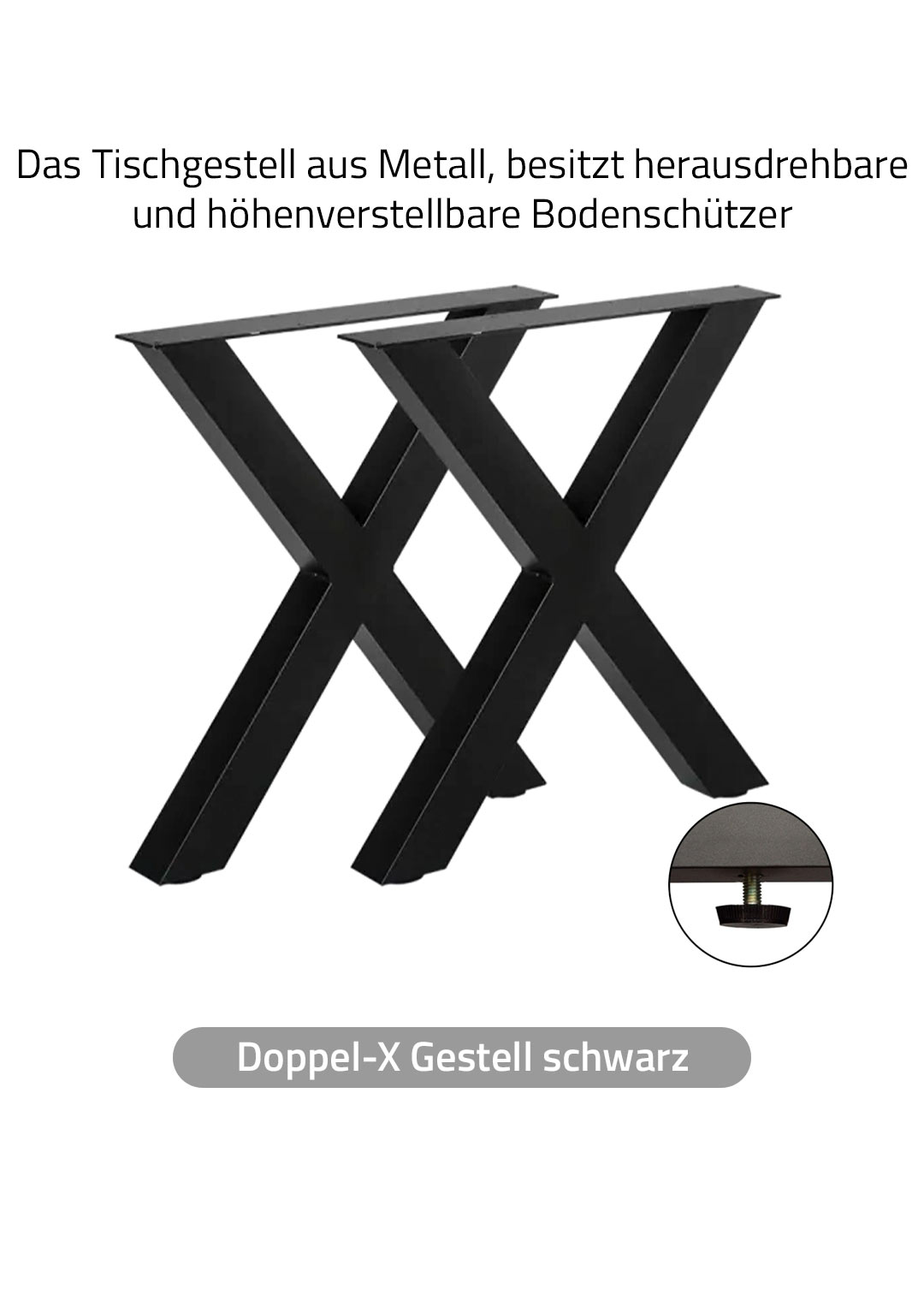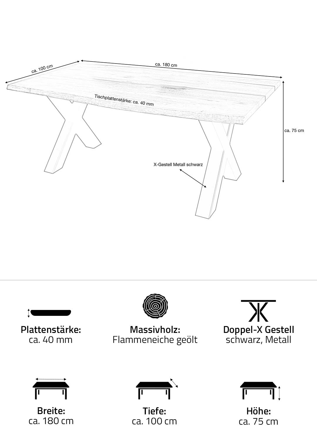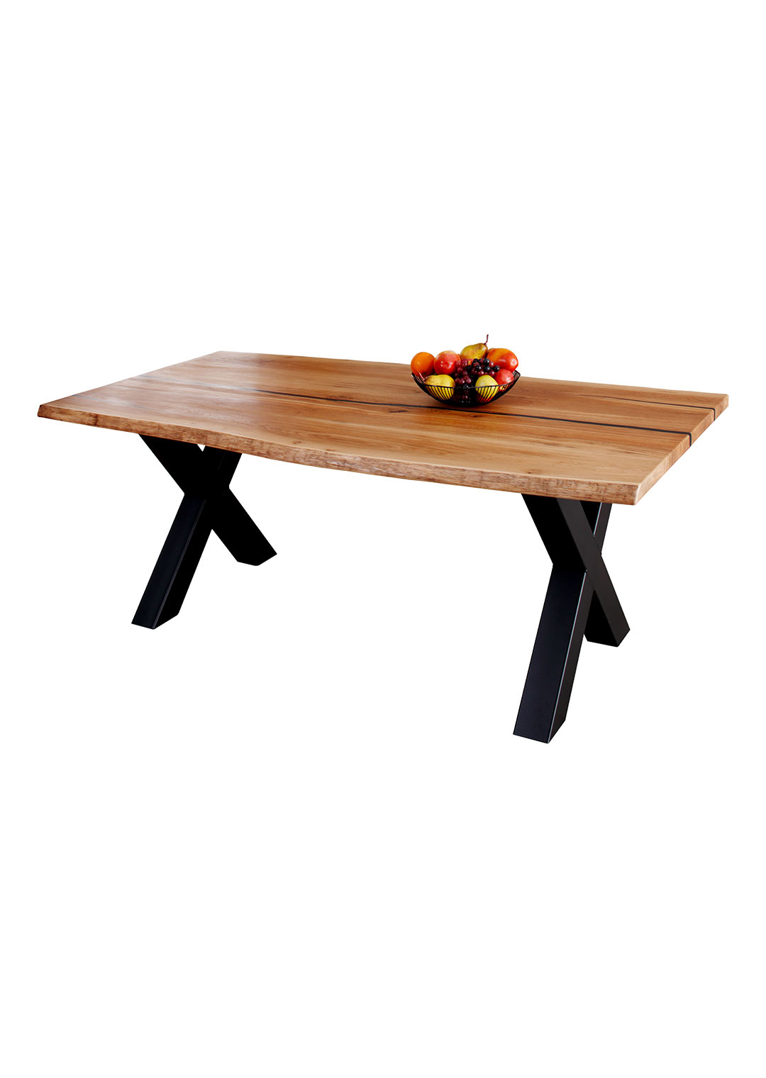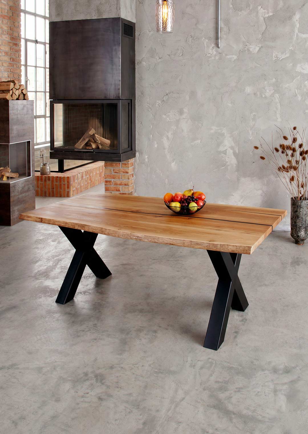 | Eigenschaften | Tischbeine X-Gestell, Tischplatte geölt mit echter Baumkante, Naturprodukt mit Farbabweichungen und Unebenheiten |