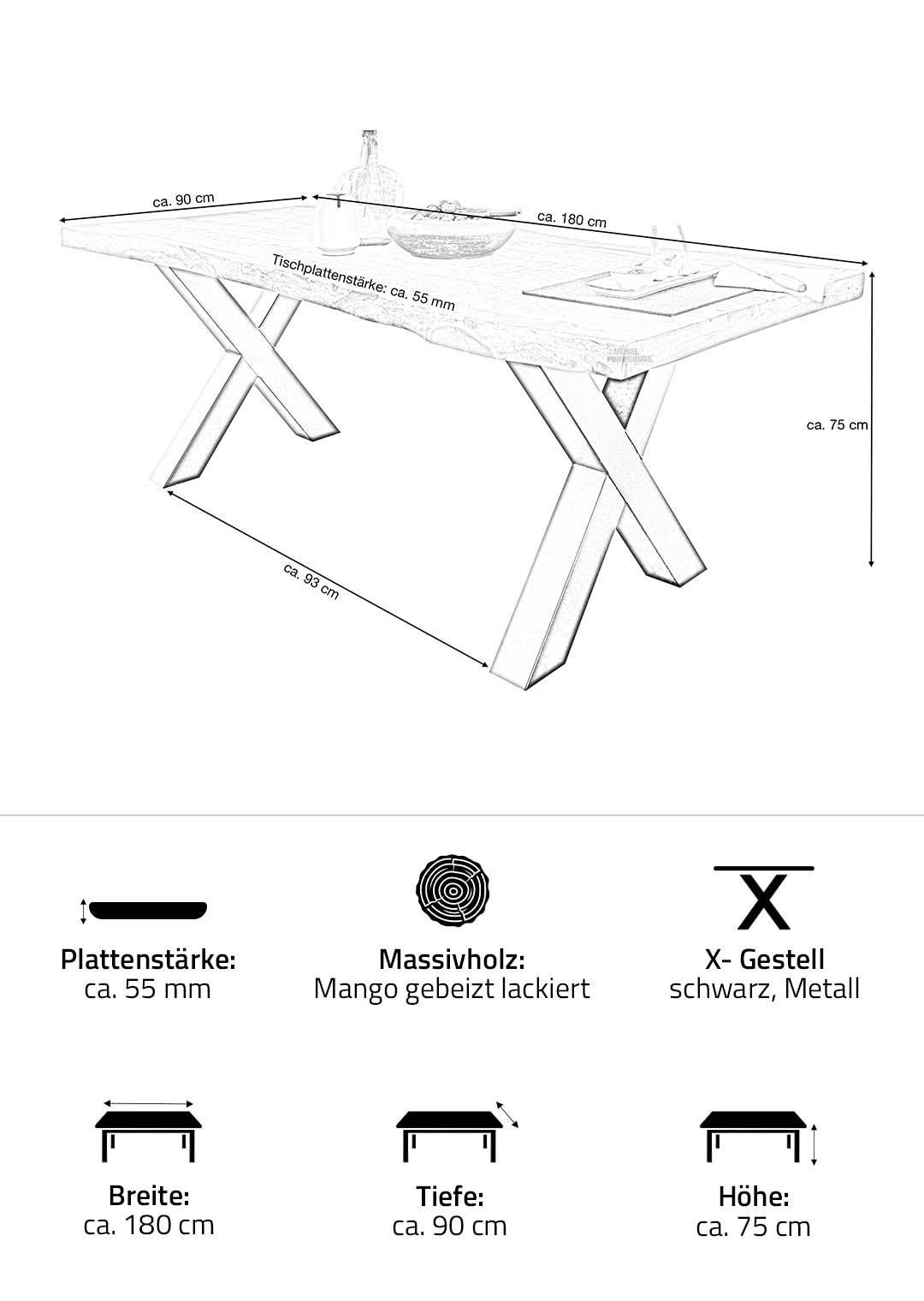 | Bestandteile | 1 Tischplatte in Mango Massivholz gebeizt und lackiert, 2 X-Gestelle in schwarz Metall |