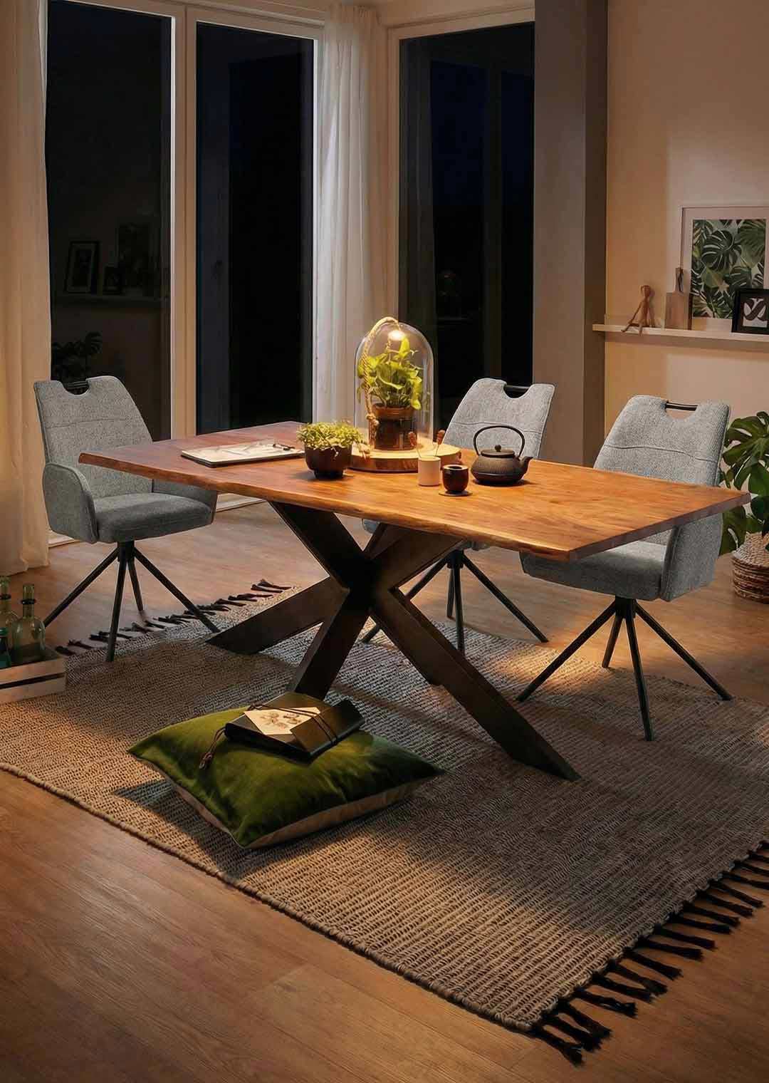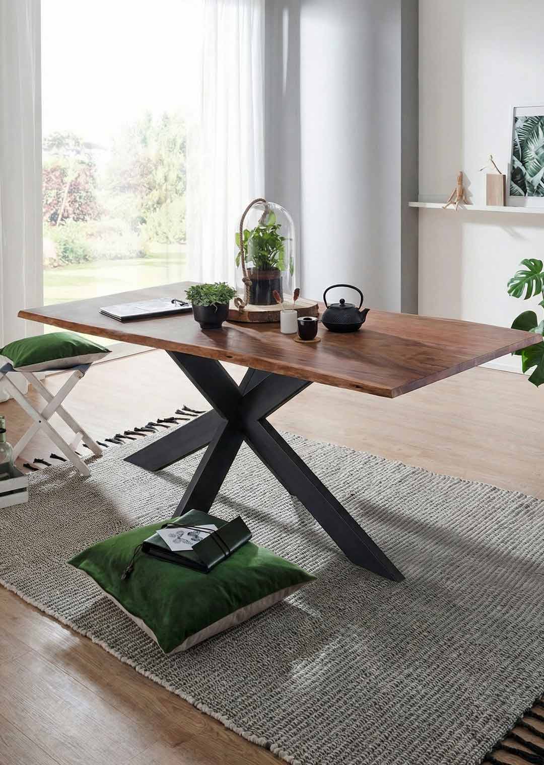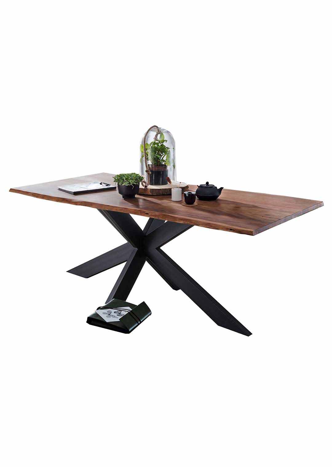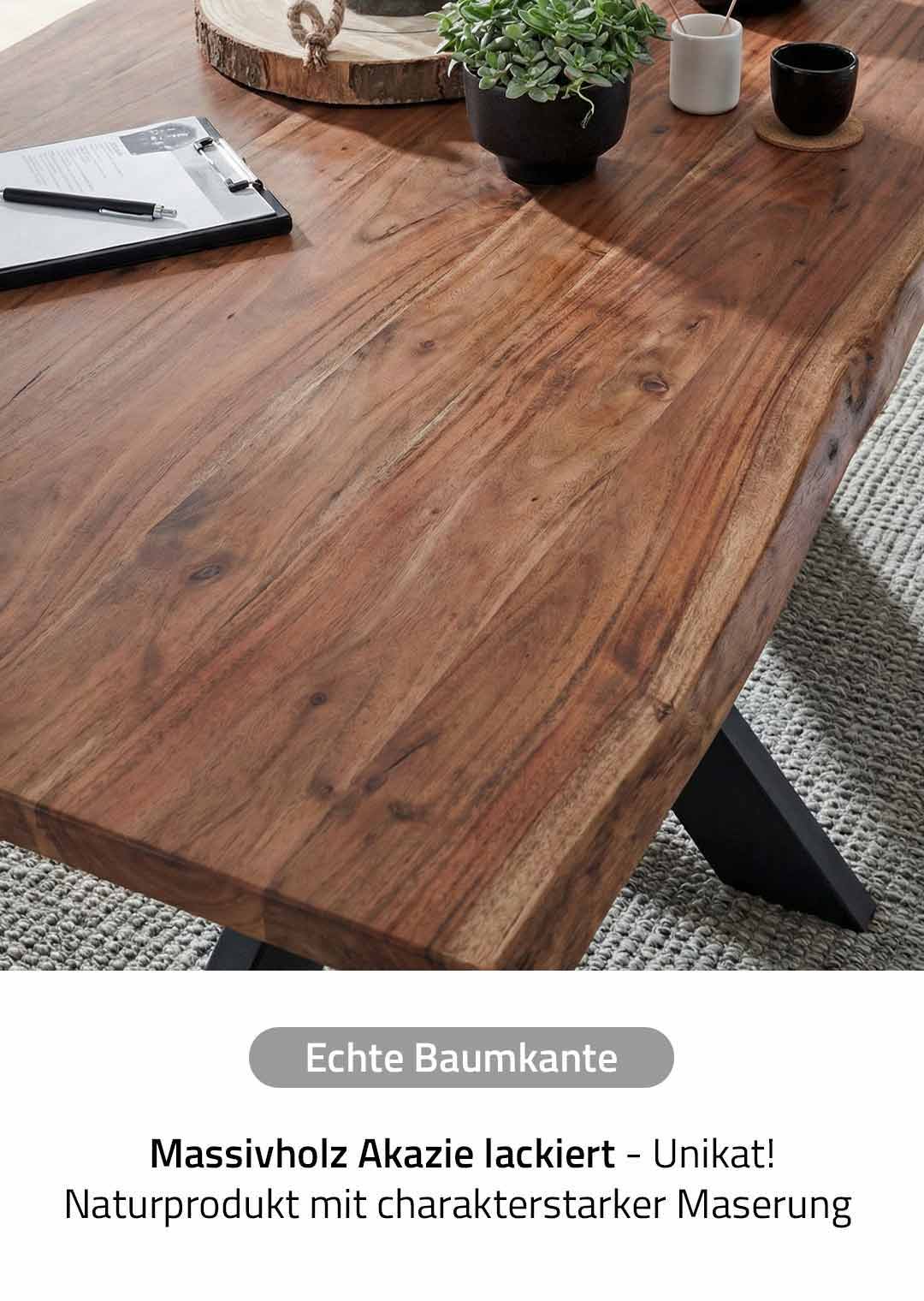 Der Esstisch TIMY mit kernigem Look und powervoller Note!Eine Kombination aus Natürlichkeit und moderner Raffinesse - so lässt sich dieser Esstisch aus massivem lackierten Akazienholz und Metall beschreiben. Die einzigartige Maserung verleiht dem Design einen herben Charakter, welcher die natürliche Herkunft der Tischplatte betont. So entsteht ein gemütliches Flair. Für einen stabilen Stand sorgen die schwarzen Standbeine und erzeugen gleichzeitig einen starken Kontrast. Die angebrachten Metallstreben fließen im Mittelpunkt zusammen und bilden das aktuelle Spider-Gestell.Die Tischplatte überzeugt mit einer Stärke von ca. 26 mm und bietet mit einer Fläche von ca. 200 x 100 cm genügend Platz für bis zu 6 Personen. Durch die Größe steht ausgelassenen Feiern nichts mehr im Wege und auch auf unerwartete Gäste sind Sie so vorbereitet. Unsere Baumkantentische sind dank Ihrer Individualität immer einzigartig in Farbe und Form. Jeder Tisch ist vom natürlichen Wuchs und der Maserung des verwendeten Holzes geprägt und Sie erhalten beim Kauf ein unverwechselbares Unikat mit echter Baumkante. Da es sich hier um ein Naturprodukt handelt, können Astlöcher, kleine Unebenheiten sowie kleine Risse, Fugen, kleine Löcher oder eine unterschiedliche Farbgebung auftreten; welche jedoch keine Fehler darstellen, sondern vielmehr den individuellen Charakter des Echtholzes unterstreichen. Die genannten Maßangaben können aufgrund der asymmetrischen Formgebung etwas variieren.Akazien Holz: Das lackierte Akazienholz besticht mit einer eleganten Maserung und der edle Look mit wunderschönen natürlichen Farbtönen wertet jeden Wohnraum auf. In Sachen Festigkeit und Härte punktet das Akazienholz in jeder Hinsicht - Es ist enorm Widerstandsfähig und zugleich biegsam wodurch es sich wunderbar zu einzigartigen Möbeln verarbeiten lässt. Mit einer lackierten Oberfläche entscheiden Sie sich zudem für eine sehr pflegeleichte Oberfläche. Durch die Lackierung erhält die Tischplatte einen höheren Schutz und das Holz bekommt etwas mehr Tiefe. Generell ist dieser Esszimmertisch unempfindlicher gegenüber Verschmutzungen wie ein geölter Holztisch.Bestellen Sie jetzt Ihren neuen Esstisch online oder besuchen Sie uns in einer unseren Filialen und lassen sich vor Ort beraten.