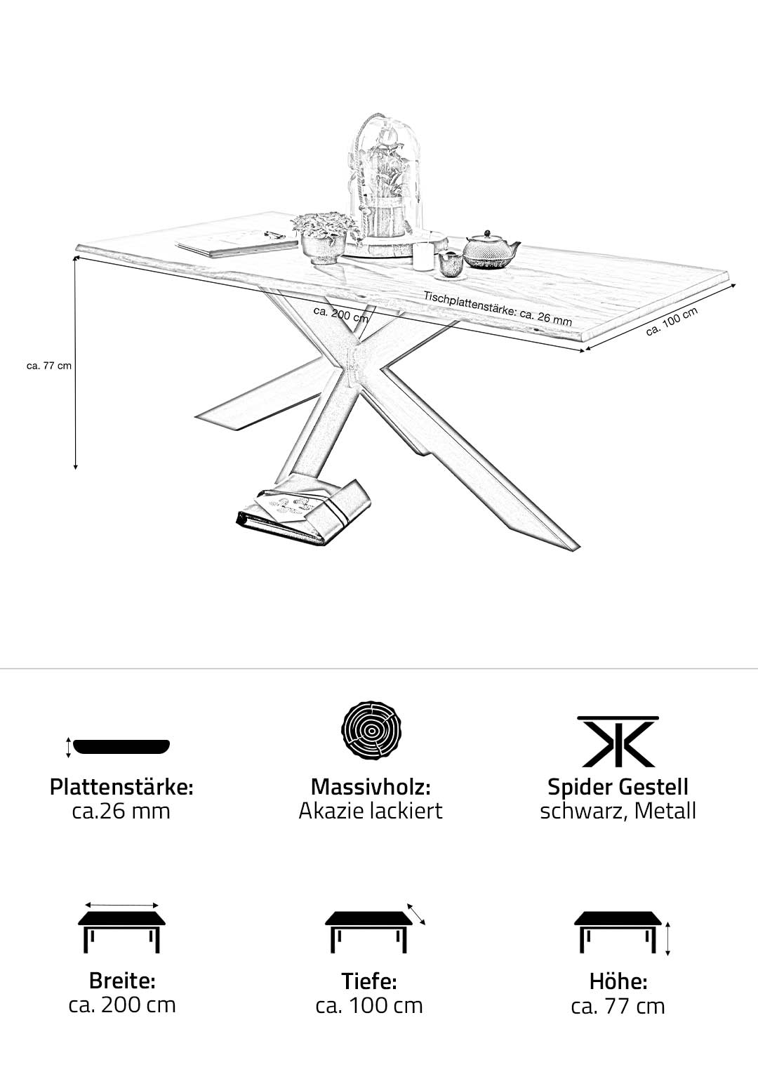| Bestandteile | 1 Tischplatte Akazie lackiert Massivholz ca. 26 mm Stärke, 1 Spider-Gestell in Metall schwarz |