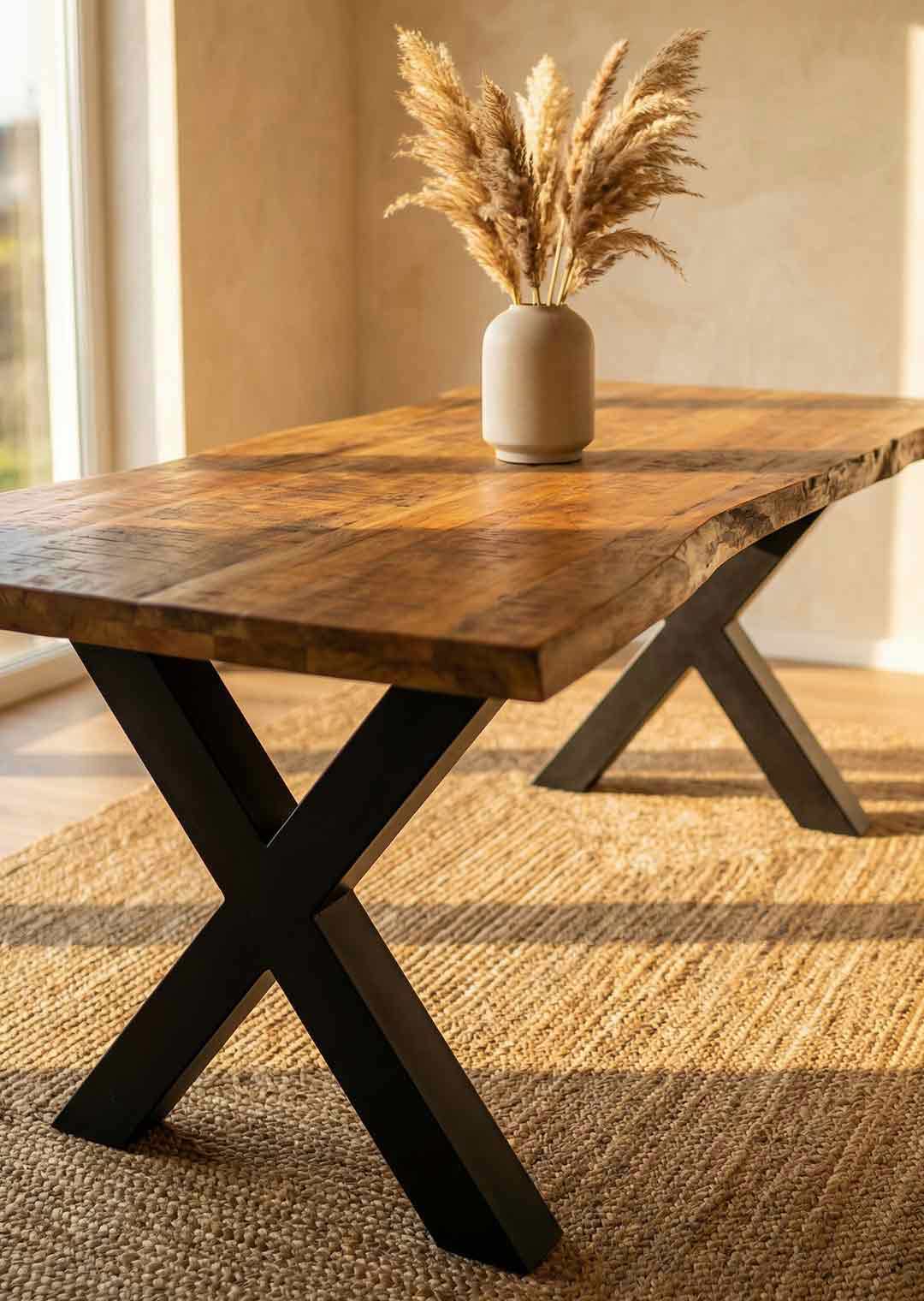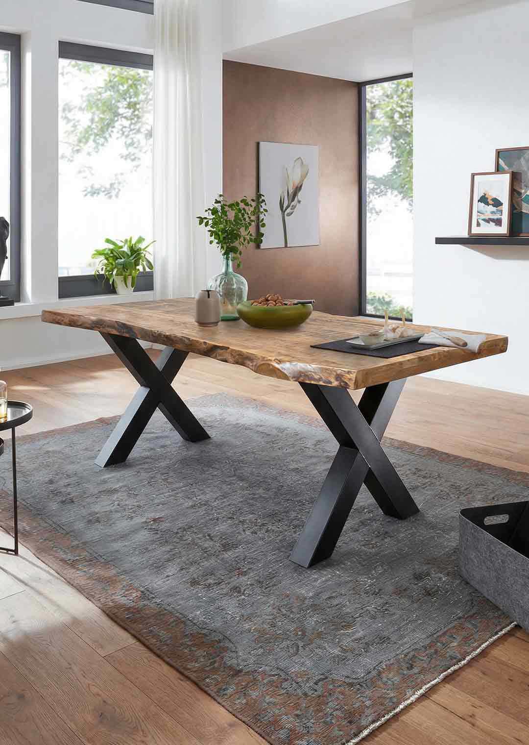 Unser stilsicherer Baumkantentisch aus massivem Mangoholz überzeugt durch eine perfekte Kombination aus wärme bringendem Naturholz und kühlendem, schwarzem Metall. Besonders hervorzuheben sind die Tischkanten unseres Baumkantentischs TOMASO, die der natürlichen Form des Baumes entsprechen und direkt aus dem Baumstamm geschnitten wurden. Das X-förmige schwarz lackierte Gestell sorgt für einen stabilen Stand und verleiht dem Tisch eine moderne Komponente.