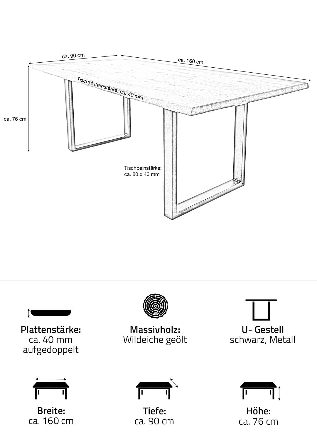| Bestandteile | 1 Tischplatte in Wildeiche Massivholz geölt mit Baumkanten Optik, U-Gestell aus schwarzem, pulverbeschichteten Metall |