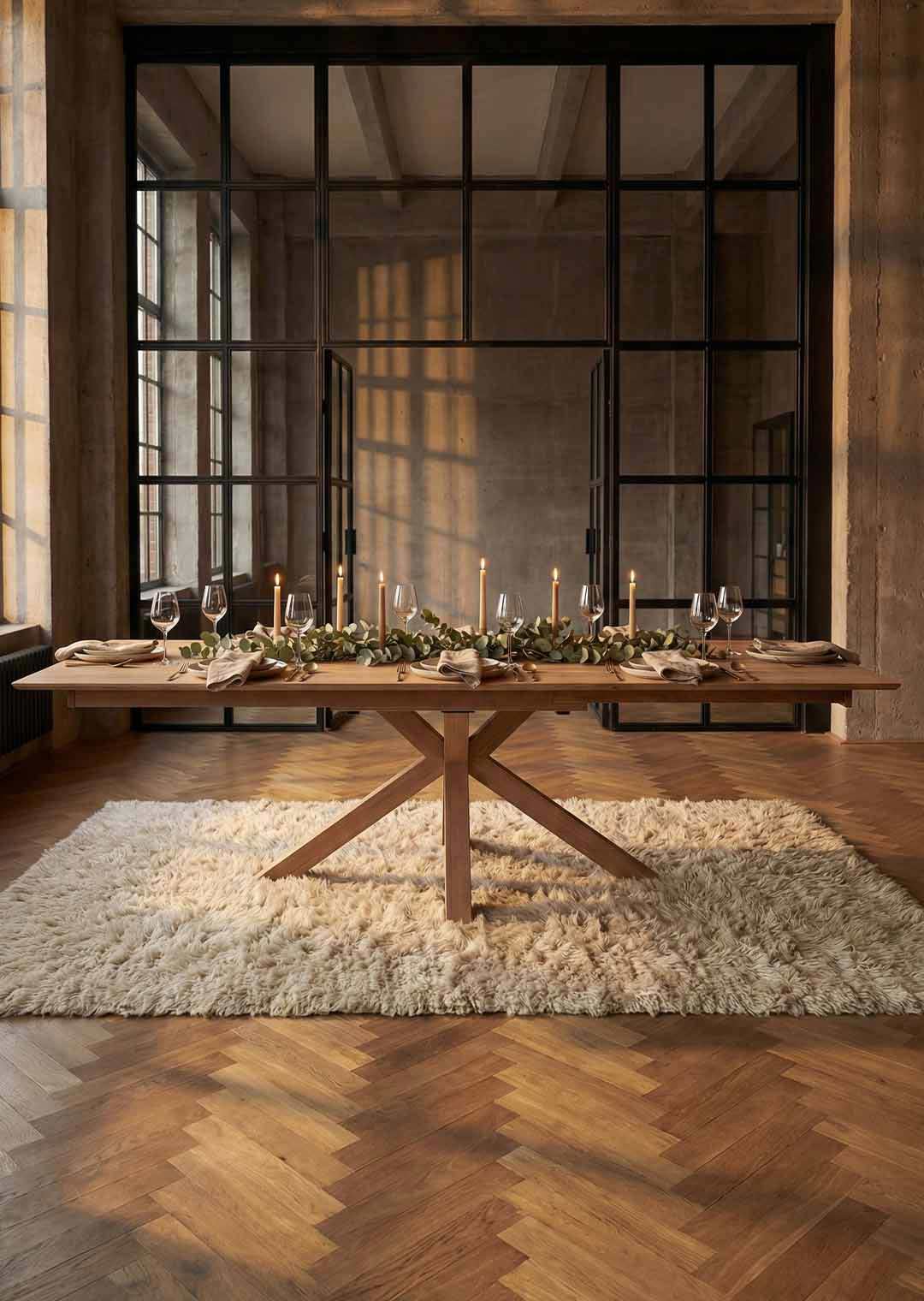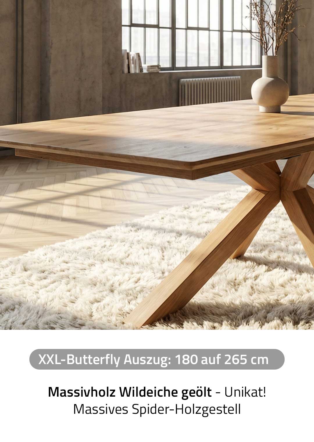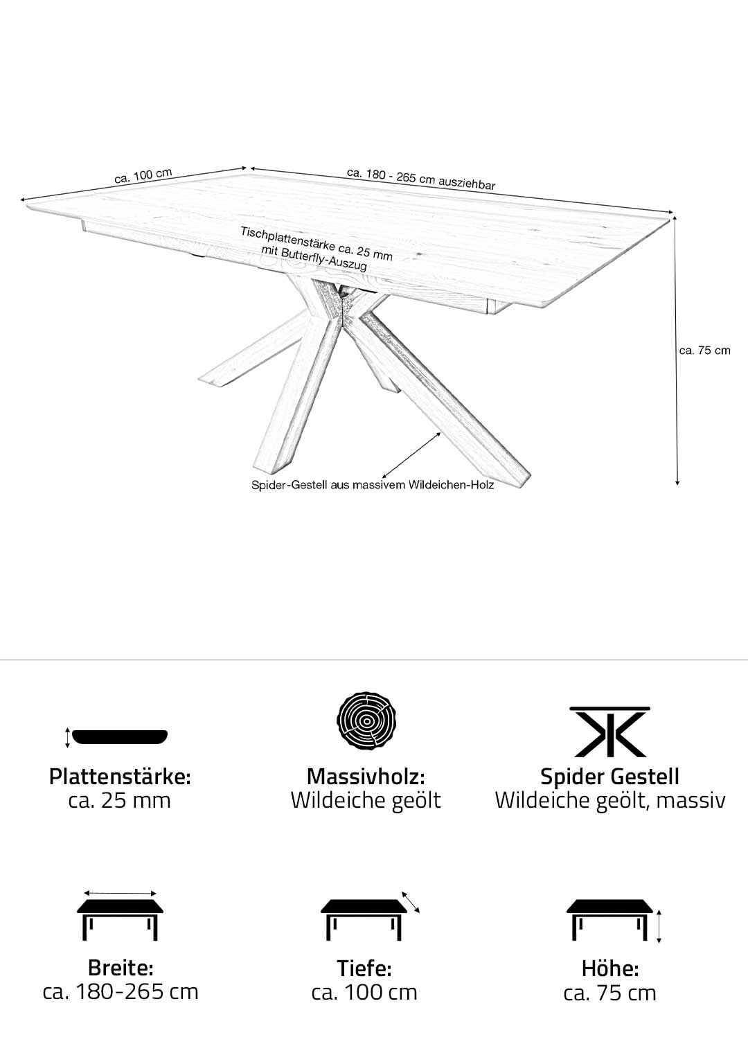 | Bestandteile | 1 Tischplatte (Butterfly-Auszug) Wildeiche Massivholz ca. 25 mm Stärke, 1 Spider-Gestell aus massiver Wildeiche geölt |